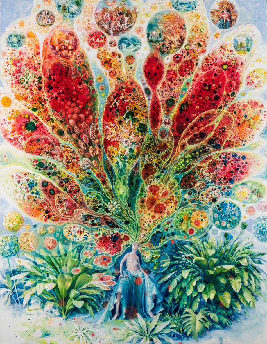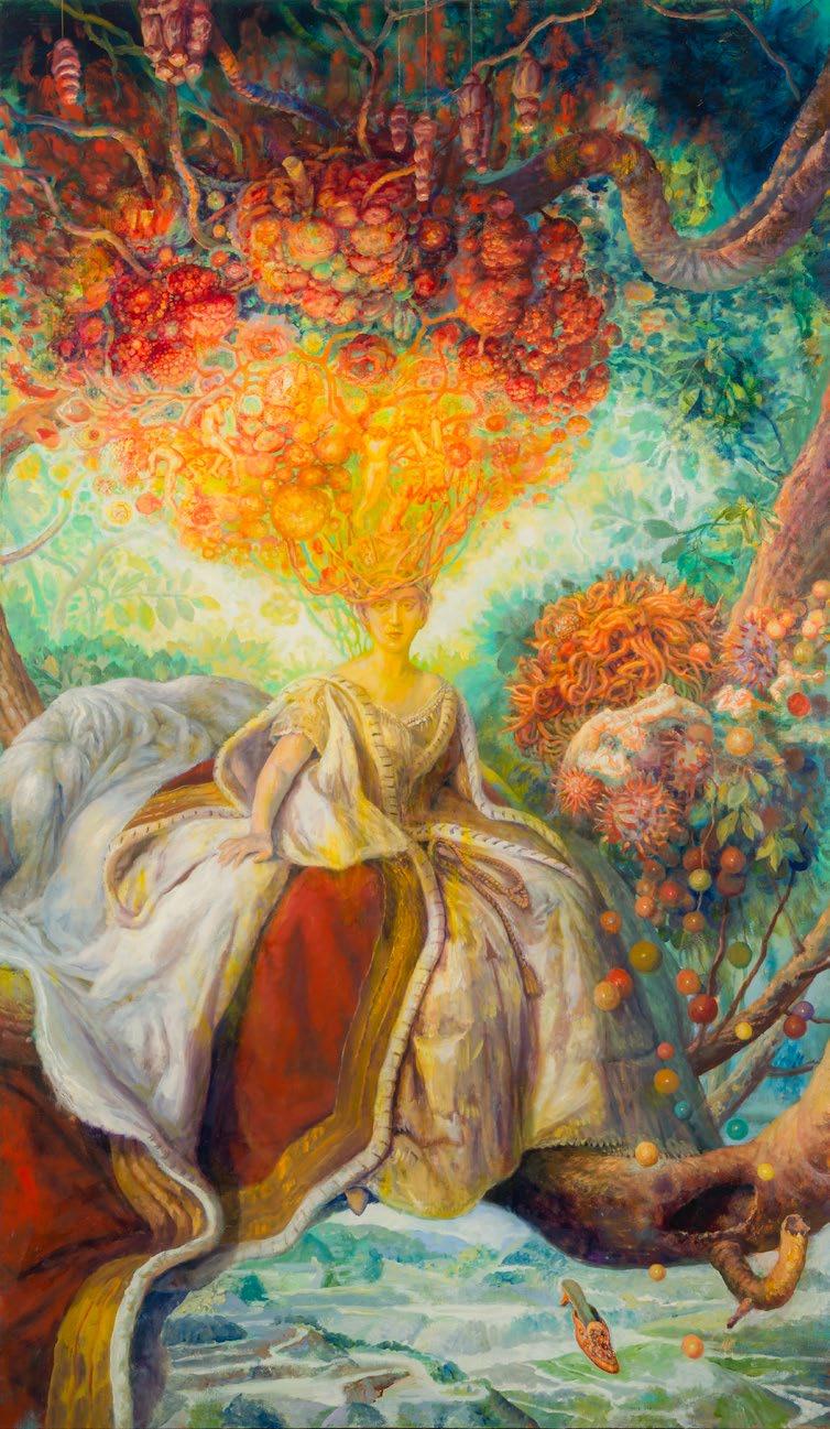 Familiar are the artfully staged, surreal, and psychological worlds inhabited by her female protagonists. Masterful confections of allegory and history painting delight and bewilder with deliberate and symbolic nods to the canons of art history: Northern Renaissance, Hieronymus Bosch, Baroque, Rococo, and Hudson River School.