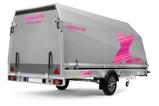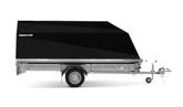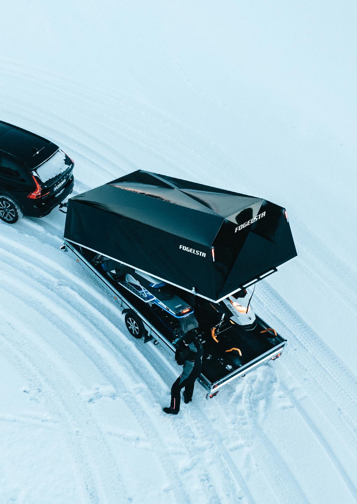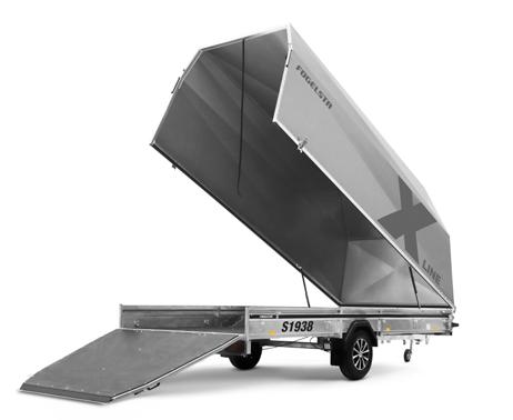 En extrautrustad serie släpvagnar för dig som kör snöskoter. Kåpans utformning är designad med en smal takyta för att undvika ansamling av snö. Släpvagnarna är utrustade med LED-belysning, in- och utvändiga bindöglor, frontskydd, stenskottsfilm, skruvtipp med sexkantsfäste och dubbade vinterhjul på aluminiumfälg. Vagnen på bilden kan vara extrautrustad.