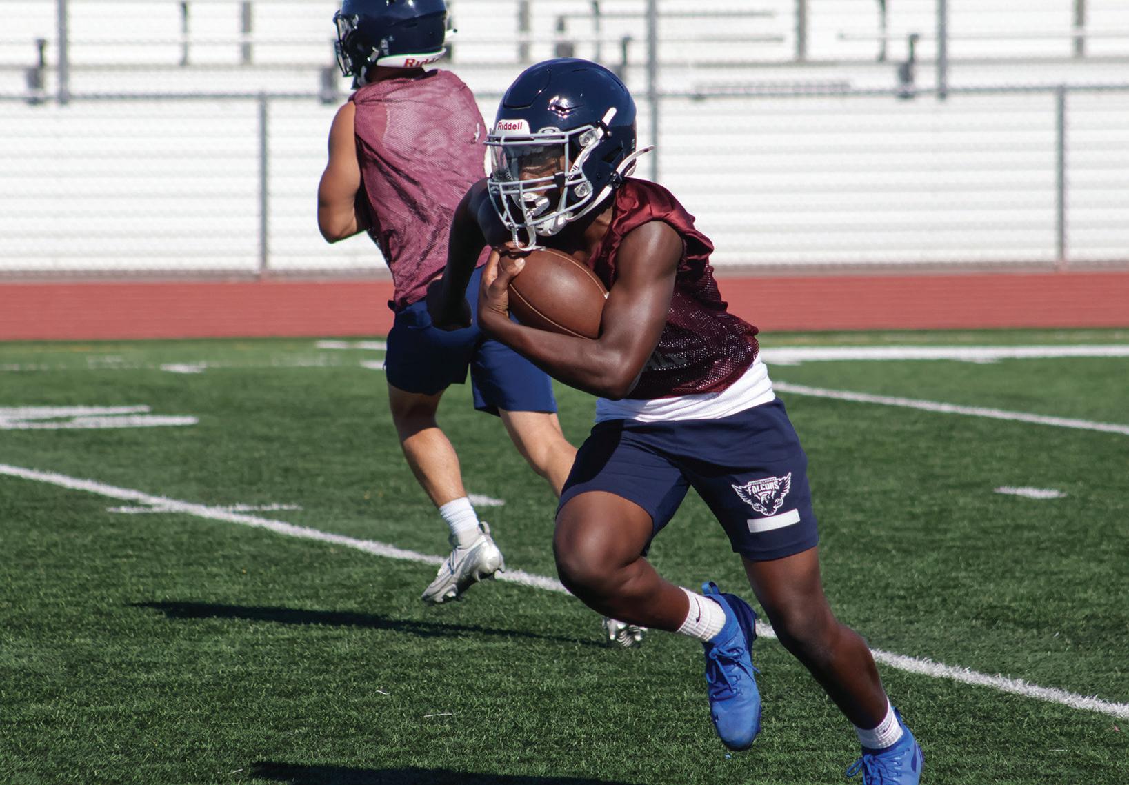 Senior quarterback Tah’kai Edwards runs with the ball during the team’s camp practice.