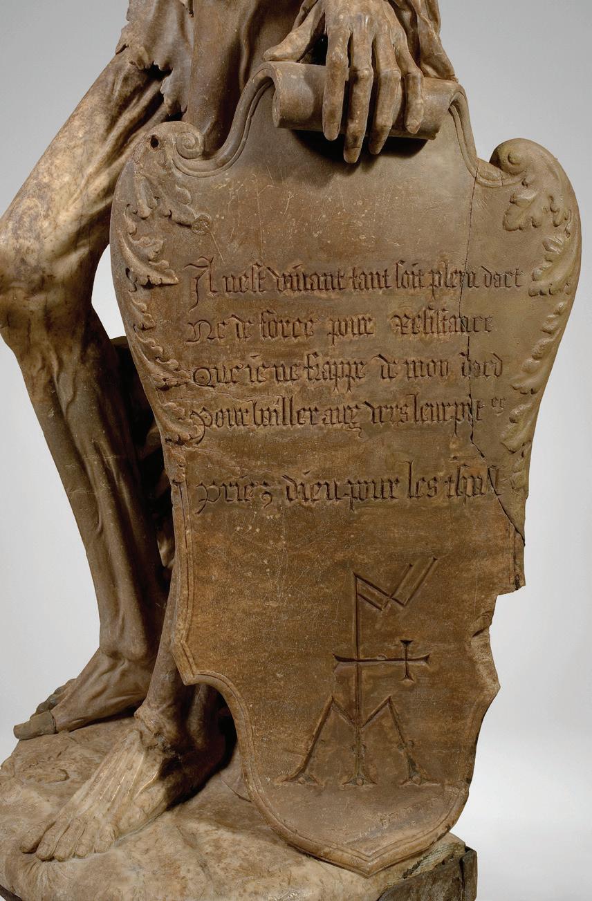 In her essay in this volume (pp. 74–87), Jessica Barker explains the reasons for the success of alabaster in the construction of funerary monuments in Europe between the 14th and 17th centuries. Practical considerations, such as accessibility, made it a more than satisfactory substitute for the prestigious Italian marble, which was used in France for royal tombs from the last quarter of the 13th century. It enabled the elite to affirm their social status, which gave them the means and legitimacy to mark the place of their burial in a material that was rarer and more expensive to extract and transport than stone. For the princes in whose lands alabaster deposits were located, it was also a matter of favouring local resources. But the success of alabaster, especially for tombs, is also explained by its unsettling relationship with flesh through its colour and warmth to the touch, and with decay through its fragility – which makes it a particularly suitable material for this purpose from a symbolic point of view.