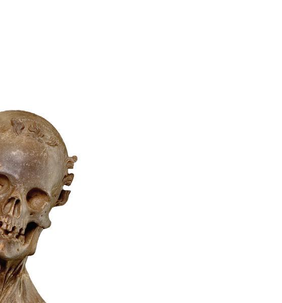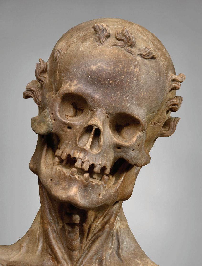 eye sockets, the toothless grin, the vertebrae and shreds of skin – macabre as a representation but in no way realistic. It is important on the other hand not to interpret the piece as stemming solely from medieval tradition, a reflection of the profound upheaval caused to European society by the great pandemics after the 14th century. The 16th century pursued the tradition of transis and images of death, adding its own quest for naturalism and precision. Although this figure’s manner of brandishing the lance owes much to Italian Triumphs of Death, our skeleton presents a perfect Renaissance contrapposto