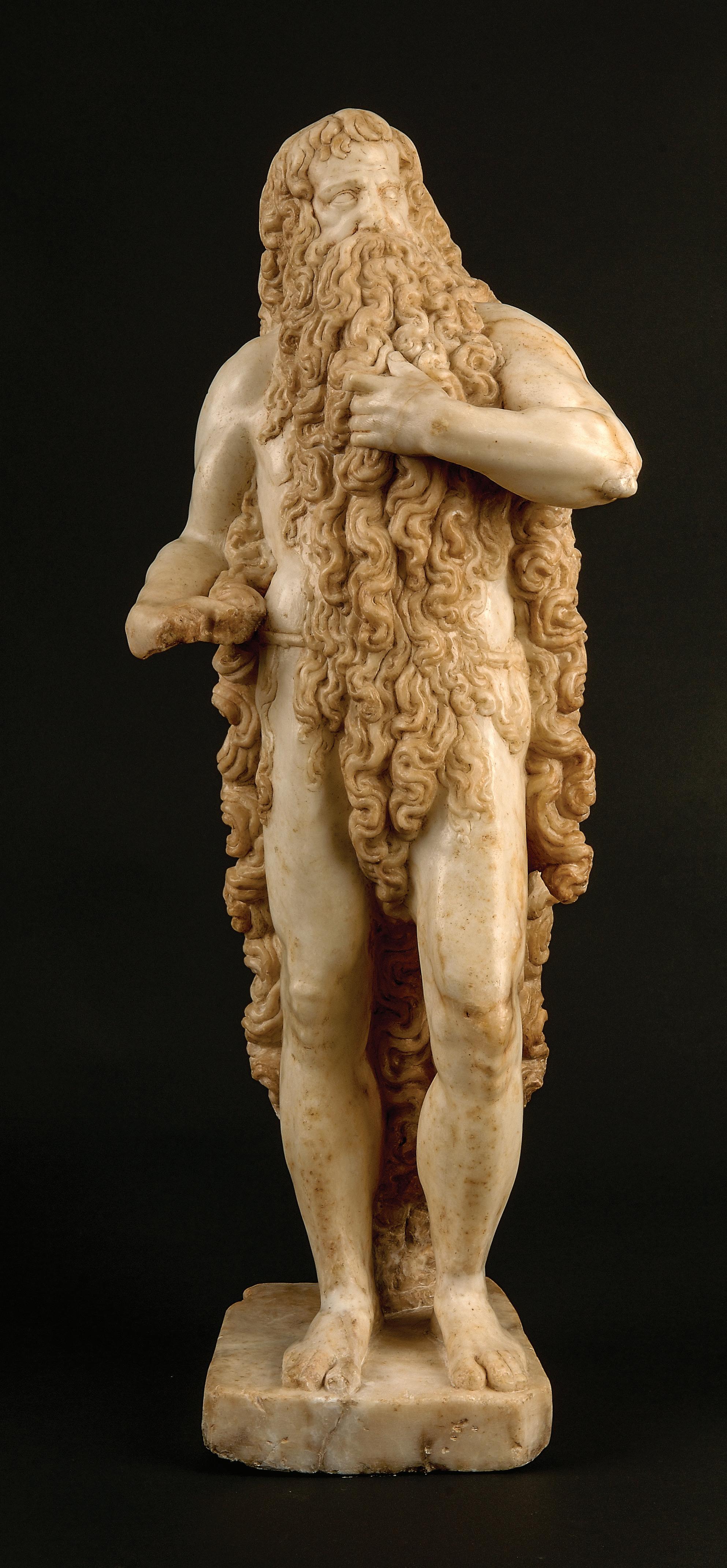 The Egyptian anchorite saint (d. c. 400) appears in these two sculptures as a hermit who renounced worldly goods on his path to attaining holiness and devoted himself to prayer and penance. The medieval devotion to St Onuphrius grew in the 16th century with the aim of emphasizing the importance of penance, as opposed to its denial by the Reformation. His popularity increased when he was invoked against sudden death without confession. The saint’s physical appearance is especially striking: as the hagiography describes, he covered his naked body with his beard and hair, which he never cut. These two sculptures are an excellent example of how his appearance was adapted to the plastic language of each period. They do not portray an ascetic’s body, as in the Middle Ages, but adhere to the Renaissance anatomical canon and, in turn, reflect the different times at which they were made: the one by Damián Forment is slender and elegant, while that by Anchieta is characterized by its muscularity, following the new artistic sensibility that arose in Rome under the influence of Michelangelo. Neither is carved on the back, as the original point of view was frontal.