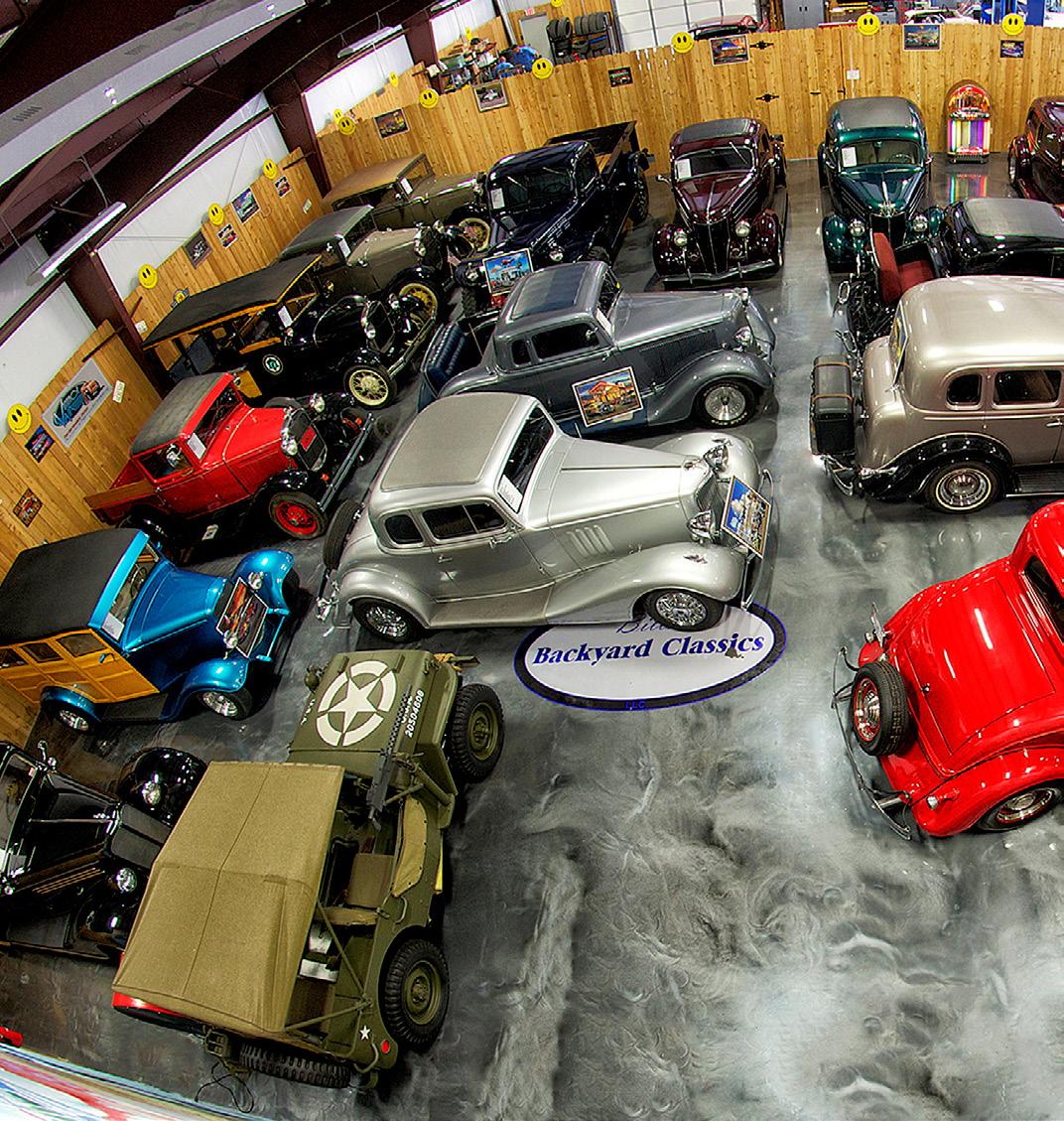 THE FRONT SHOWROOM FEATURES OLDER MODEL VEHICLES LIKE A 1928 “PADDY WAGON,” CARS FROM THROUGHOUT THE 1930S, AND EVEN A FULLY-RESTORED 1945 WILLYS U.S. ARMY JEEP COMPLETE WITH MACHINE GUN!