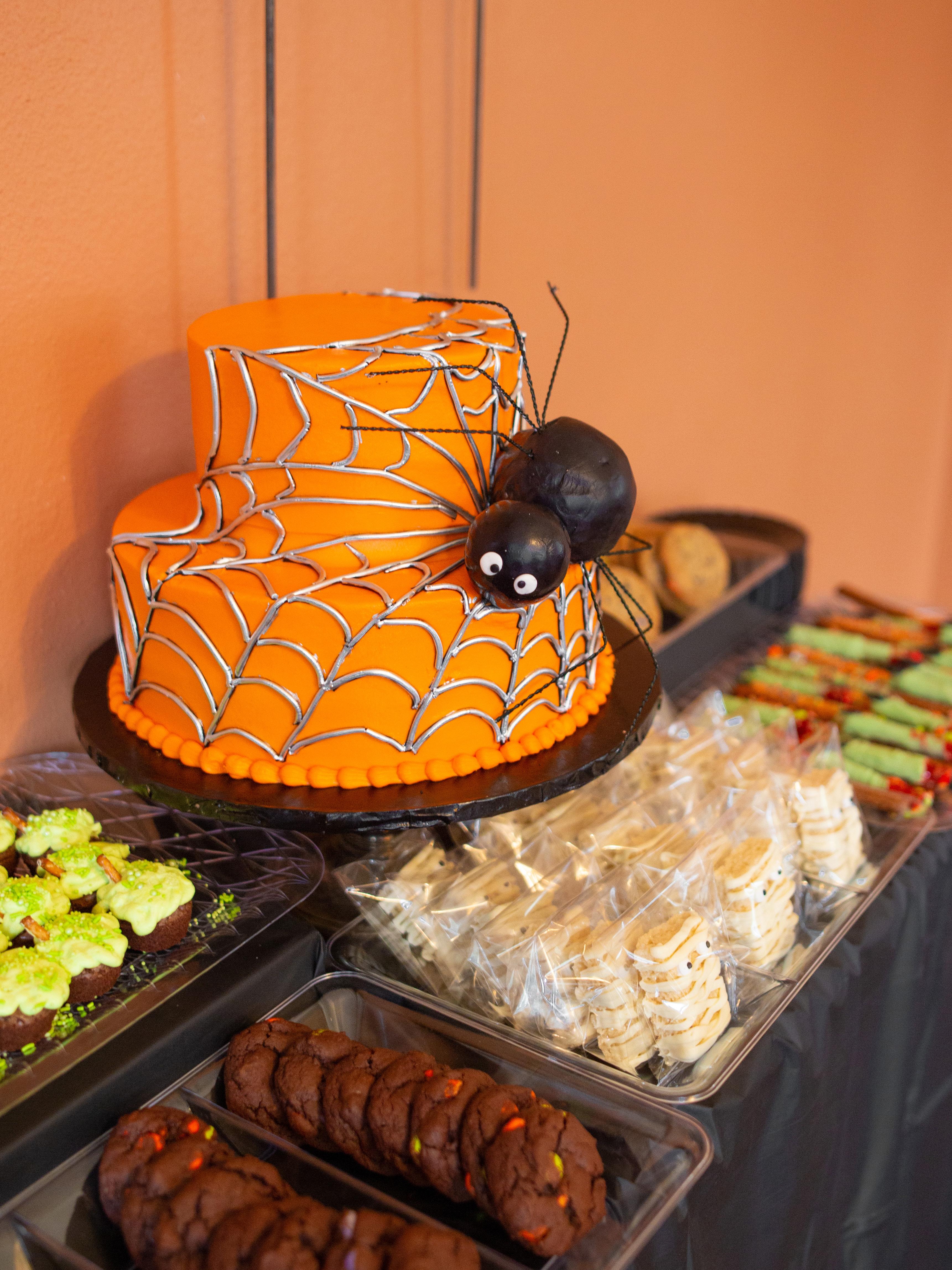 No matter what you are serving, a side of Halloween is always a treat! Pictured here a Halloween themed dessert bar created by Logan Sullivan. Fun items: rice Krispie treat ghosts, pretzel fingers, and mini-brownie witches’ brew. Spider cake is by Who Made the Cake!