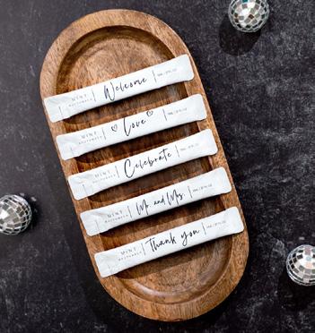 These single-use packets of mouthwash offer convenience and hygiene, ensuring fresh breath is always within reach for your guests. There are several luxury options, with phrases like “Mr. and Mrs.,” “Celebrate,” “Welcome,” “Thanks,” and “Love” to add a personal touch to your wedding favors or restroom amenities. The mouthwash is a clear liquid that won’t stain clothing, providing both freshness and peace of mind for your guests. (gomouthwash.com)