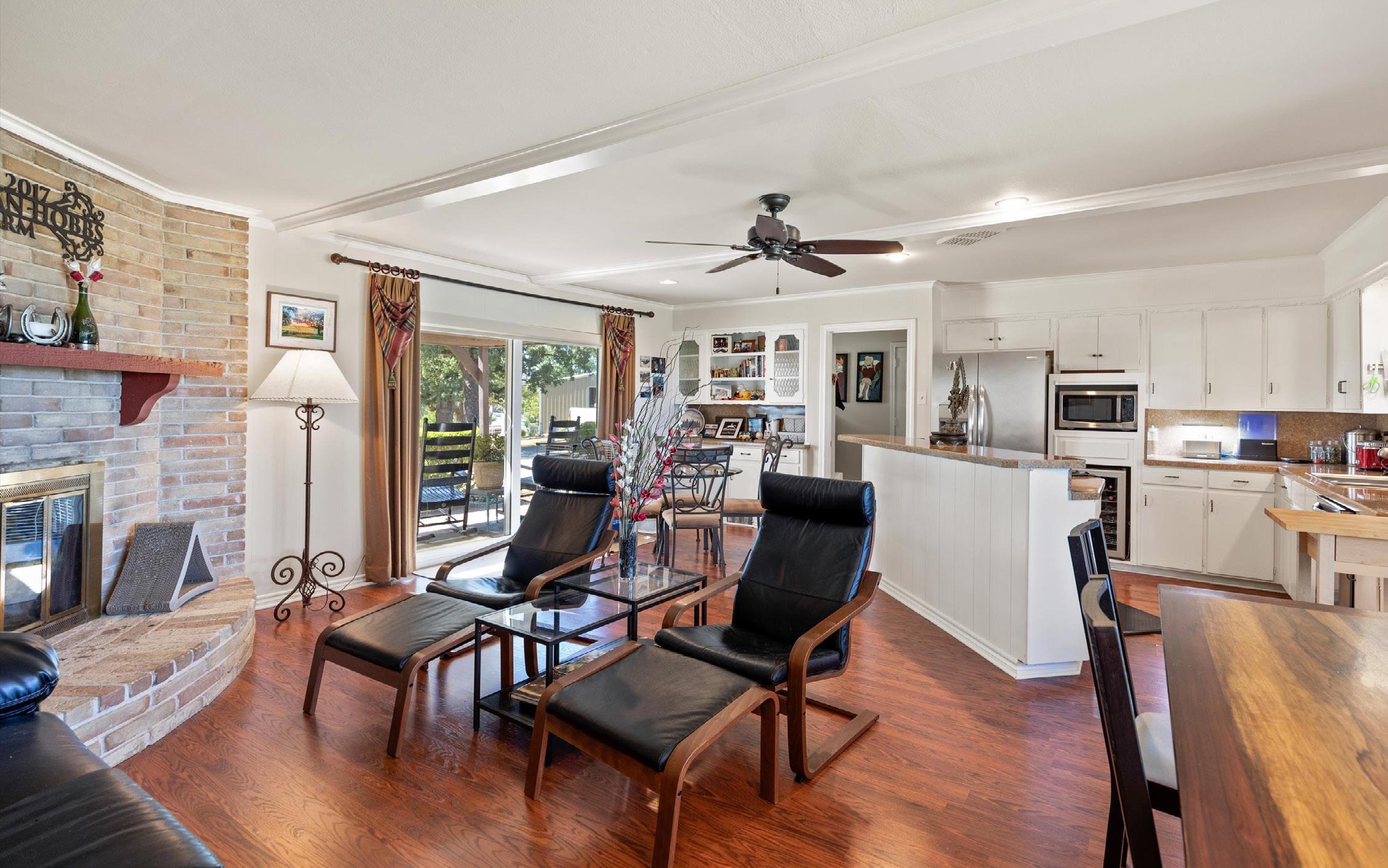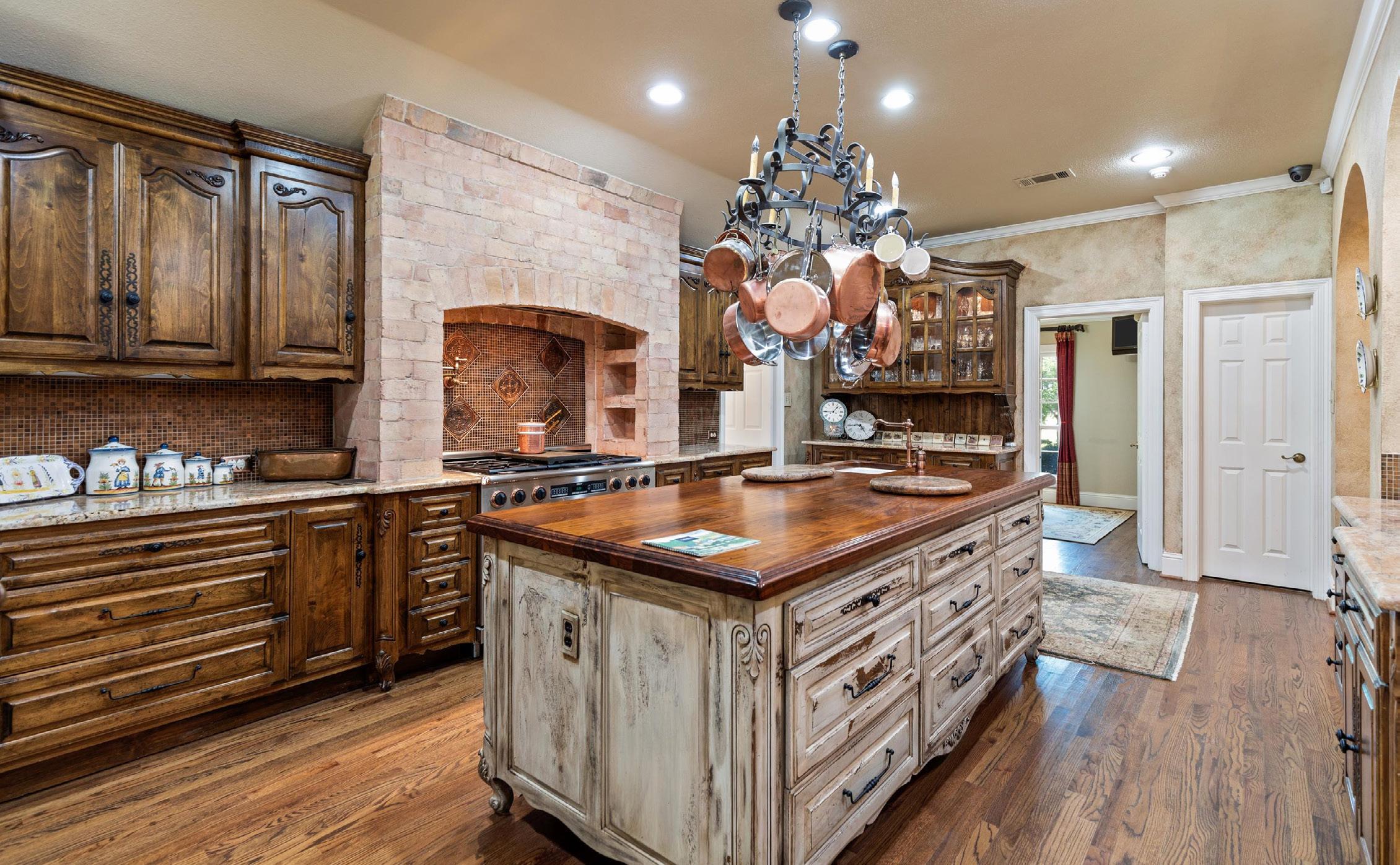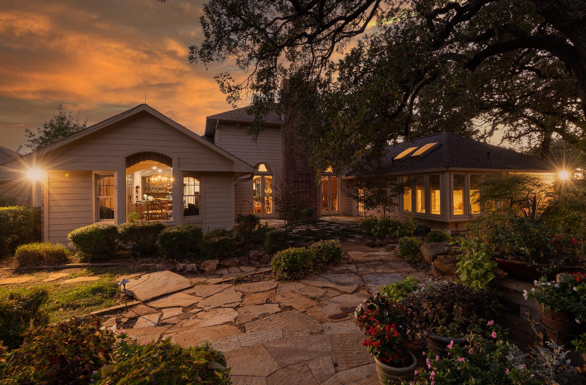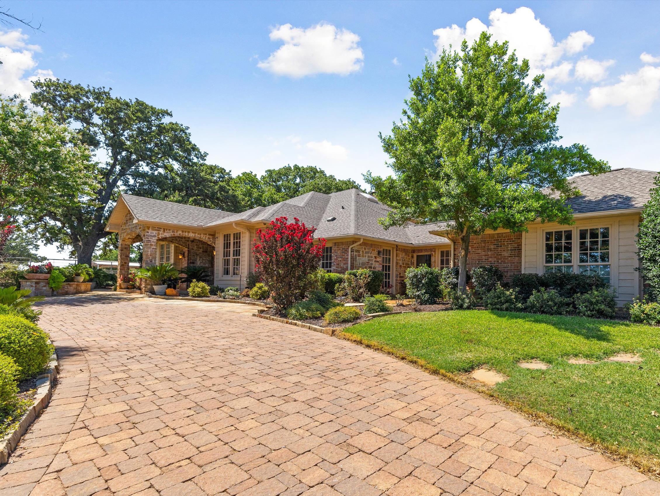 home is surrounded by lush landscaping and is complimented by an inviting pergola, outdoor grill and fire pit — just the place to gather on crisp Texas nights.
