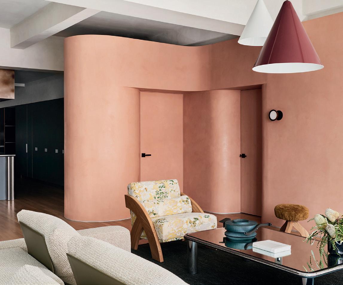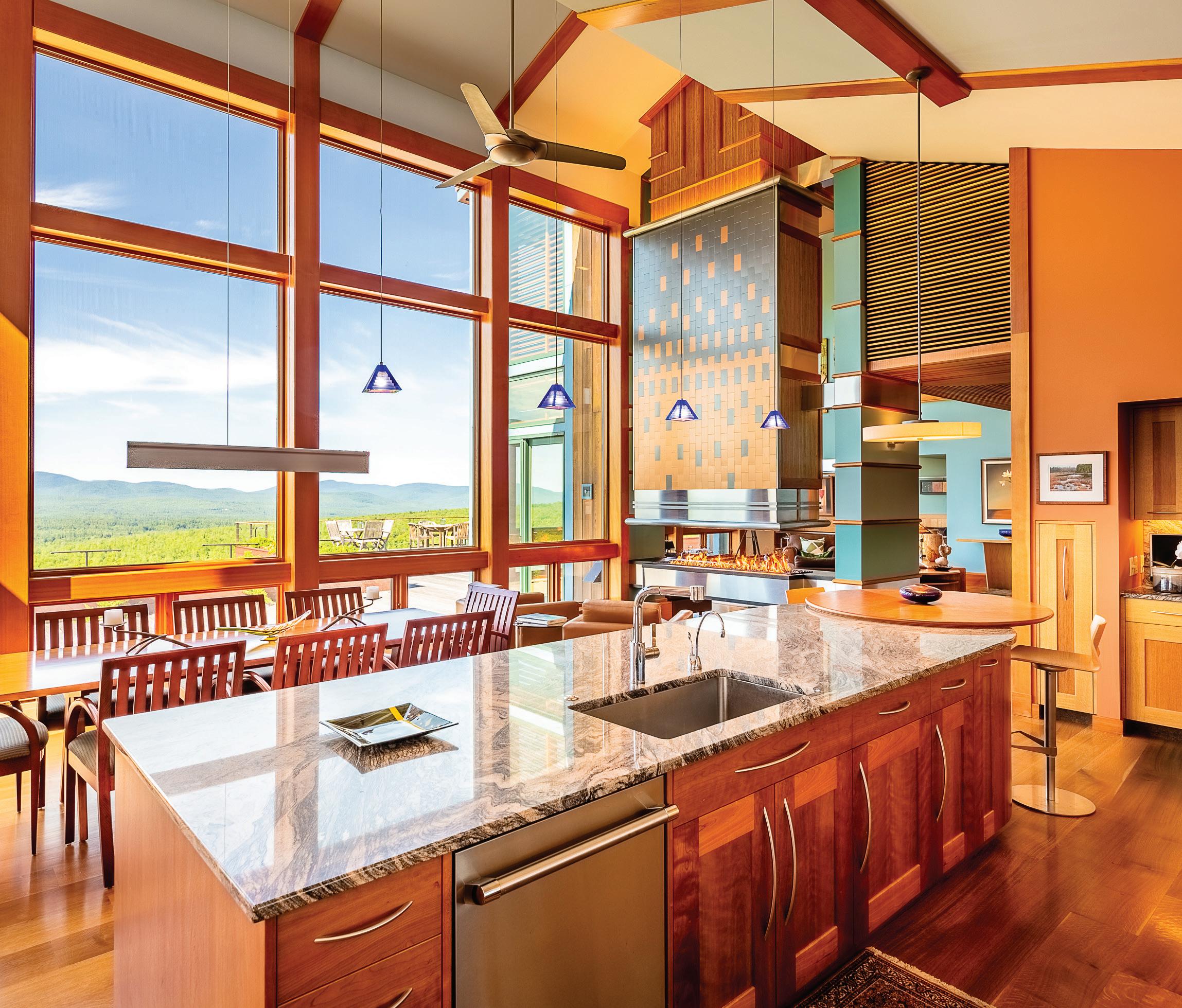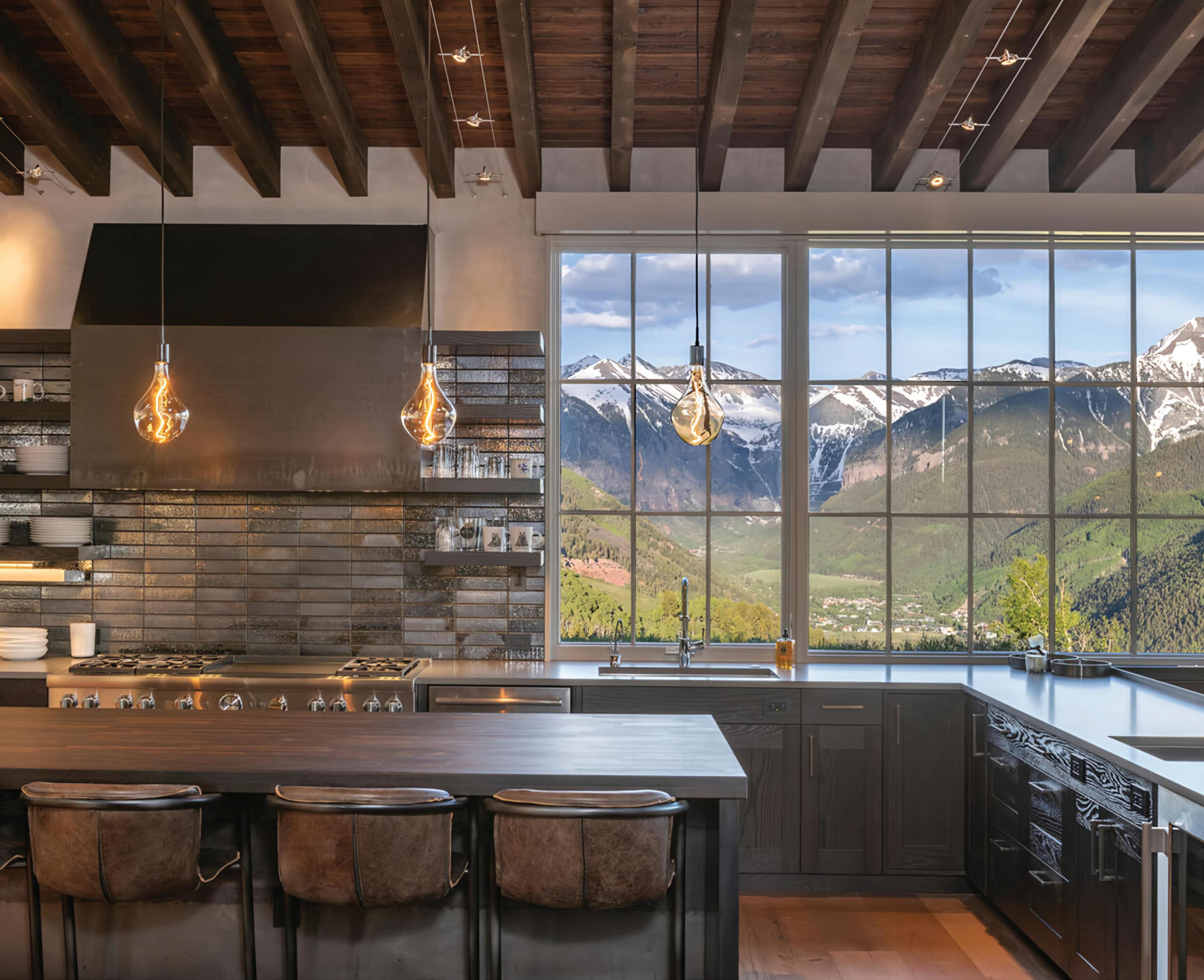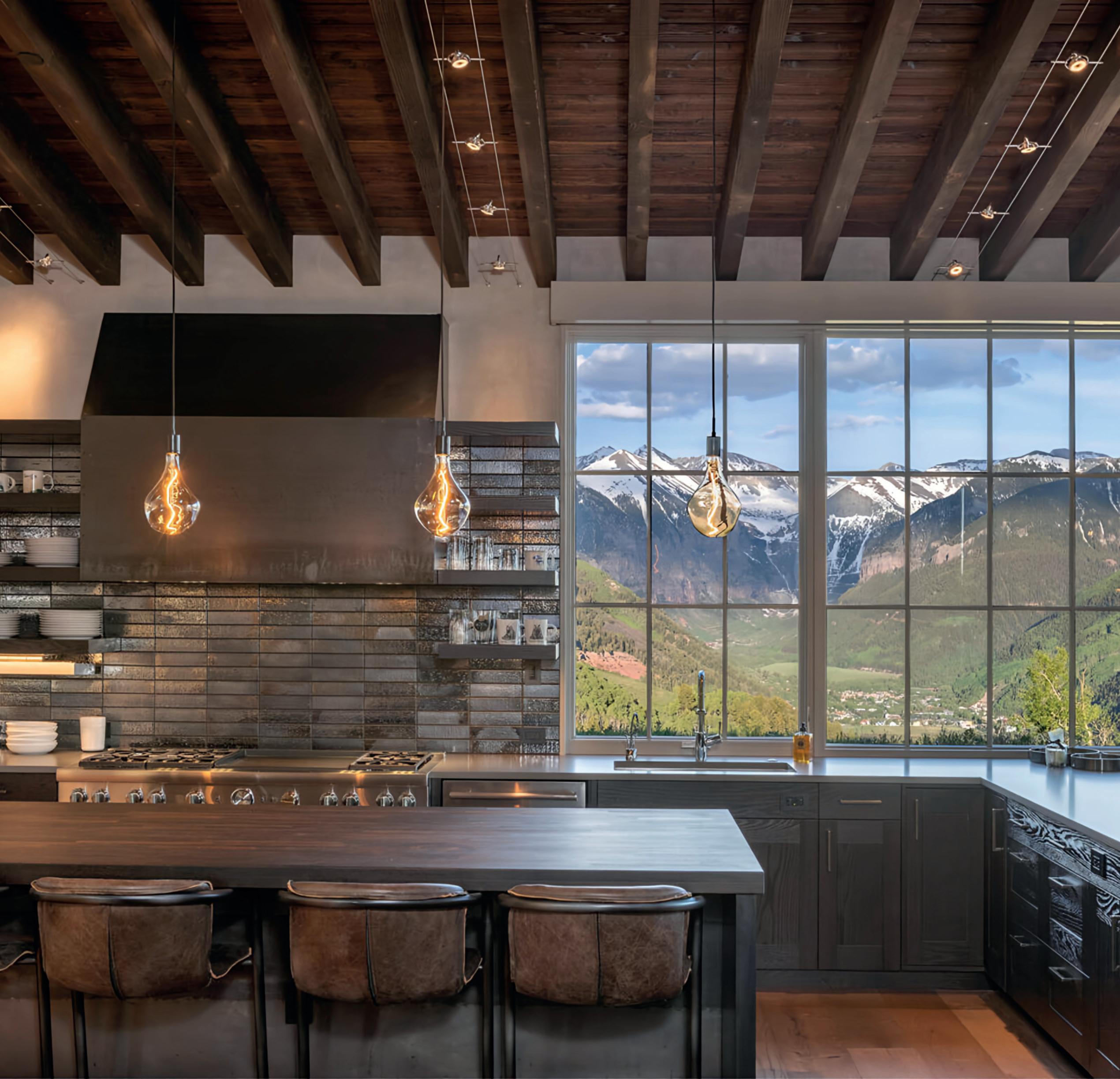 Far left: A lamp by Lana Launay hangs in the Sun Ranch retreat in Australia’s Byron Bay (page 44). Left: Architect Michael K. Chen’s Nomad Loft embraces color (page 20). Above: In an impressive Colorado property, kitchen windows look out onto the Rocky Mountains (page 58)