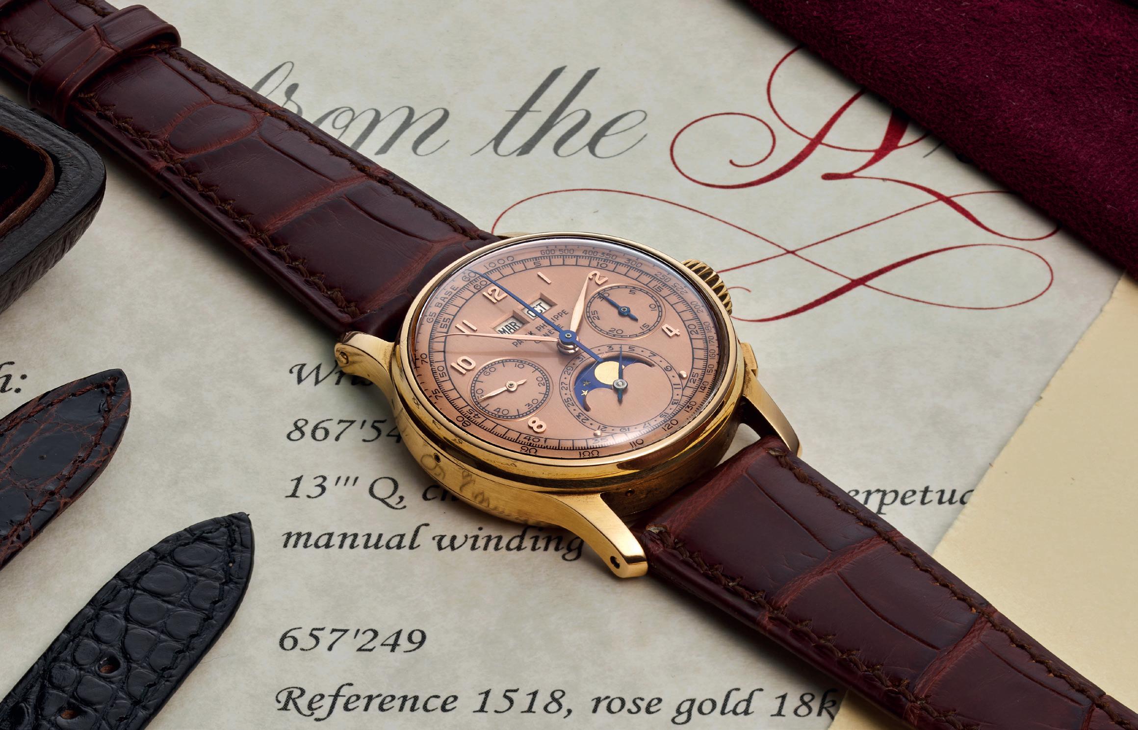 Left: A 1948 Patek Philippe reference 1518 pink-gold perpetual-calendar chronograph watch with moon phases sold at Sotheby’s New York in 2021 for $9.6 million