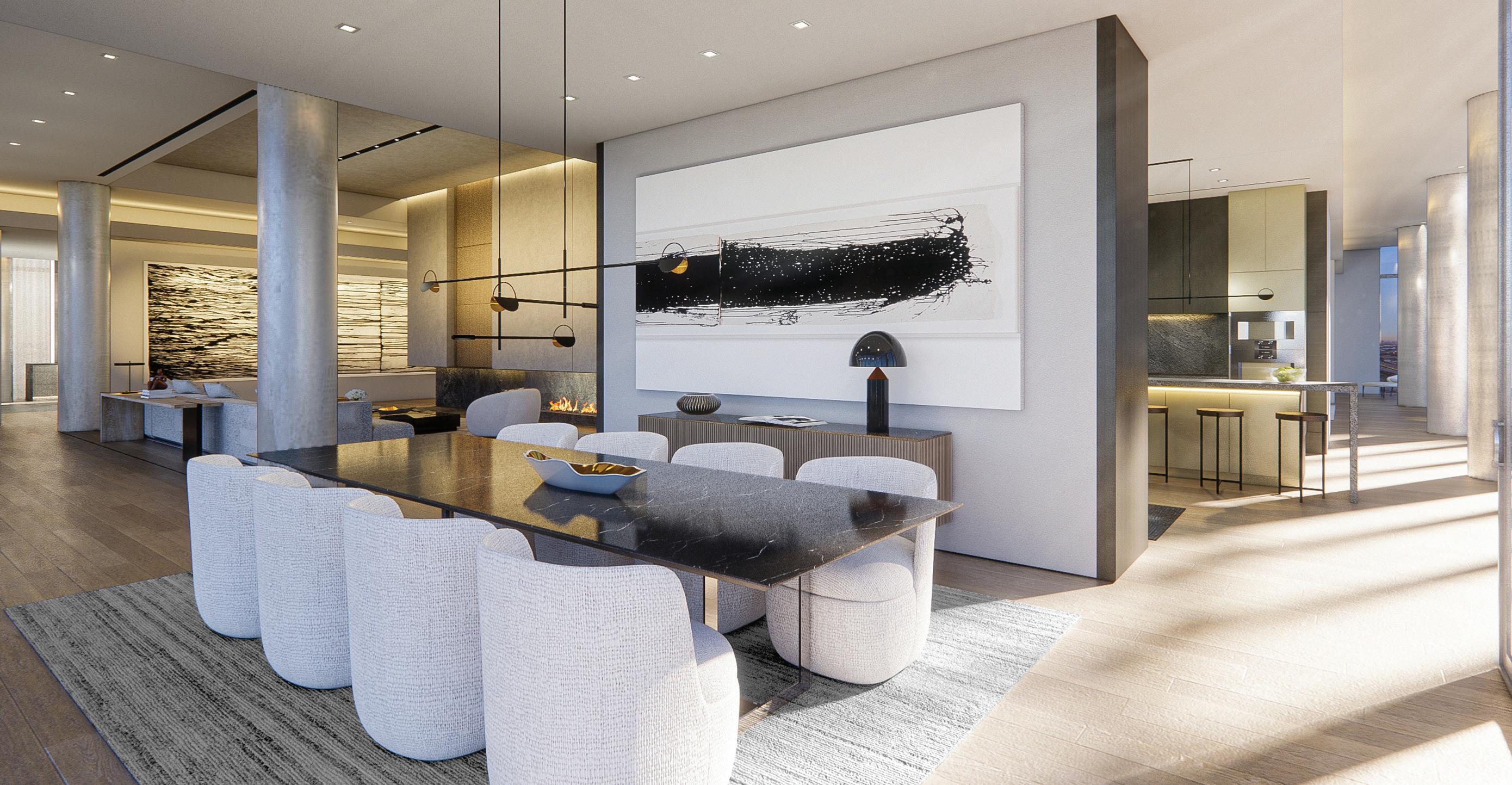 In the primary bedroom suite, complete with a private terrace, wake up each morning to sprawling views of the city stretching out beneath you like a work of art. The spa-inspired bath, with its heated stone floors, graceful soaking tub and natural sunlight, is a sanctuary within a sanctuary. Adjacent to it, two expansive dressing rooms provide personalized spaces that speak to individual style.