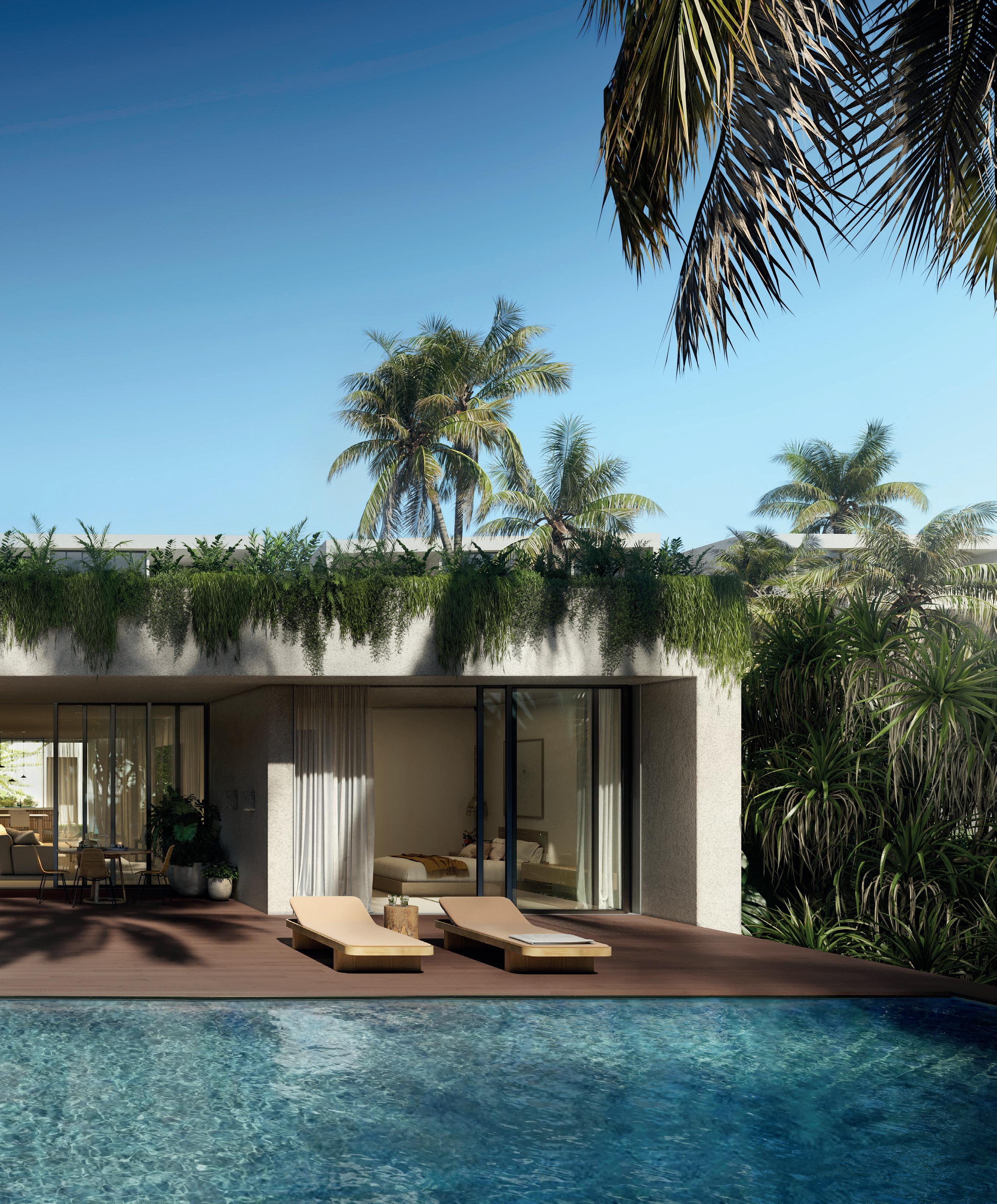 The arresting geometry of this twostory home is designed to harmonize with the surrounding Nevada landscape. The bespoke new build by design firm Blue Heron Elite is part of its Luminary Collection, architecturally distinct houses created for select neighborhoods across Clark County. Egress, which will be completed in November 2025, is one of several homes under construction in the gated community of Ascaya, Henderson, known for its “Desert Contemporary” style of architecture. Expansive glass pocket doors connect the interior of the 7,050 sq ft property—comprising five bedrooms, five bathrooms, generous entertaining space and a media room—with the outdoors, where the private pool, spa and wet bar look out to expansive views of the surrounding mountains and across to the Las Vegas strip (located only a short drive away). There is also ample on-site parking for five cars.