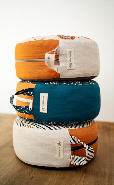 Viel Zeit nehmen sich Manuela und Anna Pedevilla, Nichte und Tante hinter „Manna Yoga“, für jedes ihrer Kissen. Aus natürlichen Stoffen in sanften Farben und geometrischen Mustern nähen sie Augen- und Rundkissen, „Bolster“ und Halbmondkissen für entspannte Yogastunden. Die nachhaltige Füllung ist aus lokalem Bio-Dinkelspelz; damit die Kissen so lang wie möglich benutzbar sind, bieten die beiden das Wiederauffüllen kostenlos an. Rundkissen mit waschbarem Bezug, Ø 30 cm, 79,00 Euro.