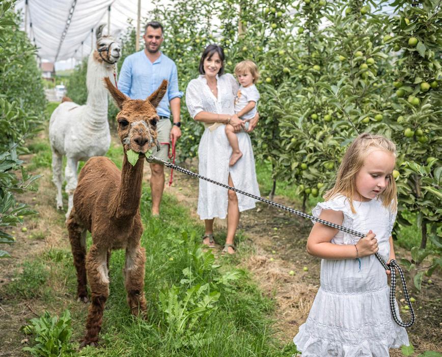 Am Waldharthof in Raas schlendern Lamas und Alpakas beim Spaziergang durch die Apfelwiesen mit. Manchmal braucht’s unterwegs einen kleinen Snack.