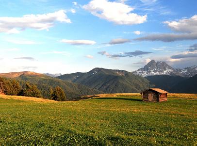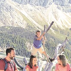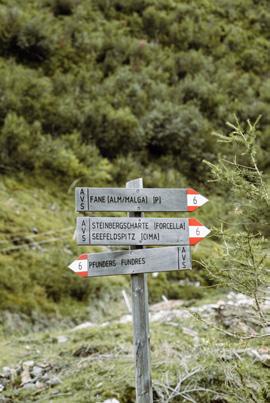 Valler Jöchl (1.932 m) ab. Mäßig ansteigend quert man nun auf dem Rotensteiner Höhenweg steile Bergwiesen. Anfangs scheint der Weg nicht sehr aufregend, aber das ändert sich mit jedem Meter: Einige Passagen sind mit einer Kette gesichert, der Blick weitet sich auf das Valser Tal bis hin zu den Dolomiten. Vorbei am Peachenjöchl (2.201 m) hält man sich bei der folgenden Gabelung weiterhin an die Höhenwegmarkierung und gelangt in etwa 40 Minuten hinab zur Fane Alm (1.739 m), wo mehrere Hütten zur Stärkung einladen. Am Rückweg talauswärts entlang der Markierung Nr. 17 informieren mehrere Stationen über die Milchwirtschaft, Endpunkt der Tour ist die Talstation der Bergbahn.