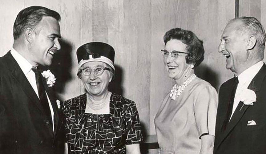 1. Workers at McKinnon Industries — a subsidiary of General Motors — contributed to Brock University’s Founding Fund. 2. From left: In 1963, Ontario Premier John Robarts met with Flora Egerter of the Allanburg Women’s Institute, Emma Bearss, former President of the Welland County Women’s Institute and Secretary of the Niagara Peninsula Joint Committee on Higher Education, and Arthur Schmon, Brock University Founders Committee Chair. 3. Members of the Allanburg Women’s Institute in 1964, including Flora Egerter, Alice Dougherty, Agnes Kinnaird, Helen Baufeld, Freda Geroy, Mae Stephenson, Jean Harley, June Egerter, Jean Egerter, Orcad Vanderburgh, Edna Egerter, Freda Hagar, Marge Harley, Ethel Batty and Edith Zieman. 4. In this 1964 photo, Vice-President Stanley Deeks and President James A. Gibson stand before the billboard advertising the newly chosen location for Brock University.