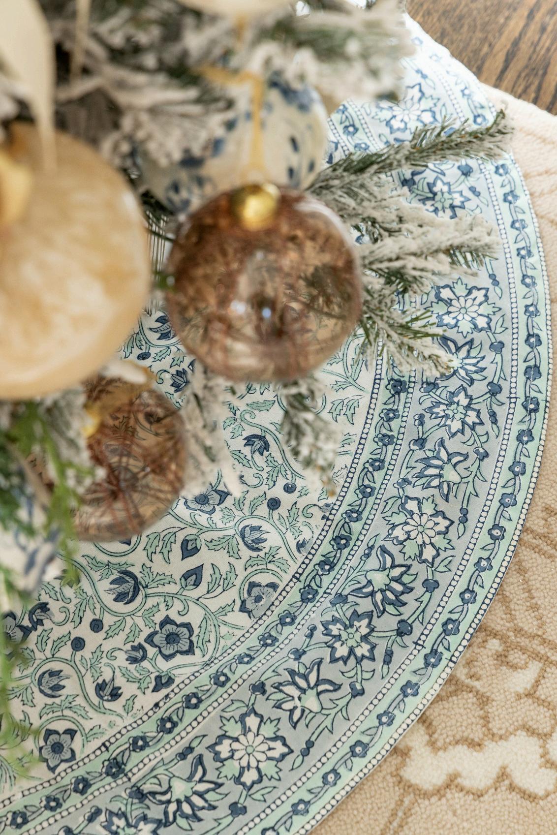 Handcrafted with intricate floral block printing, this tree skirt showcases soft, earthy blue and green tones for a naturally elegant look. Its delicate patterns and organic hues create a timeless foundation for holiday décor, blending seamlessly with both classic and modern styles