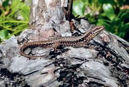 Abb. 4: Lichtdurchflutete und strukturreiche Waldföhrenwälder, wie beispielsweise im Walliser Pfynwald, bieten Lebensraum für eine Vielzahl von licht- und wärmeliebenden Tier- und Pflanzenarten, wie z.B. (Abb. 4a) der Berberitze (Berberis vulgaris), (Abb. 4b) der Aspisviper (Vipera aspis aspis) und (Abb. 4c) der Mauereidechse (Podarcis muralis).