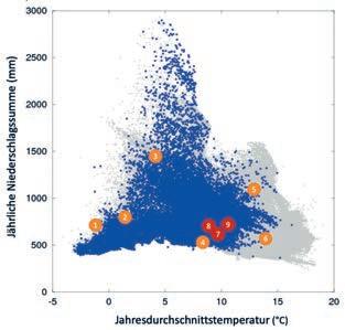 Abb. 1 links: Verbreitungsgebiet (Wikimedia 2023), rechts: klimatische Nische der Waldföhre (Pinus sylvestris L.) mit Jahresdurchschnittstemperatur (x-Achse) und jährlicher Niederschlagssumme (y-Achse) – Datengrundlage sind nationale Waldinventuren (Houston Durrant et al. 2016). Die grauen Punkte umreissen die gesamte Waldfläche Europas, die blauen Punkte die Waldföhrenwälder. Die Nummern markieren die Standorte von Abb. 2 und 3: Orange Punkte zeigen natürliche/naturnahe Waldföhrenwälder, rote Punkte zeigen Waldföhrenplantagen.