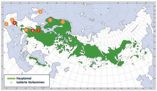 Die Waldföhre ist die Baumart mit dem grössten Verbreitungsgebiet in Eurasien (Abb. 1, a): Sie hat ihren Schwerpunkt in den borealen Gebieten Eurasiens und erstreckt sich vom äussersten Osten Russlands (140 ° O) bis Andalusien in Südspanien (5 ° W), vom nördlichsten Norwegen (70 ° N) bis in die Zentraltürkei (37 ° S). Waldföh-