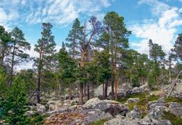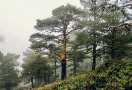 Abb. 2: Beispiele von natürlichen Waldföhrenwäldern: 1: Region Abisko, Nordschweden: Granitischer Blockschutt, trocken, sauer; 2: Region Röros-Bergen, Norwegen: Moorrandwälder, nass, sauer; 3: Cairngorms, Highlands, Schottland: Kuppenlage, Podzolböden, feucht, sauer; 4: Salgesch, Zentralwallis, Schweiz: Rendzinen, trocken, kalkhaltig; 5: Sierra de Cebollera, Soria, Zentralspanien: Blockschutt, trocken, sauer; 6: Sierra de Baza, Andalusien, Spanien: Rendzinen, trocken, kalkhaltig.