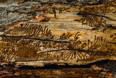 zen kann beginnen. Auch das Bohrmehl und der Kot der Käfer und Larven kann schnell von Mikroorganismen und Pilzen besiedelt und abgebaut werden. Ausserdem löst die Frasstätigkeit der Larven und Jungkäfer die Rinde vom Splintholz (Abb. 1). Dadurch wird der Holzkörper für weitere Insekten und Pilze zugänglich. Ferner schleppt zum Beispiel der Buchdrucker – der ökonomisch wichtigste Borkenkäfer – oft einen Pilz ein, der ihm die Besiedlung erleichtert, den Wassertransport im Holz unterbricht und Zellinhaltstoffe abbaut. Ähnliches bewirken die Ambrosiakäfer, die aktiv einen Pilz als Nahrung für ihre Brut ins Holzinnere eintragen (siehe Beitrag S. 16). Neben Borkenkäfern sind auch Holzwespen typische Erstbesiedler und Abbaupioniere von frisch abgestorbenen Bäumen. Auch sie bringen einen Pilz ein, der den Larven den Abbau von Holz erlaubt.