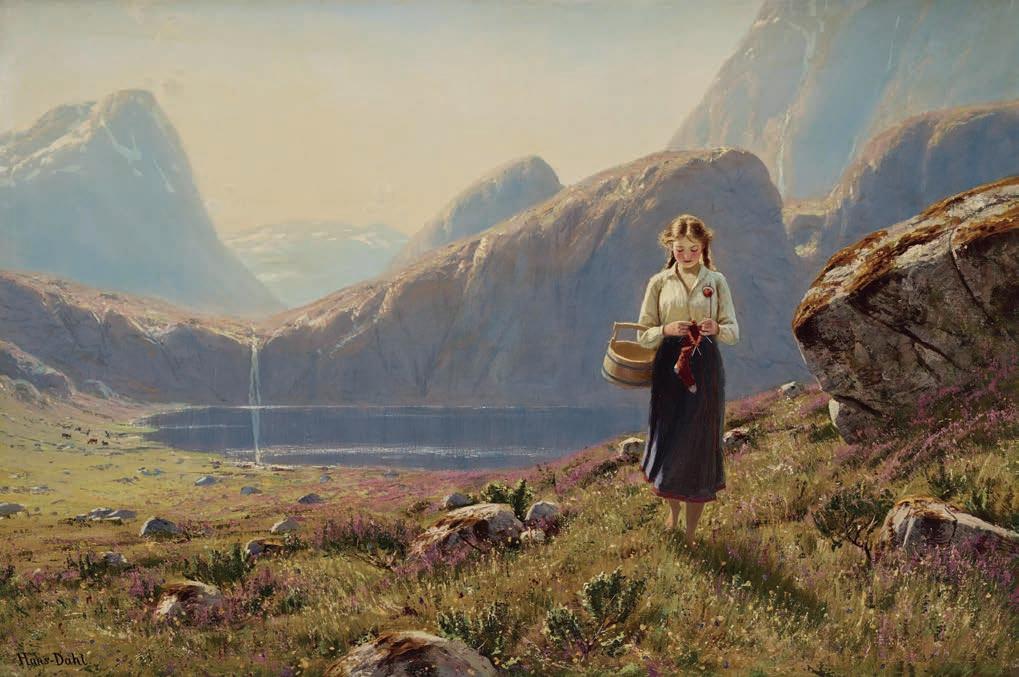 584. Hans Dahl (Norge, 1849–1937) Ung kvinna i fjordlandskap.