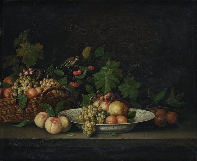 Stilleben med blommor och frukter.