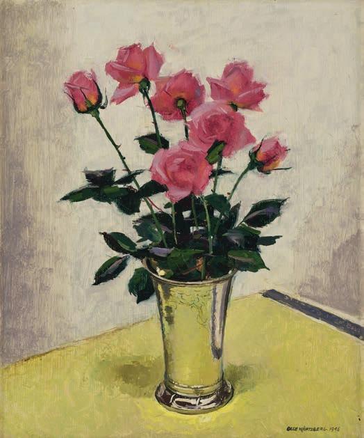 592. Olle Hjortzberg (Sverige, 1872–1959) Rosor i silvervas.
