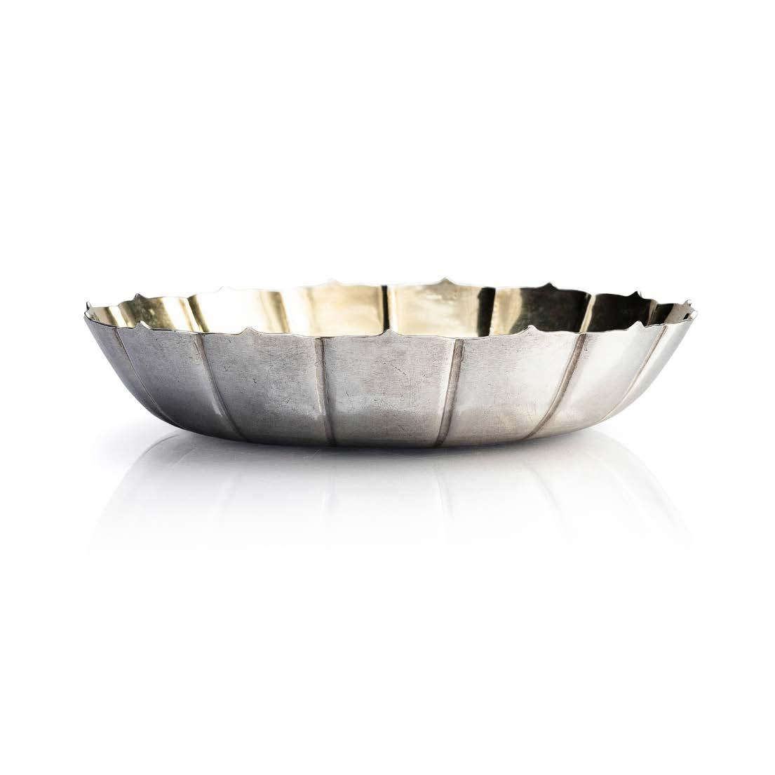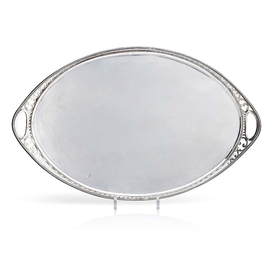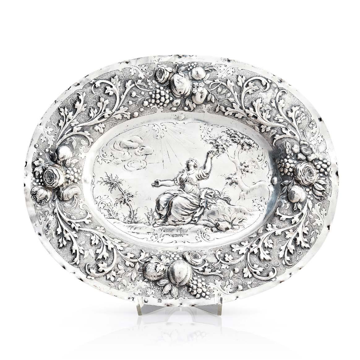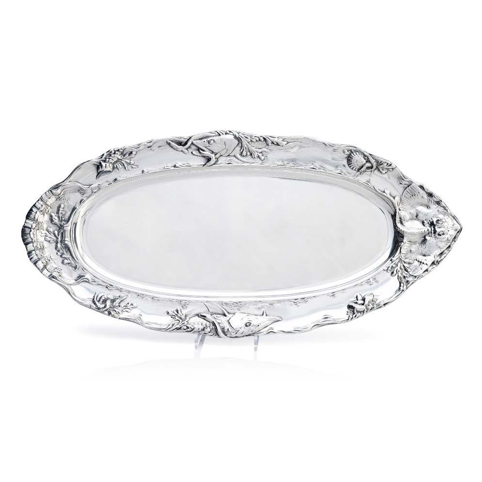 467. Stort sterling silver fiskfat, W.A. Bolin, Stockholm 1939. Ovalt, rikt driven dekor av olika fiskar så som en stör, en lax och flera skaldjur. 76,5 x 36,5 cm, vikt ca 2660 g.