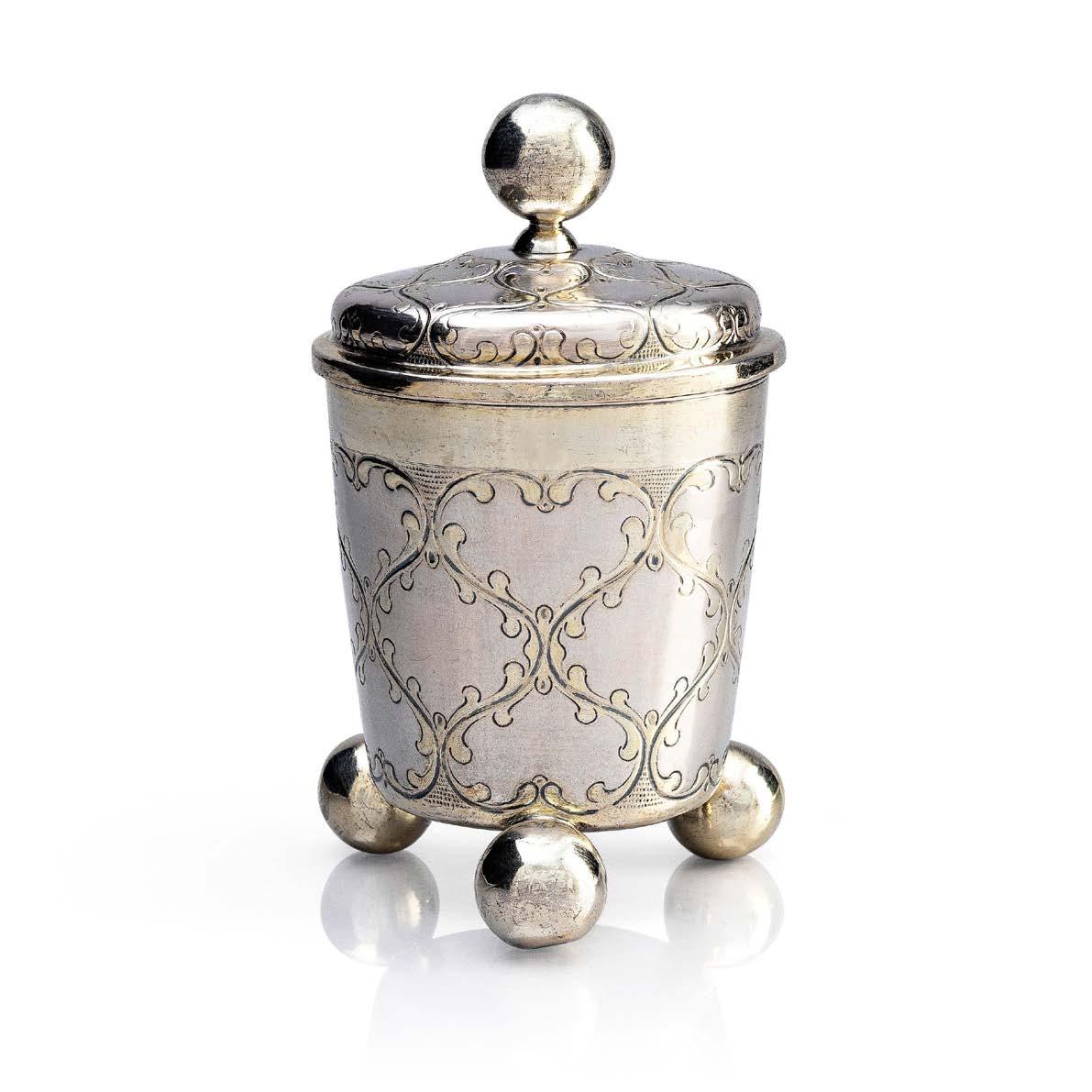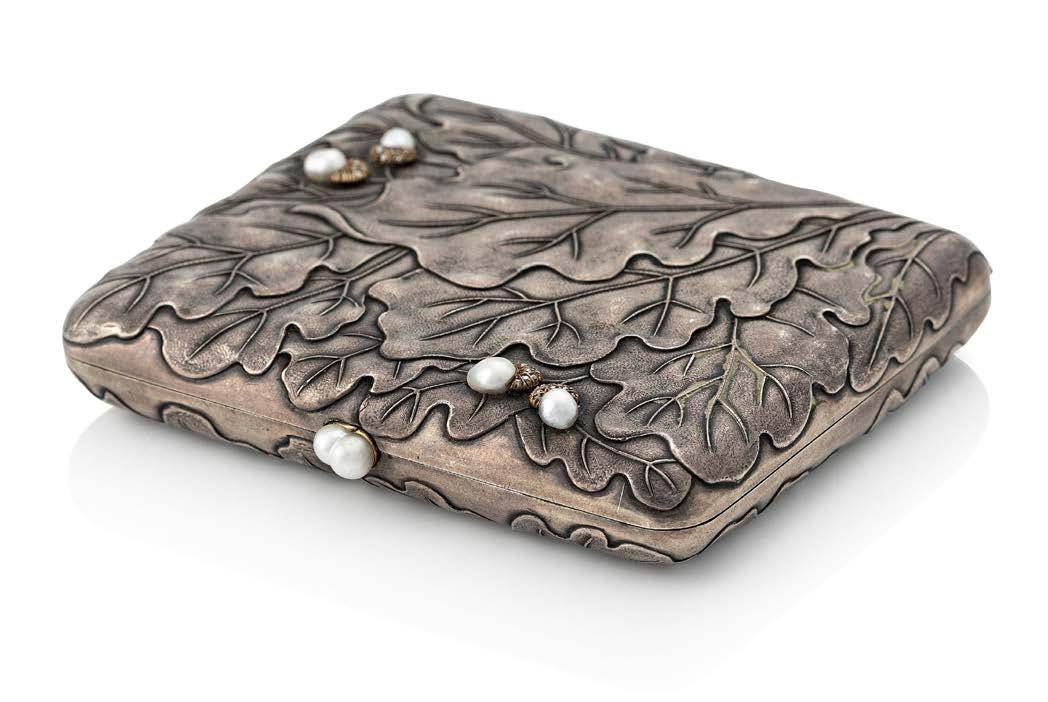 474. Juvelbesatt etui, silver, guldinfattade diamanter och pärlor, Bolin, Moskva 1893-1899. Invändigt förgylld. Rektangulär form. Dekor i form av stiliserade eklöv och ekollon i guld, pärlor och rosenslipade diamanter. Verkmästare Konstantin Linke. Mått: 1,2 x 8,3 x 9 cm (inklusive utstickande pärlor). Vikt 179 g. Konstantin Linke var son till Edward och Maria Linke och var troligen född 1865 eller 1866. Enligt Tatjana Muntjans forskning i ”W.A. Bolin, Bolin in Russia, 2001”, var Konstantin registrerad som köpman i Moskva 1898. Vid sekelskiftet hade han en egen silverbutik och samarbetade med C.E. Bolin. På flera av företagets finaste silverföremål från 1890-talet och framåt finner vi även stämpeln KL. Konstantin Linke ersatte sin mor, Maria Linke, som verkmästare på Bolins cirka 1893.