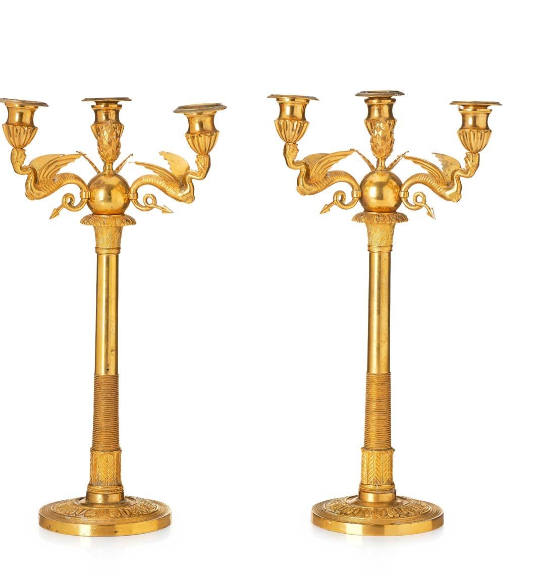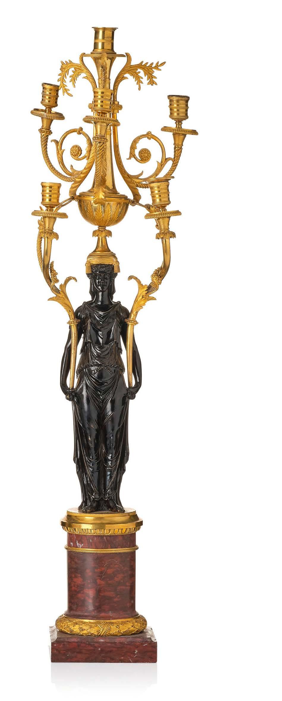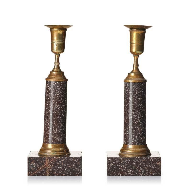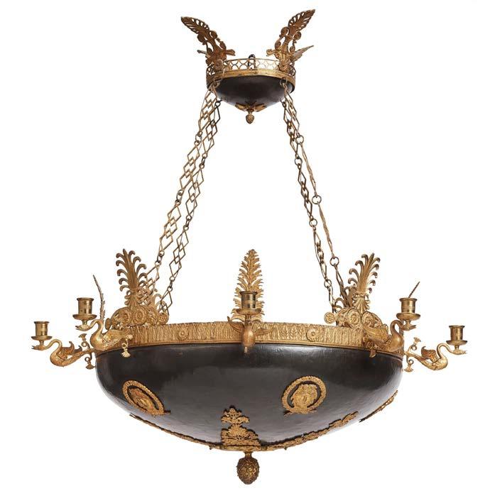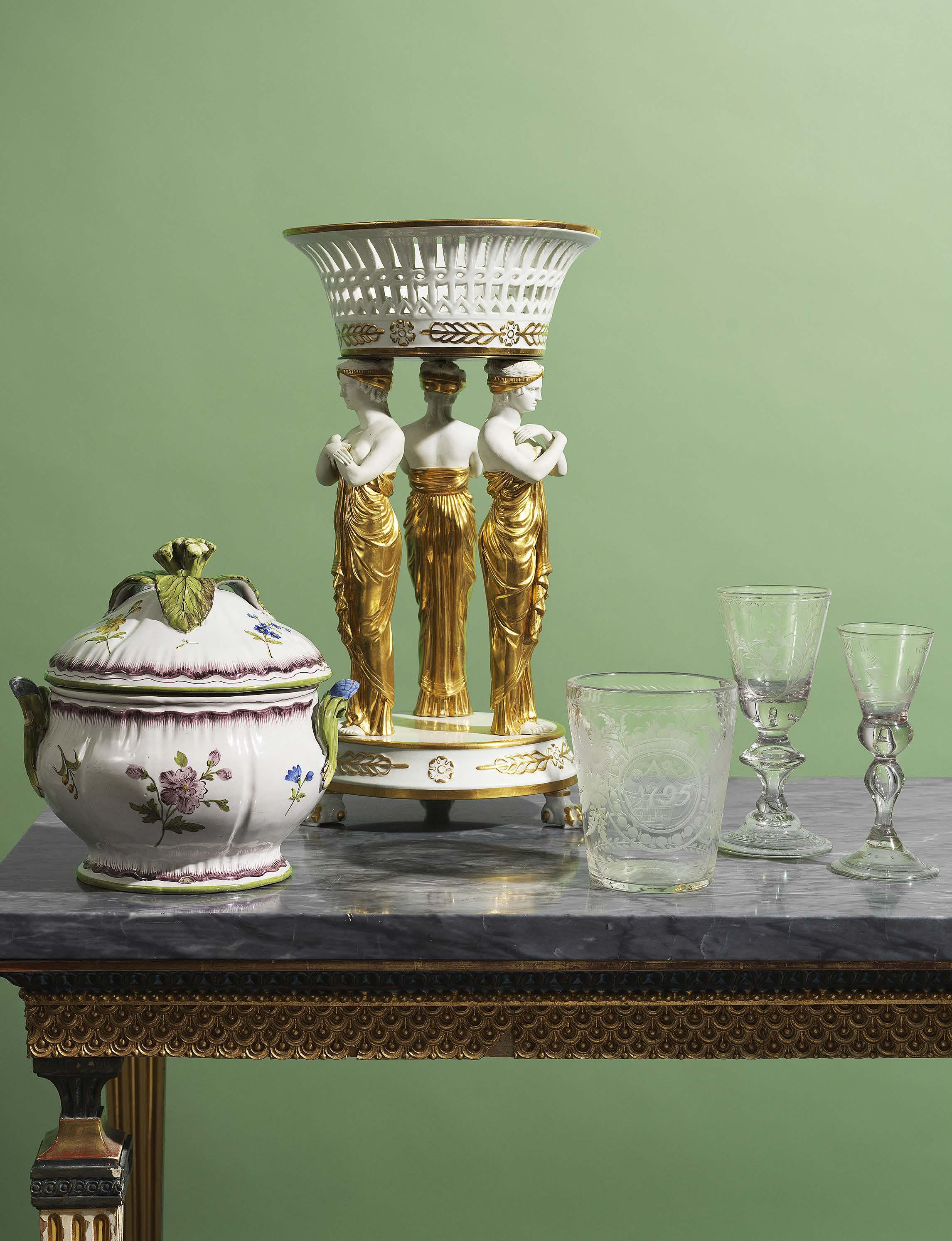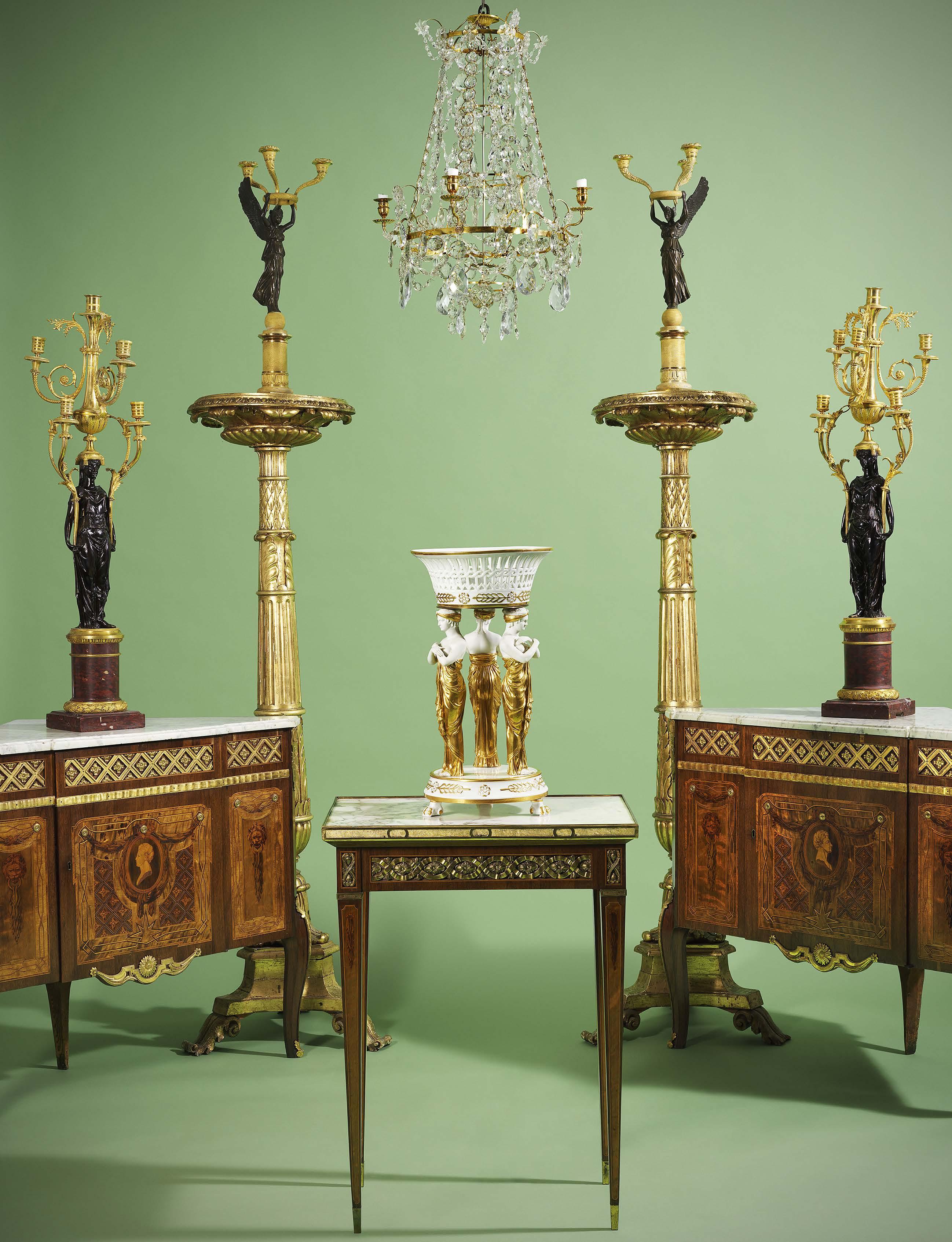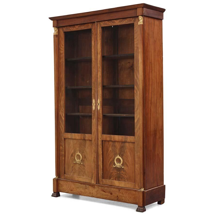 3. Bokskåp, Frankrike, 1800-talets början, Empire. Så kallat ”bibliothèque”. Fanerat med mahogny. Beslag av förgylld brons. Glasat dörrpar med bakomvarande hyllinredning flankerat av egyptiserande hermer. Avslutande lejontassar. Längd 120, bredd 40, höjd 189 cm. Nyckel medföljer.