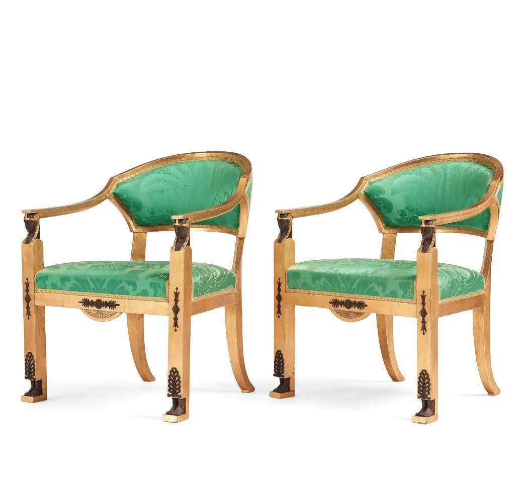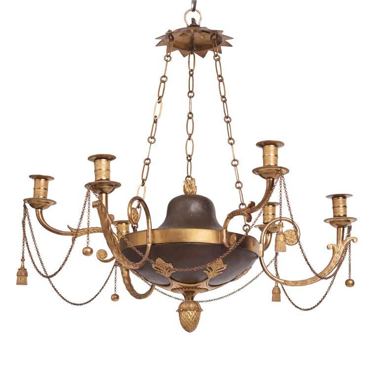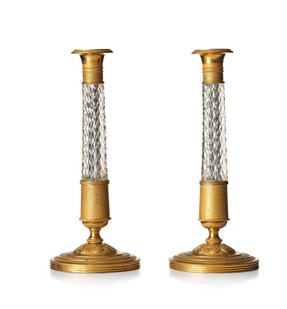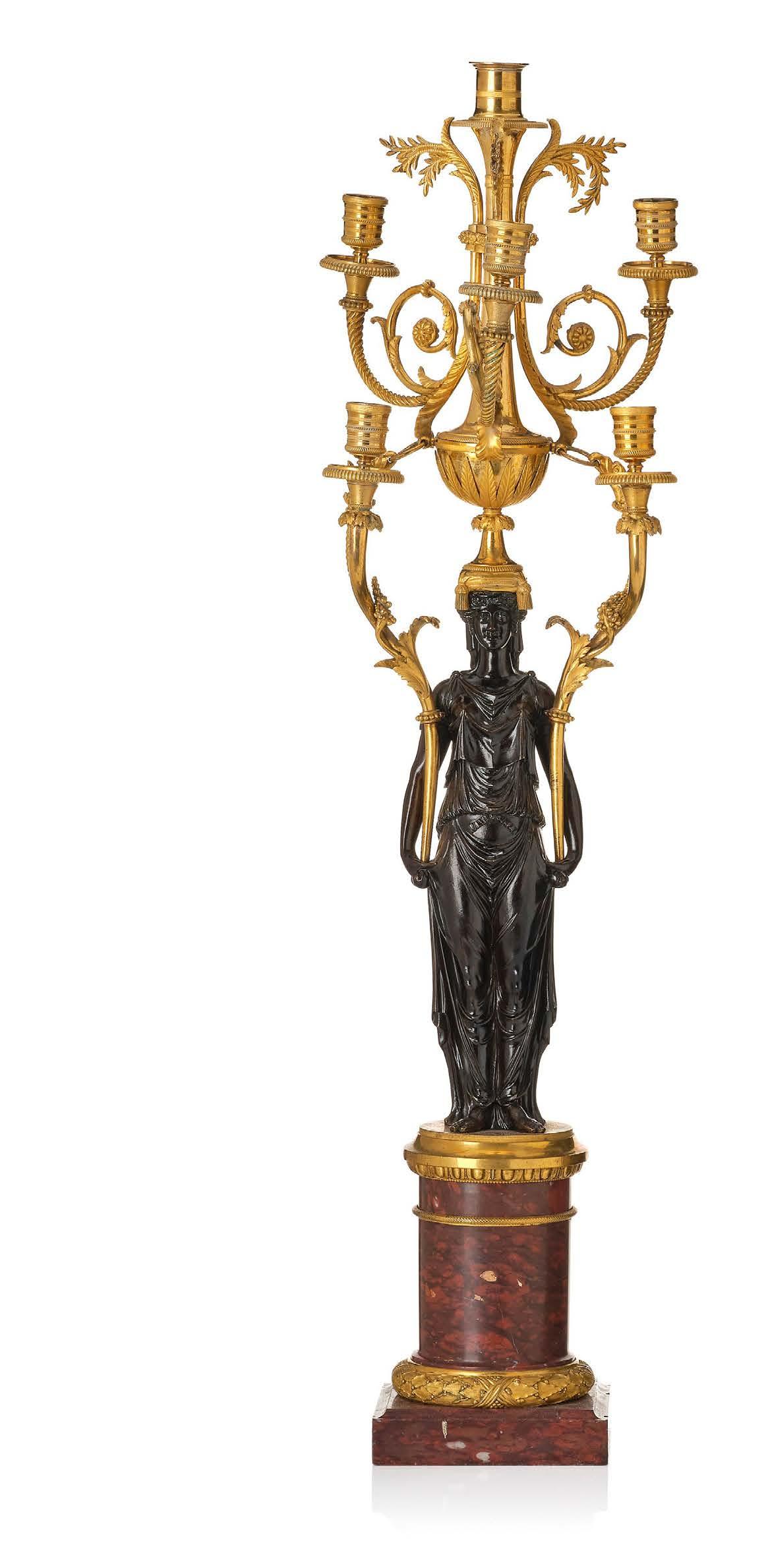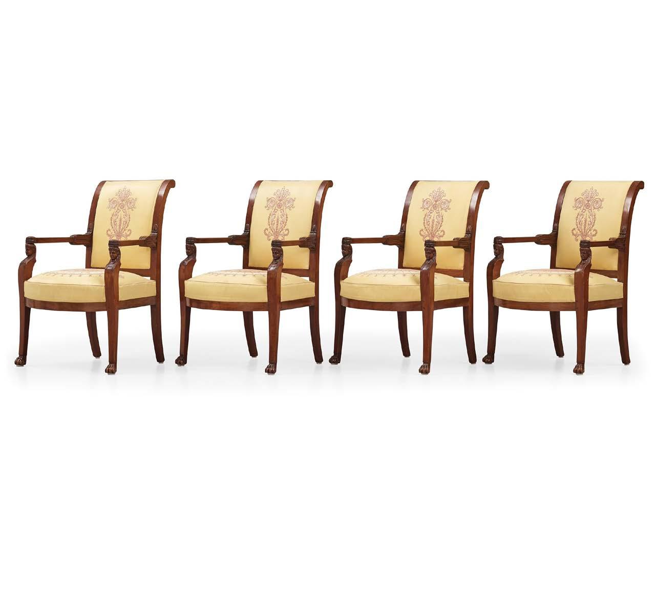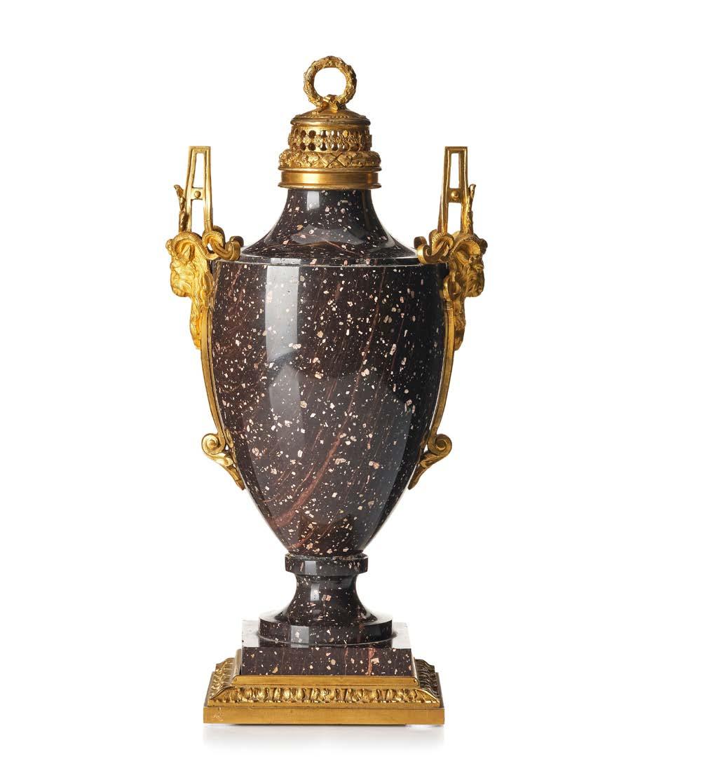 3. Bokskåp, Frankrike, 1800-talets början, Empire. Så kallat ”bibliothèque”. Fanerat med mahogny. Beslag av förgylld brons. Glasat dörrpar med bakomvarande hyllinredning flankerat av egyptiserande hermer. Avslutande lejontassar. Längd 120, bredd 40, höjd 189 cm. Nyckel medföljer.