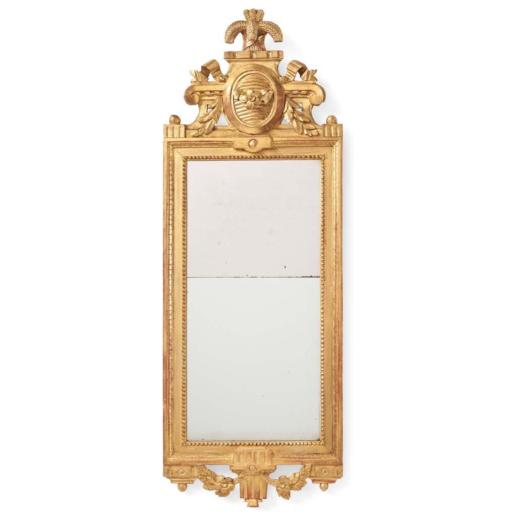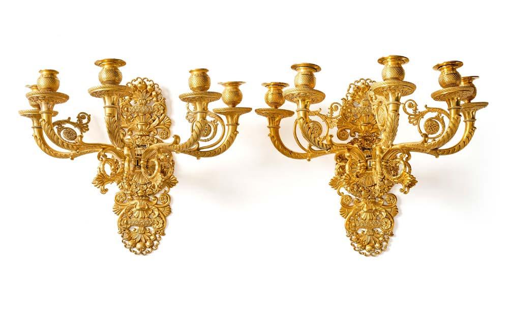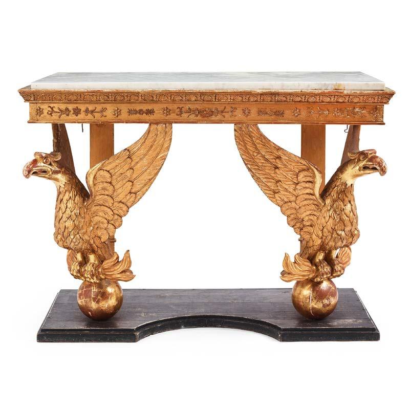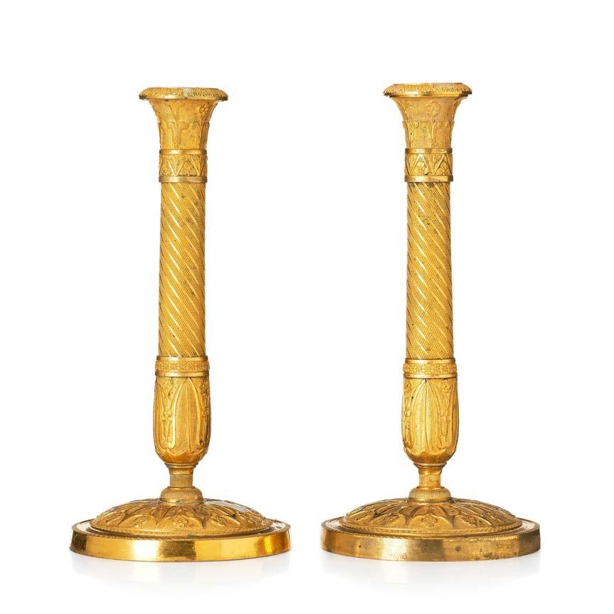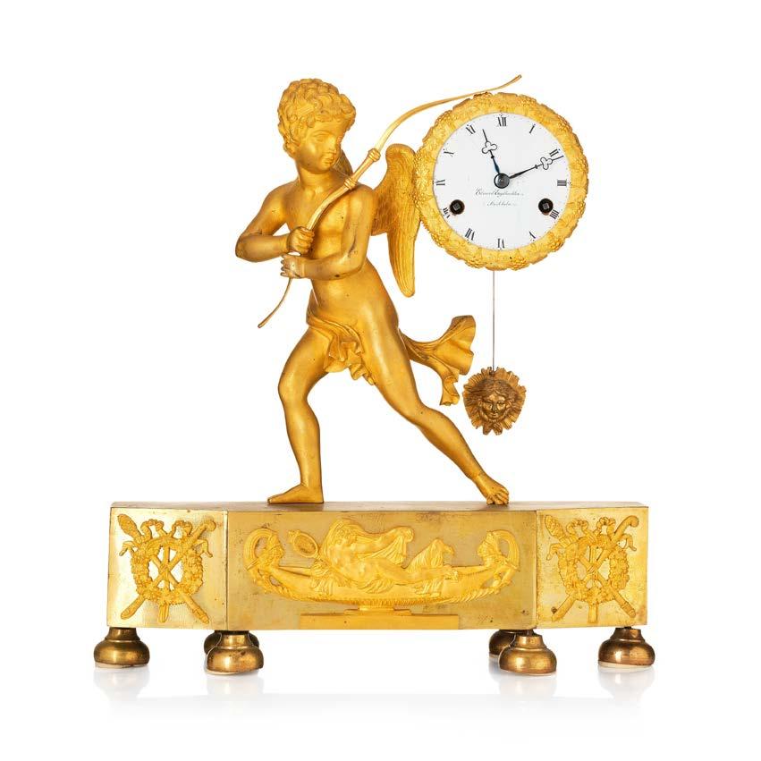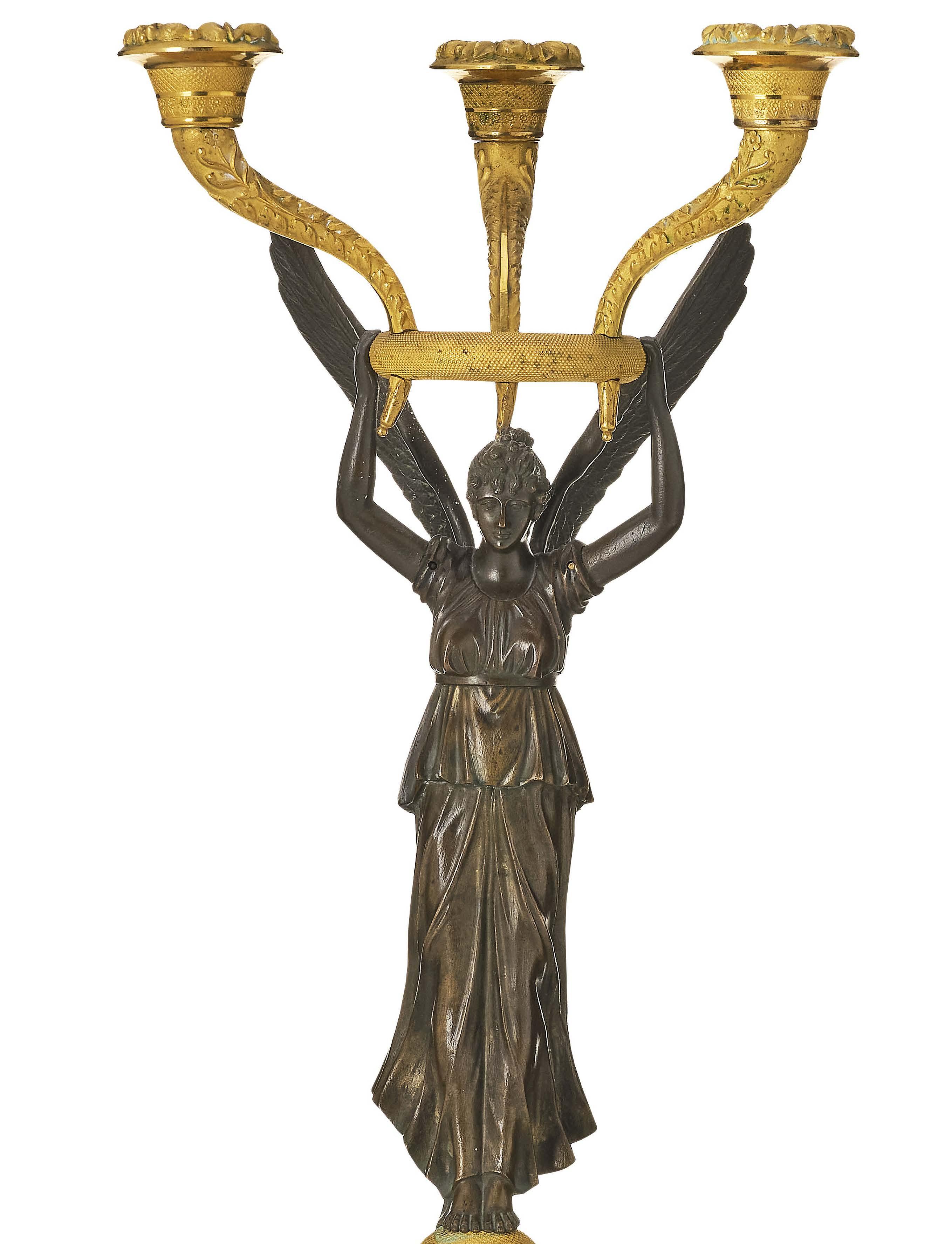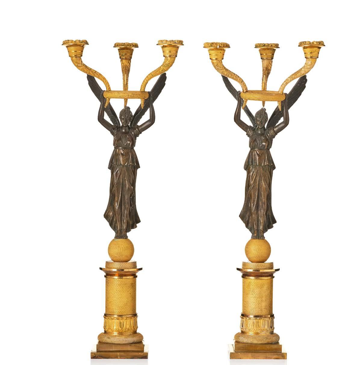 3. Bokskåp, Frankrike, 1800-talets början, Empire. Så kallat ”bibliothèque”. Fanerat med mahogny. Beslag av förgylld brons. Glasat dörrpar med bakomvarande hyllinredning flankerat av egyptiserande hermer. Avslutande lejontassar. Längd 120, bredd 40, höjd 189 cm. Nyckel medföljer.