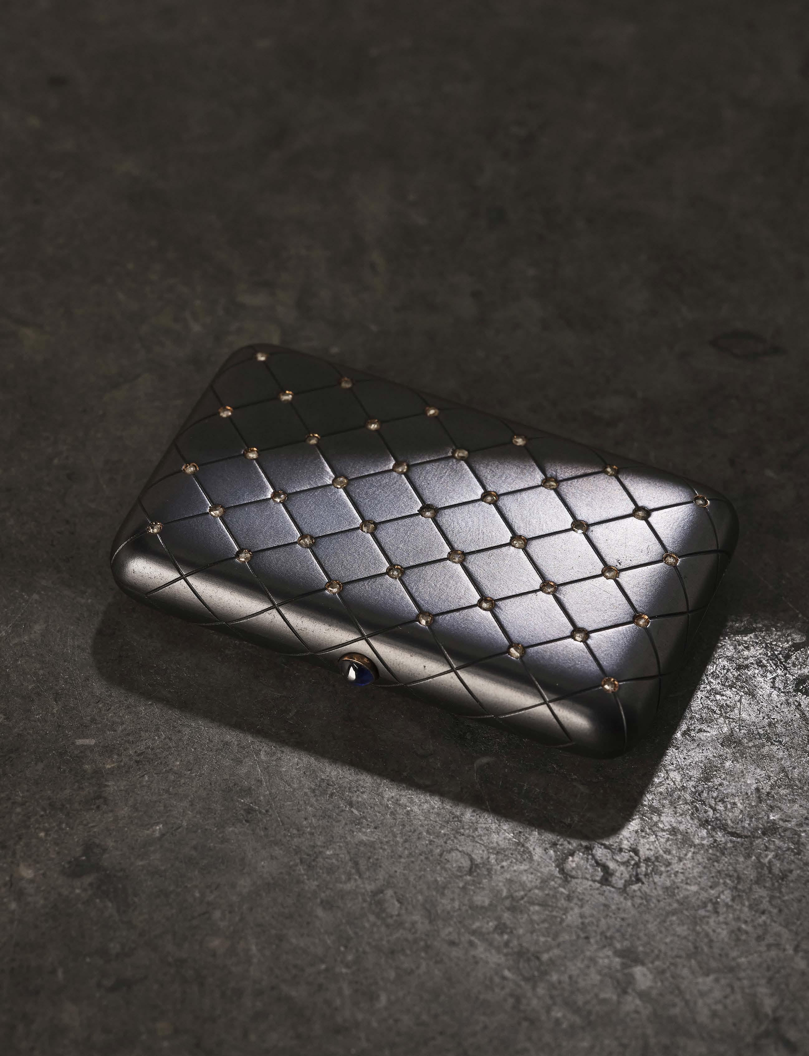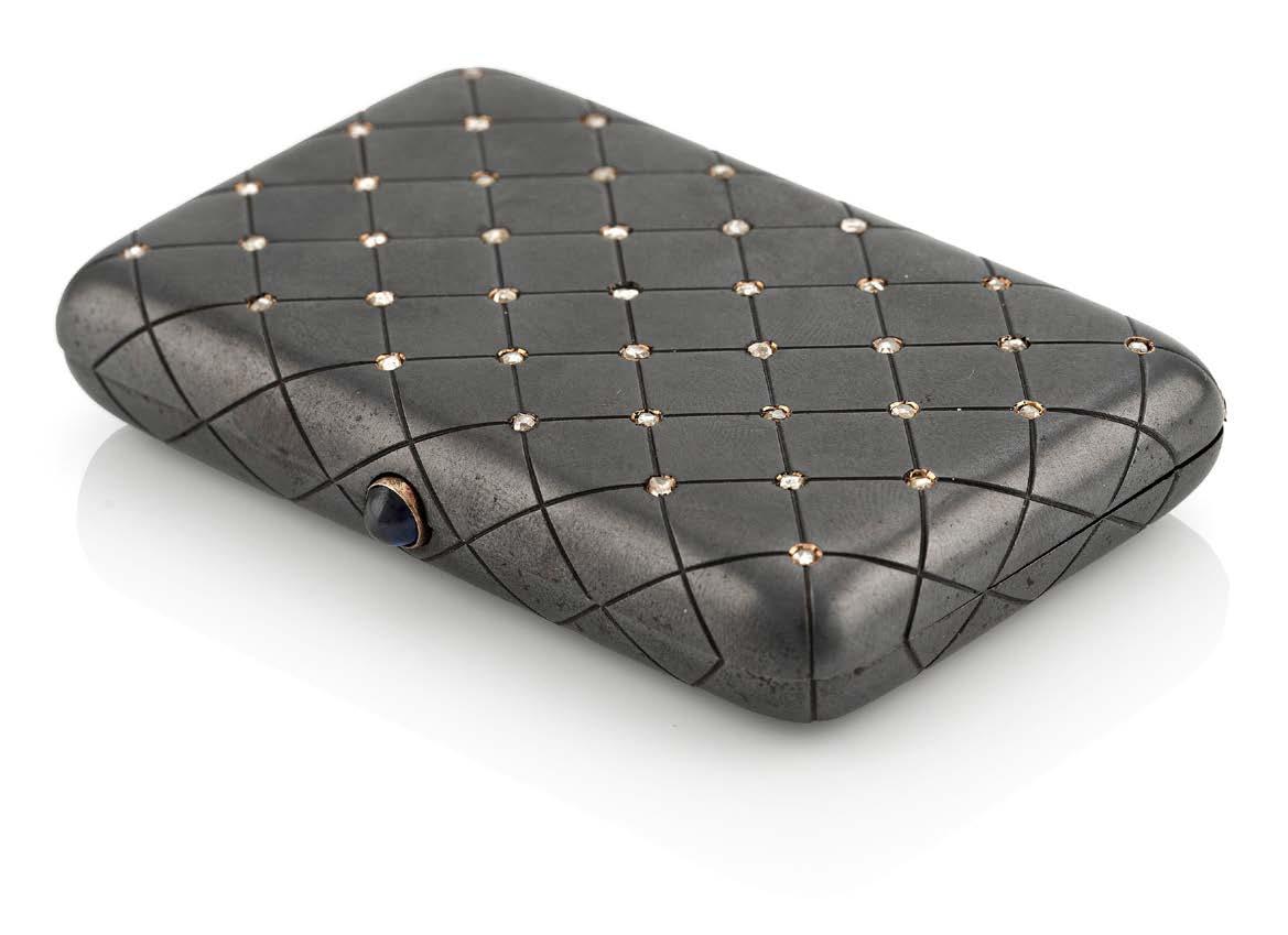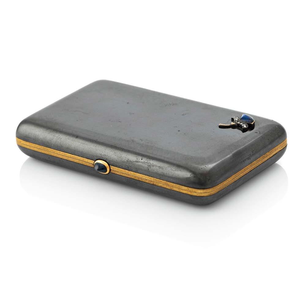 472. Juvelbesatt etui i gun metal samt förgyllt silver, C.E. Bolin, S:t Peterburg 1892 . Rektangulär med rundade hörn. Dekor i form av en stiliserad blomma av rosenslipade diamanter och cabochonslipad safir i guldinfattning. Etuiet har en invändig inskription graverad på en förgylld silverplatta med texten ’Rosebery from The Prince of Wales’. Christmas. 1892.’. Rosebery eller Archibald Philip Primrose, 5th Earl of Rosebery, var en liberal partipolitiker och utrikesminister vid den tiden. Originalfodral medföljer, märkt ’C.E.Bolin, Joaillier de la Cour, St Petersburg, 1892’. Ristat nummer 34869. Höjd 0,8 cm, bredd 5,5 cm (med safir), längd 8,5 cm. Vikt 94 g.