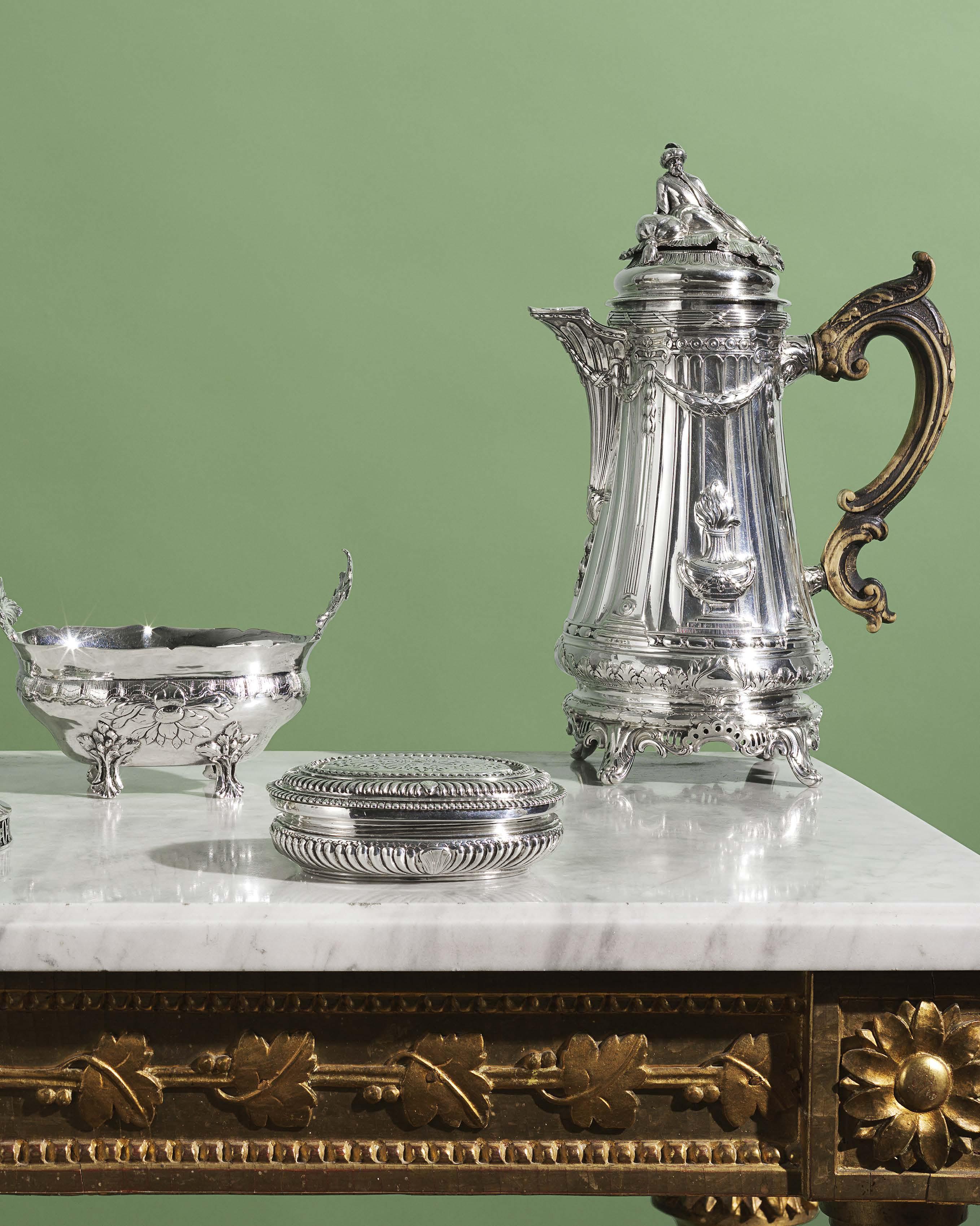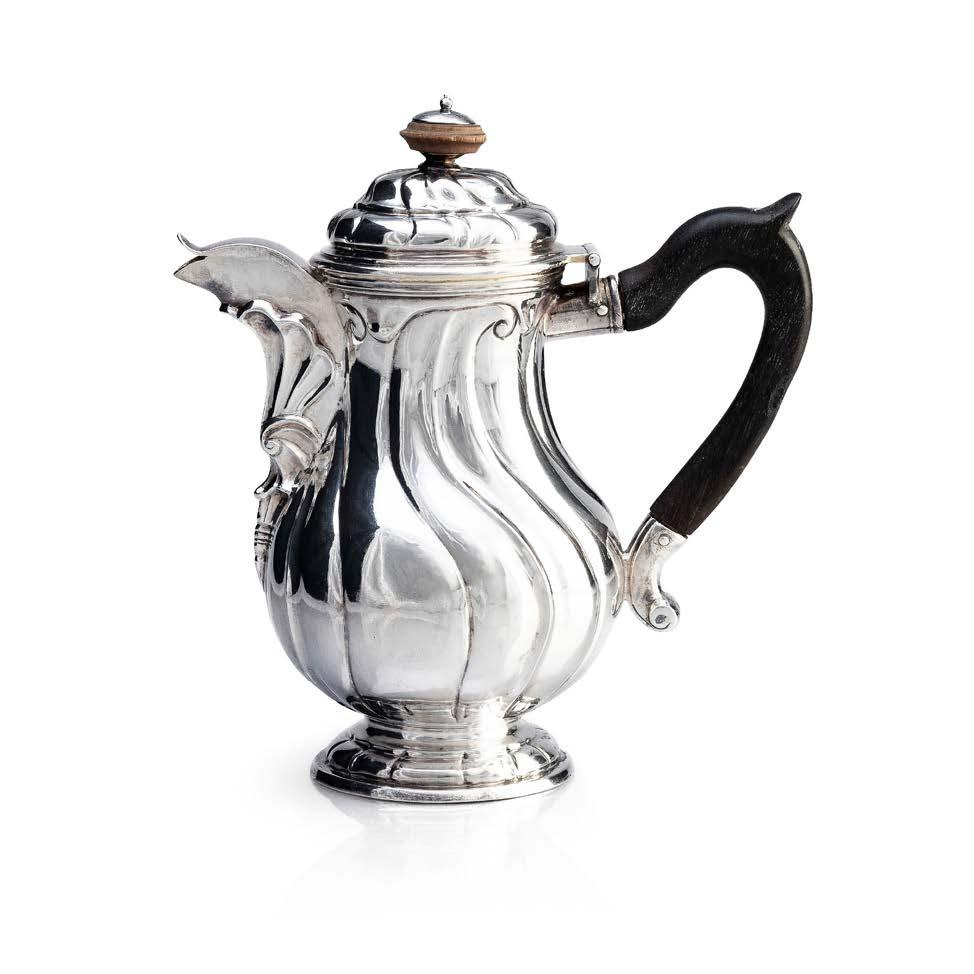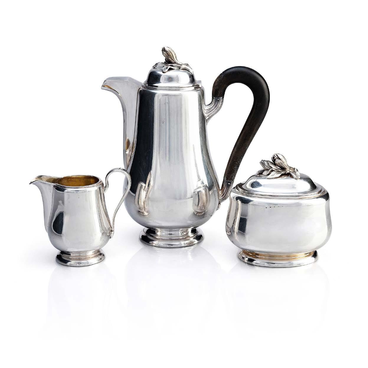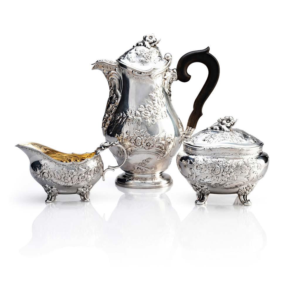 468. Kaffeservis, tre delar, silver, W.A. Bolin, Stockholm 1946. Rokokostil. Bestående av kaffekanna, gräddsnäcka och sockerskål. Invändigt förgyllda. Päronformad, på oval fot, rikligt dekorerad med blomsterornamentik och rocailler, locken med krönande bukett. Kaffekannans handtag i trä. Kannans höjd 27,5 cm.