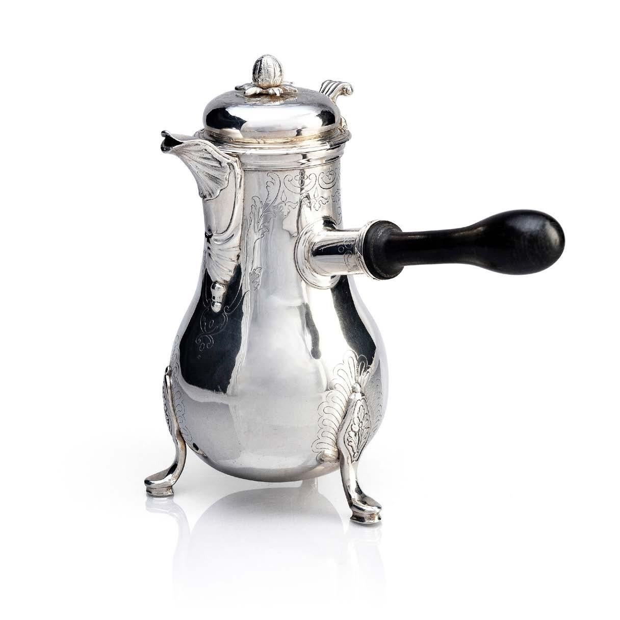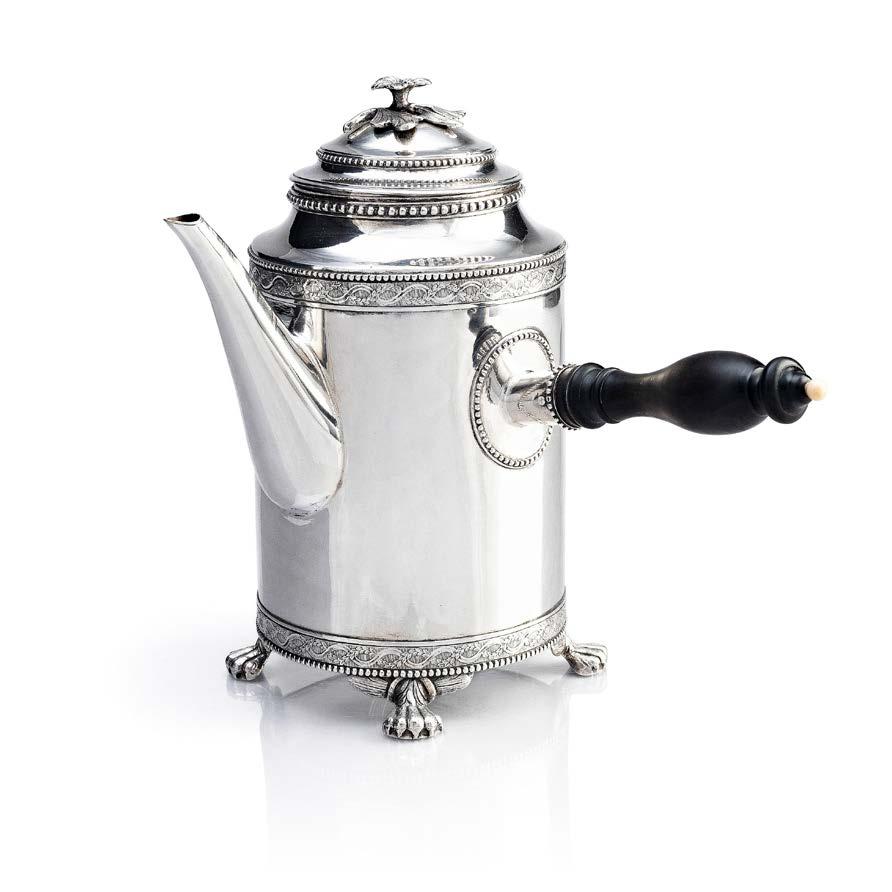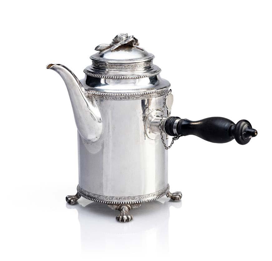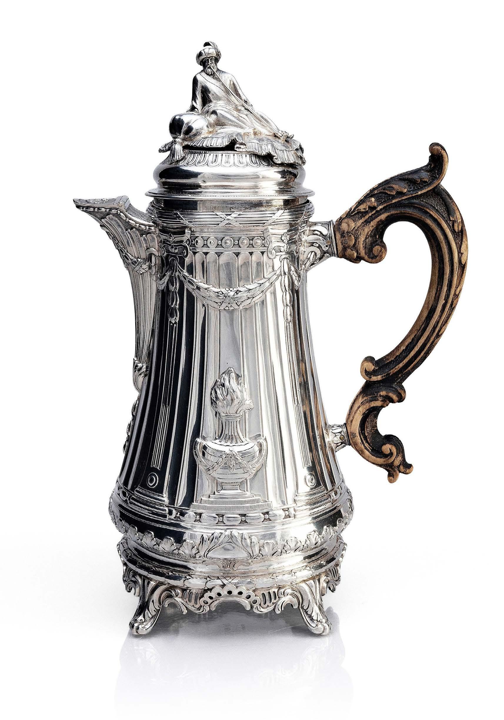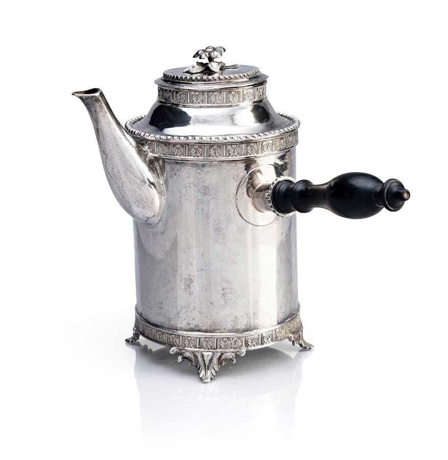 468. Kaffeservis, tre delar, silver, W.A. Bolin, Stockholm 1946. Rokokostil. Bestående av kaffekanna, gräddsnäcka och sockerskål. Invändigt förgyllda. Päronformad, på oval fot, rikligt dekorerad med blomsterornamentik och rocailler, locken med krönande bukett. Kaffekannans handtag i trä. Kannans höjd 27,5 cm.