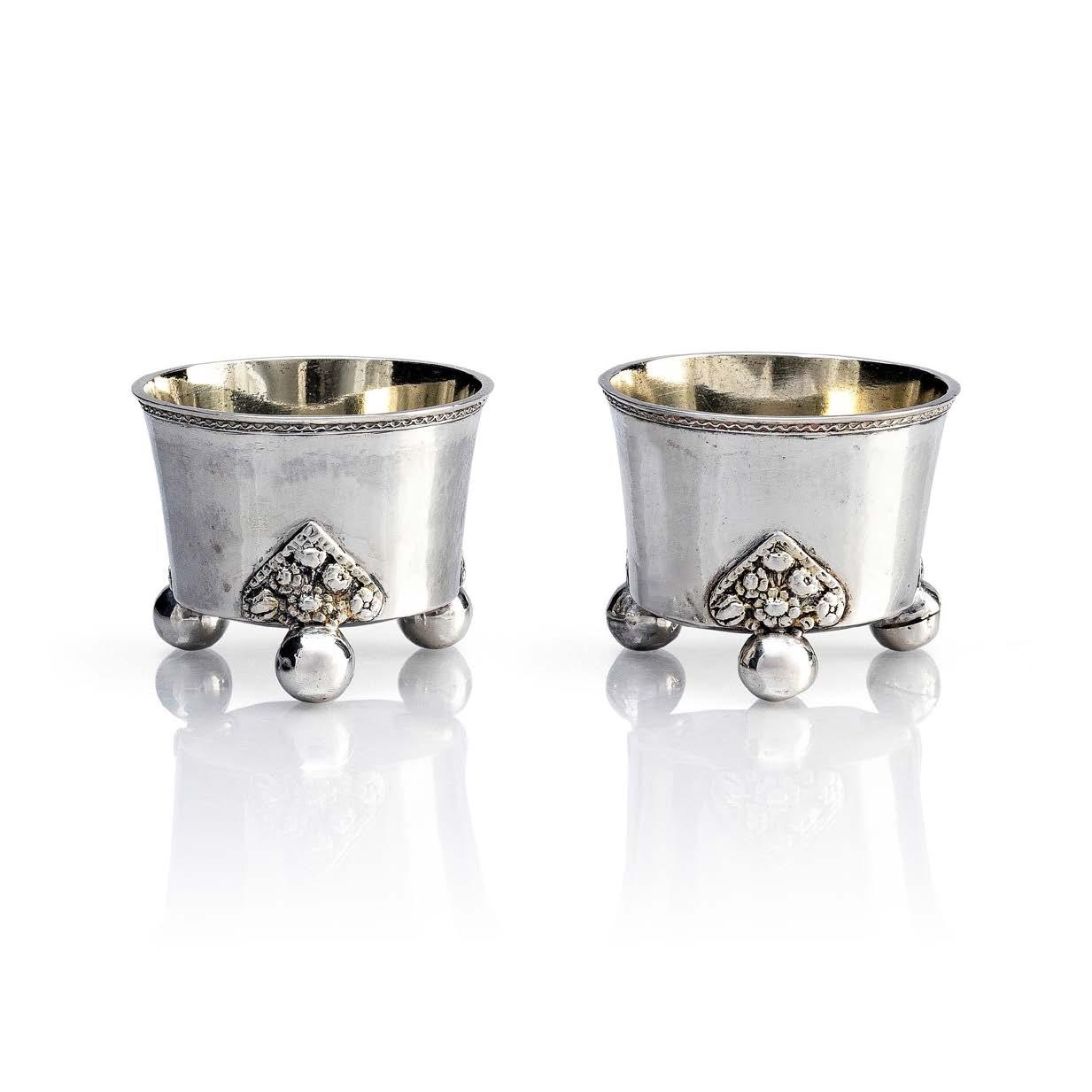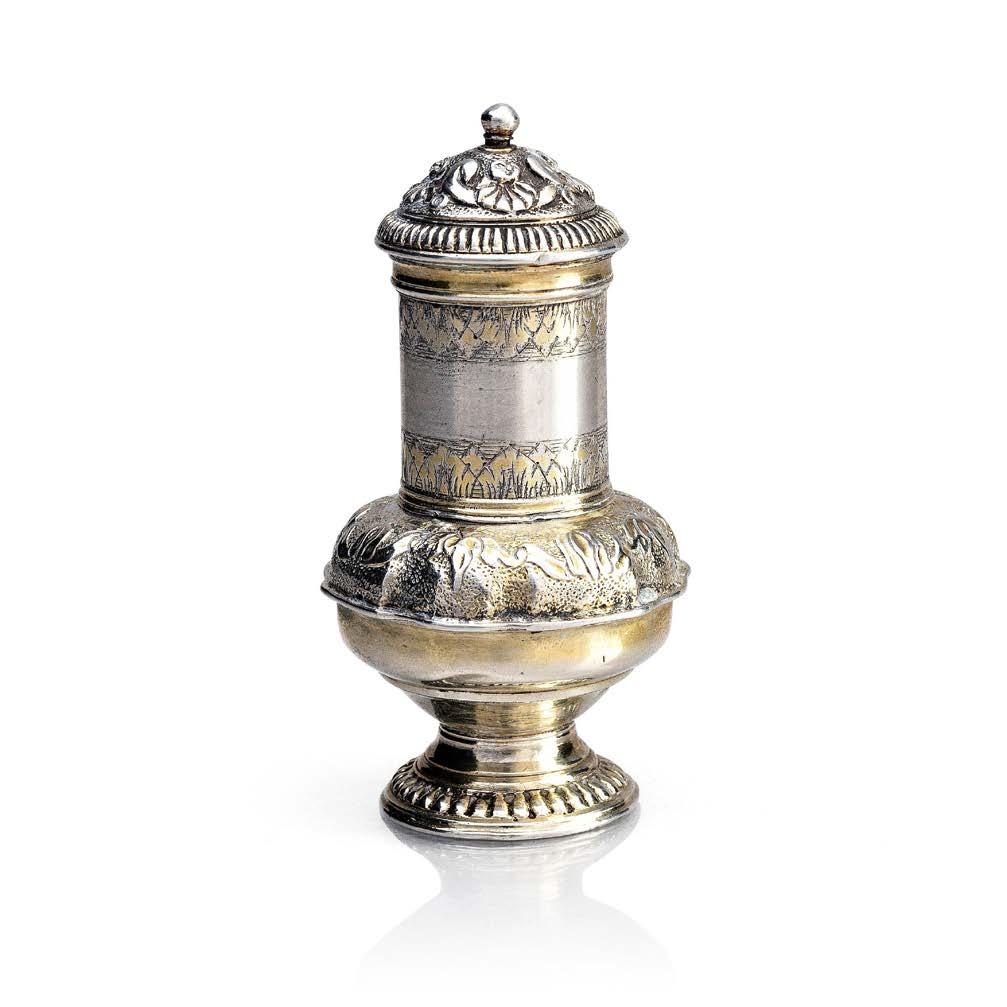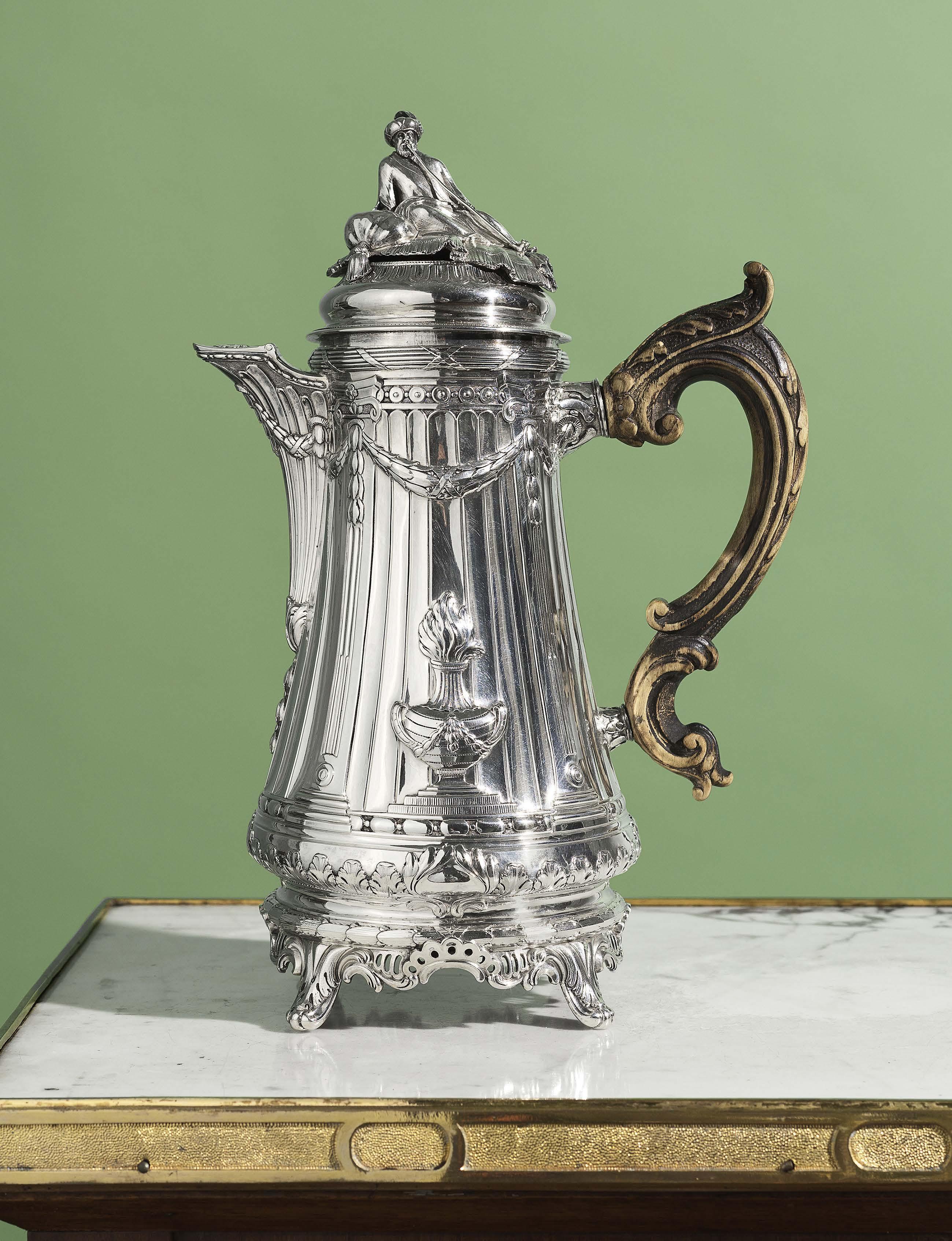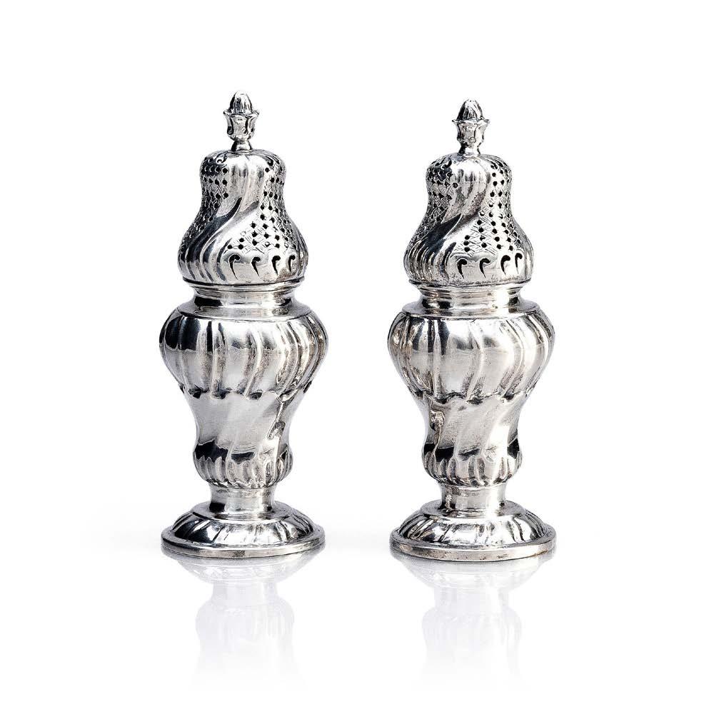 468. Kaffeservis, tre delar, silver, W.A. Bolin, Stockholm 1946. Rokokostil. Bestående av kaffekanna, gräddsnäcka och sockerskål. Invändigt förgyllda. Päronformad, på oval fot, rikligt dekorerad med blomsterornamentik och rocailler, locken med krönande bukett. Kaffekannans handtag i trä. Kannans höjd 27,5 cm.