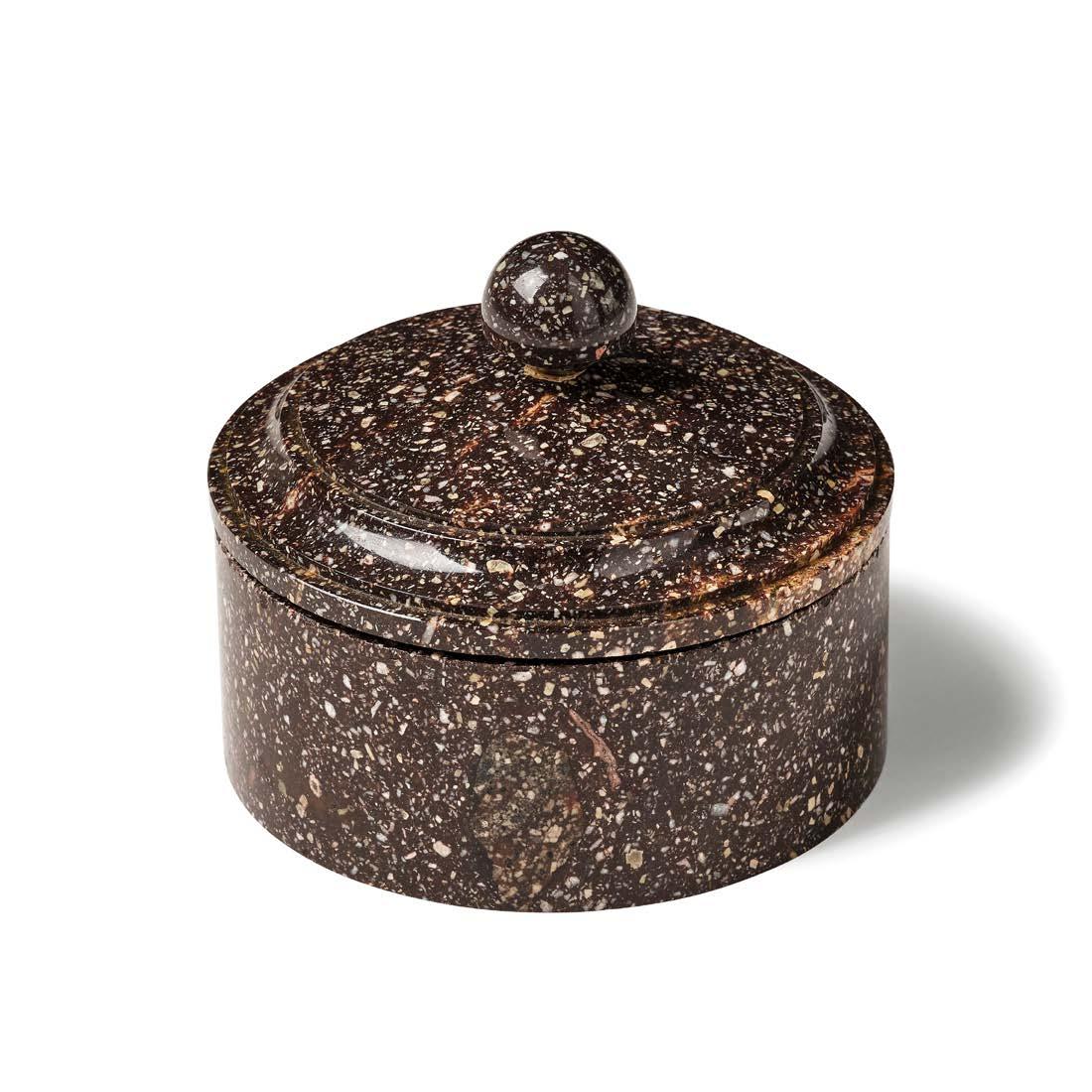 Avlång dosa av halvcylindrisk oval form med gångjärnslock, dekor i vit och svart champlevé emalj. Gåvoskrift: ’Ebon Strandin, Kungl. Teatern’ (Kungliga Teatern).