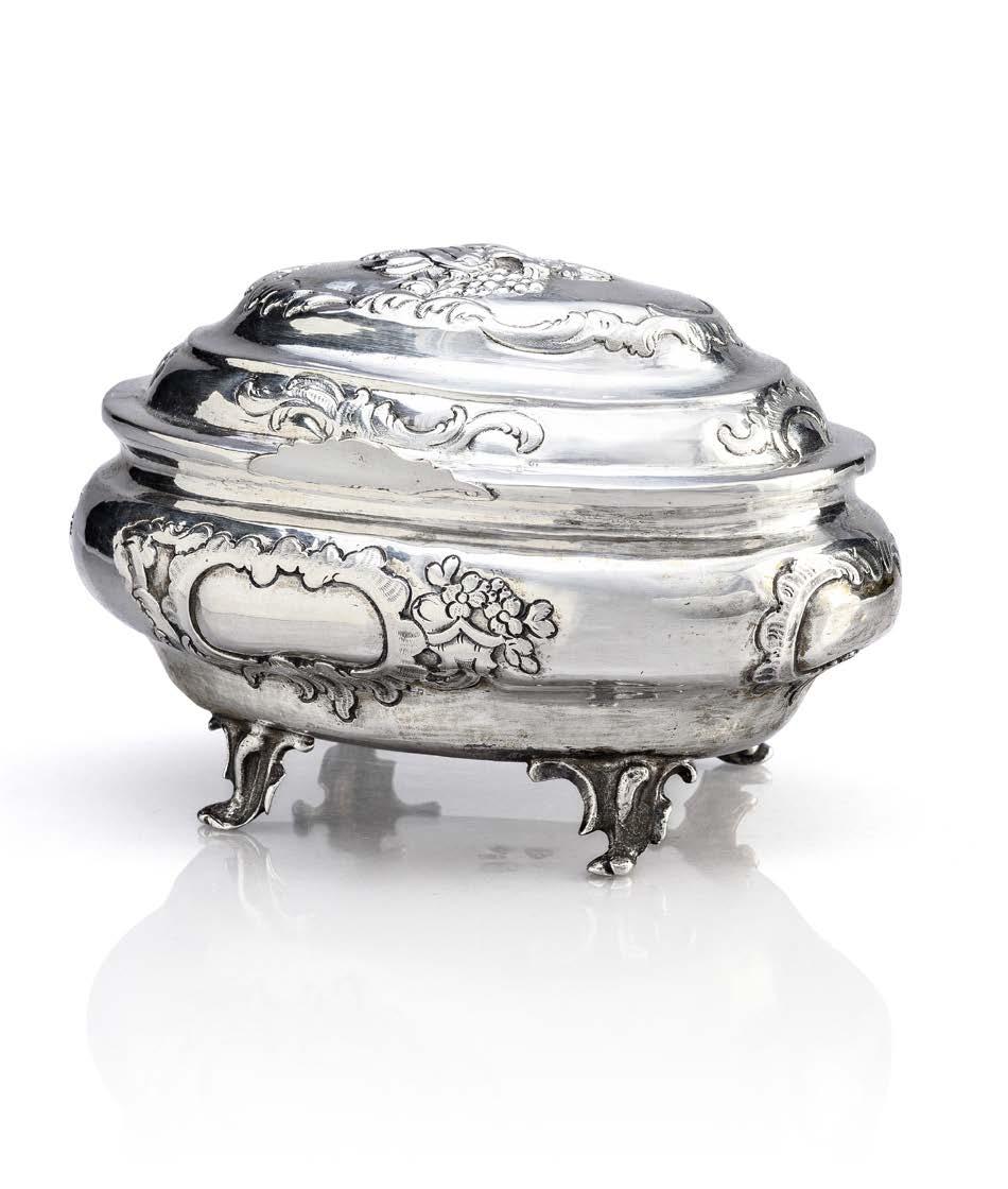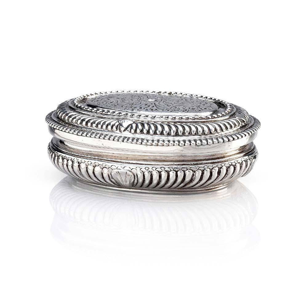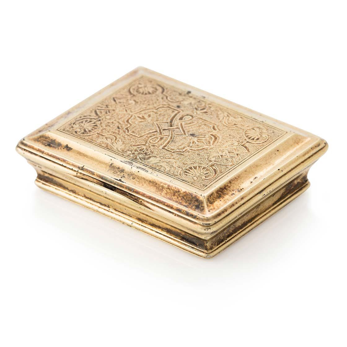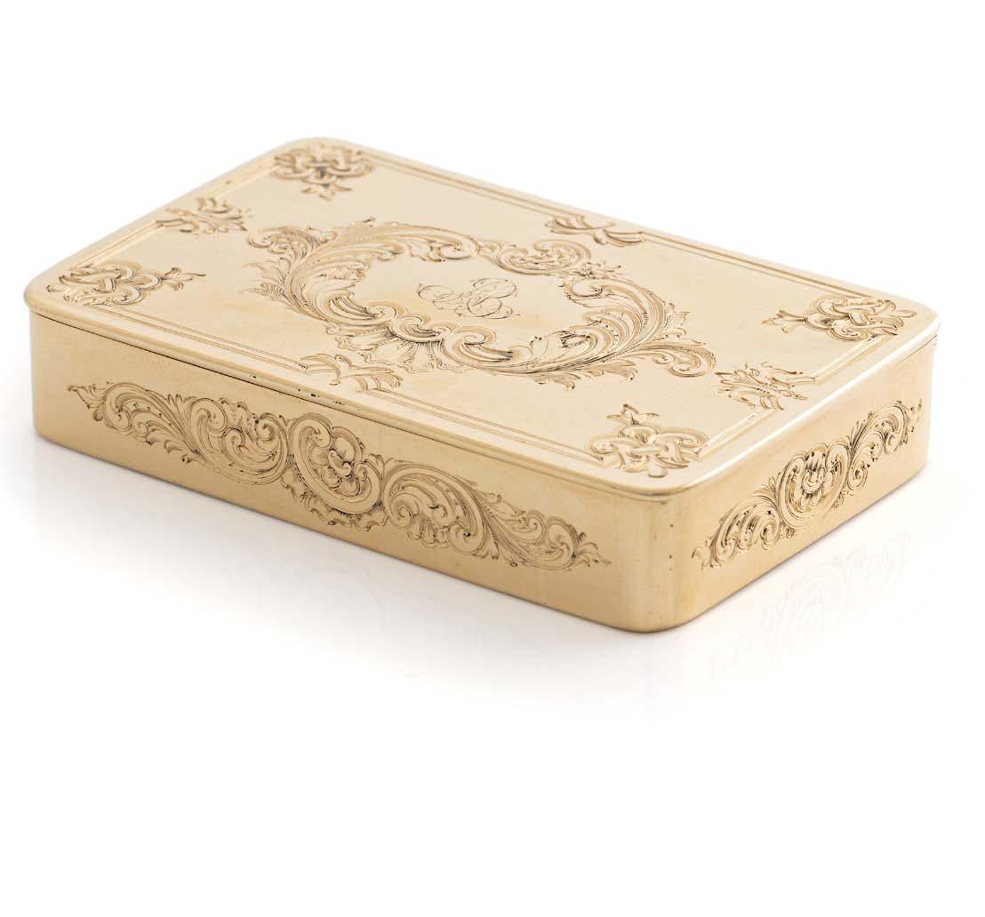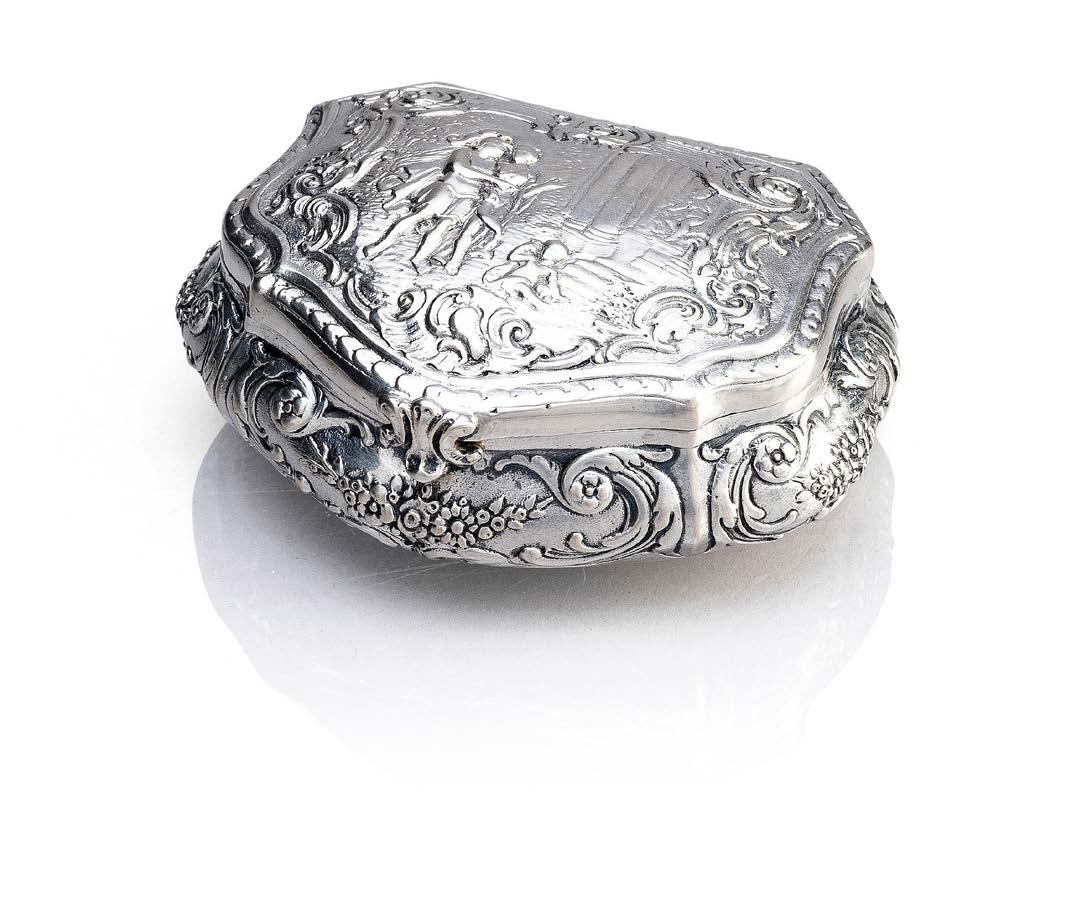 Rektangulär med insvängda sidor, fällocket med en rikt driven mytologisk scen, sidorna dekorerade med rocailleformade bårder med blommor, inuti en målad miniatyr under glas med ett rokokopar och Amor i ett landskap. Sannolikt tillverkad i norra Tyskland ca 1760. Försåld av Jahn & Bolin St. Petersburg i ett originalmonterat fodral märkt ’Jahn & Bolin Joaillier de la Cour A St Petersbourg’. C. 1840. Höjd 2,7 cm. Bredd 4,7 cm. Längd 5,9 cm. Vikt (utan glas) 64,1 g.