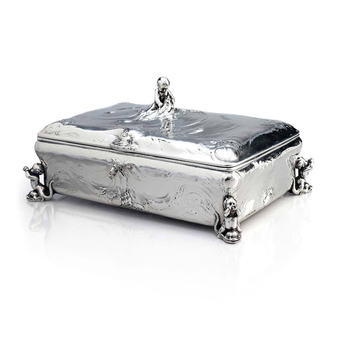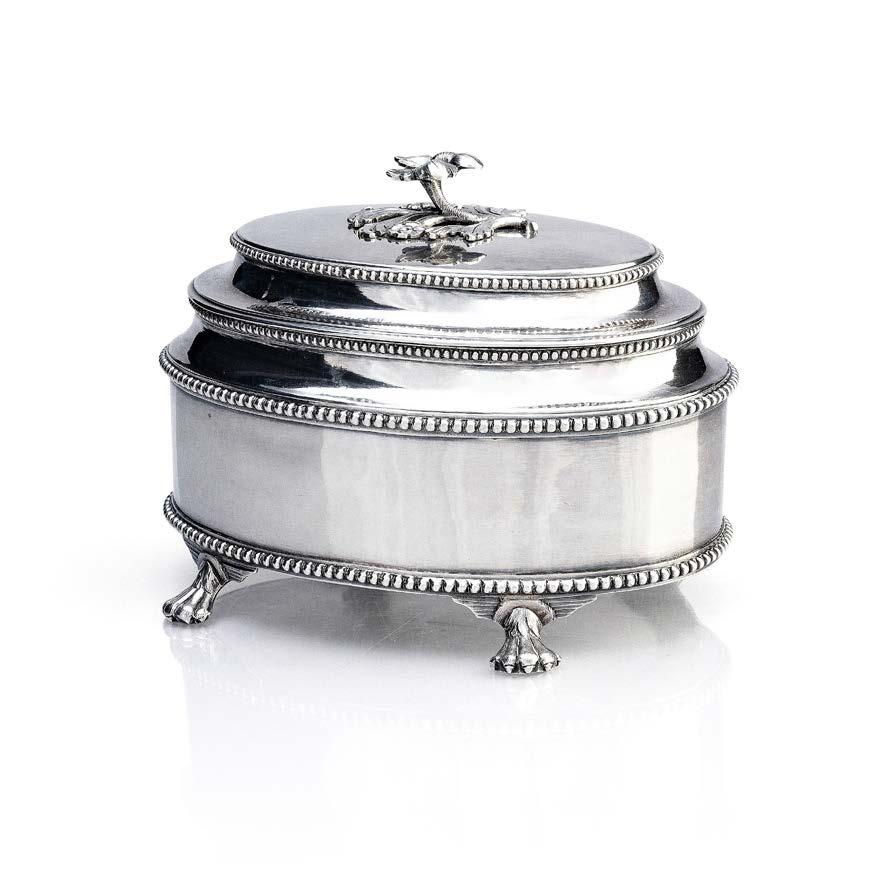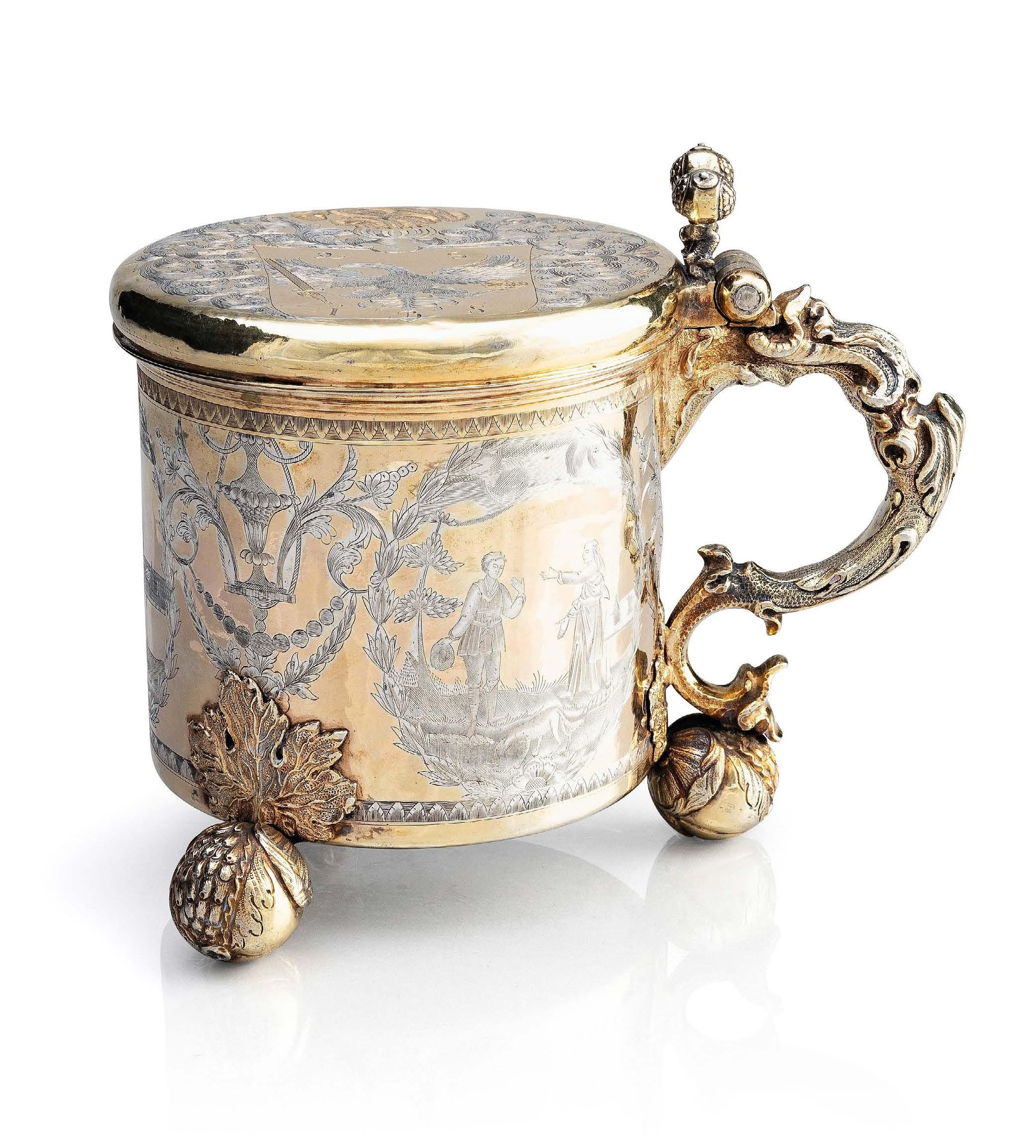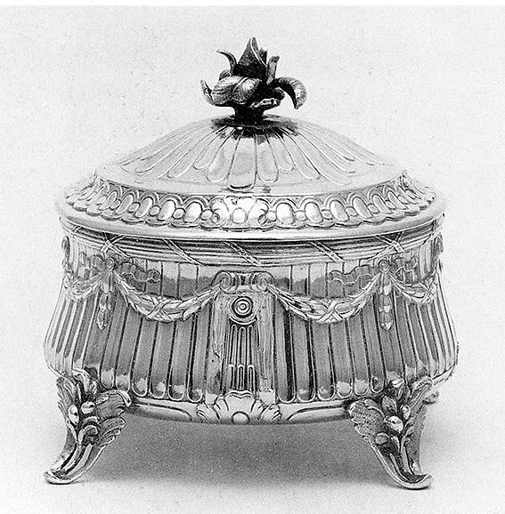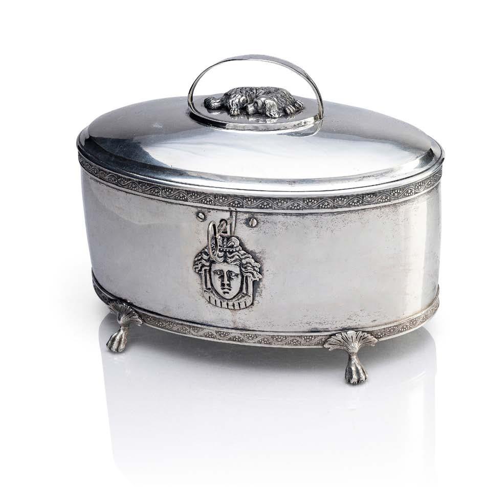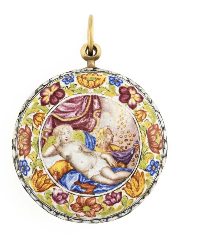 Rektangulär med insvängda sidor, fällocket med en rikt driven mytologisk scen, sidorna dekorerade med rocailleformade bårder med blommor, inuti en målad miniatyr under glas med ett rokokopar och Amor i ett landskap. Sannolikt tillverkad i norra Tyskland ca 1760. Försåld av Jahn & Bolin St. Petersburg i ett originalmonterat fodral märkt ’Jahn & Bolin Joaillier de la Cour A St Petersbourg’. C. 1840. Höjd 2,7 cm. Bredd 4,7 cm. Längd 5,9 cm. Vikt (utan glas) 64,1 g.