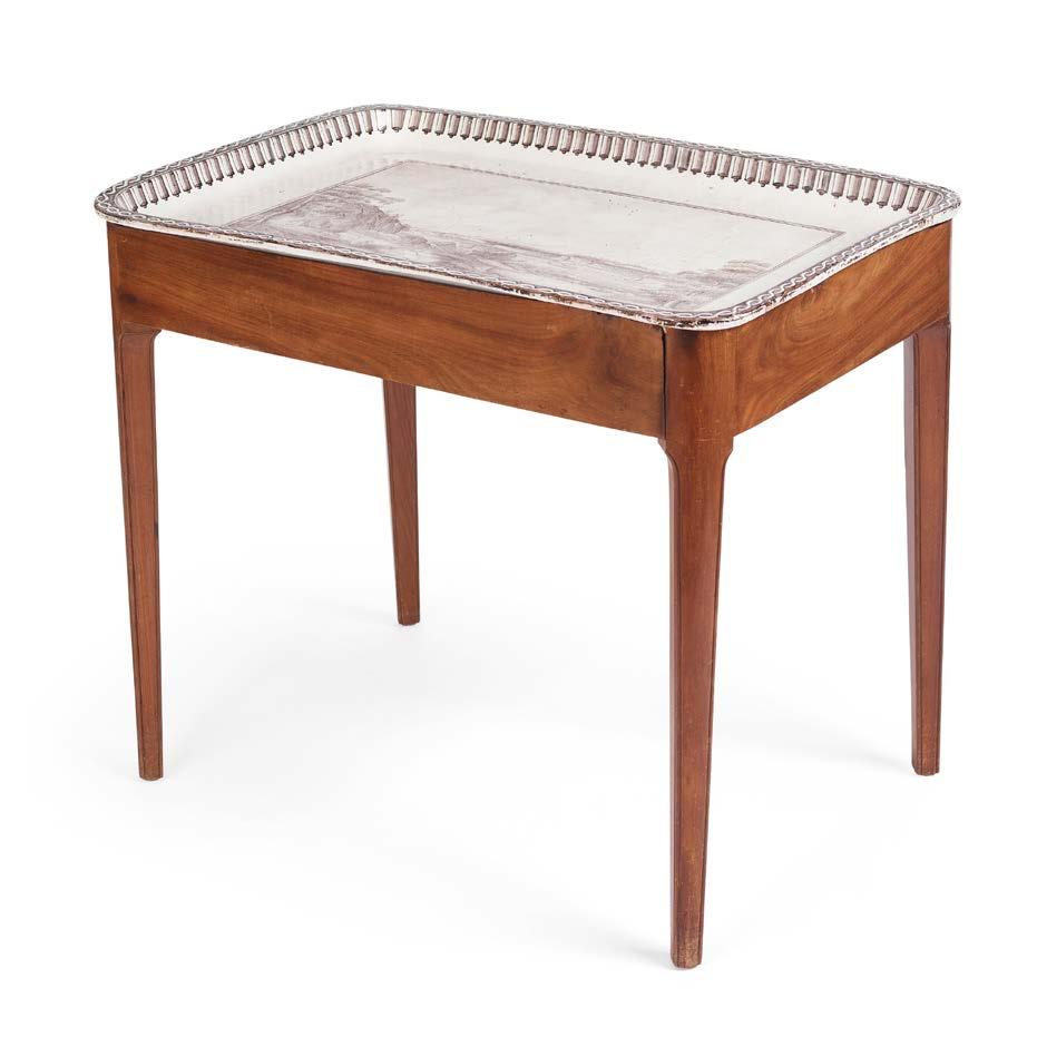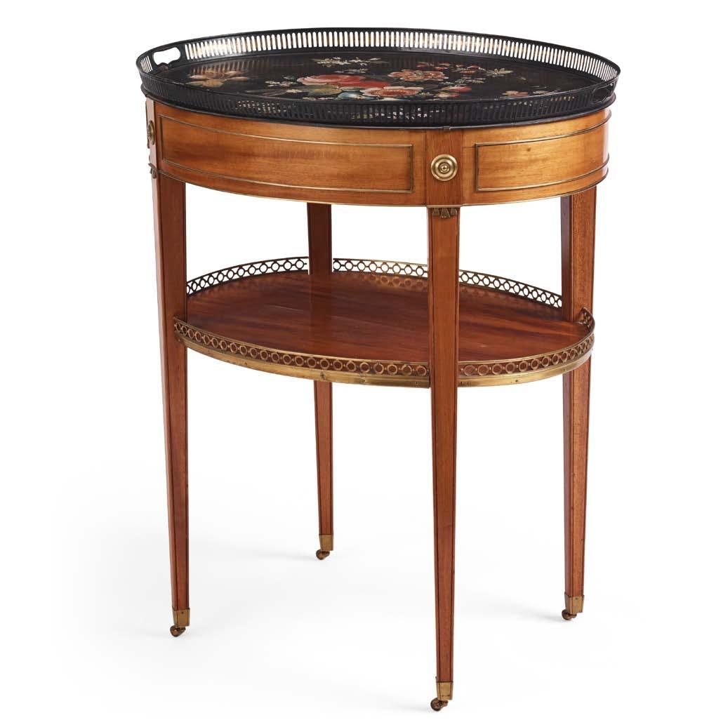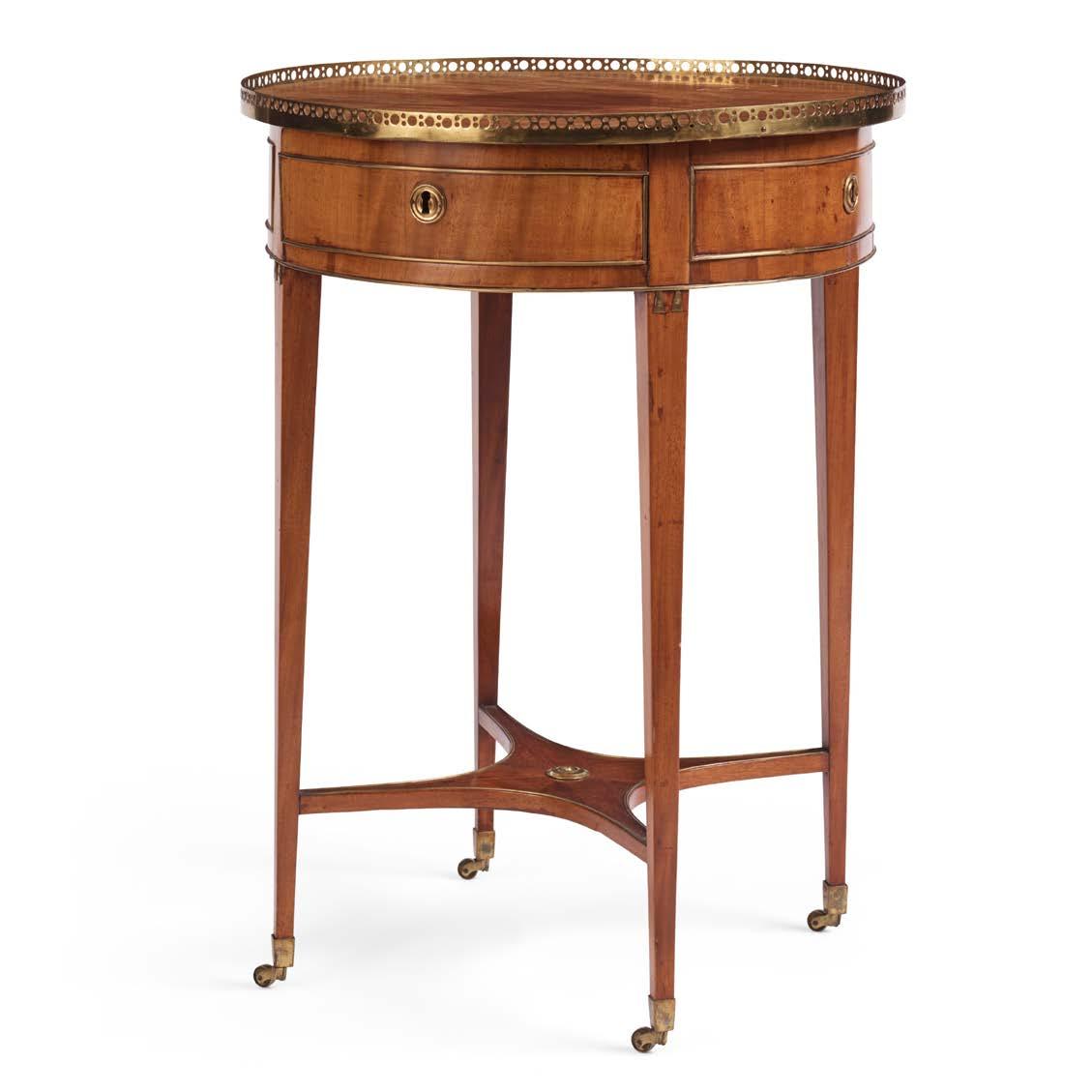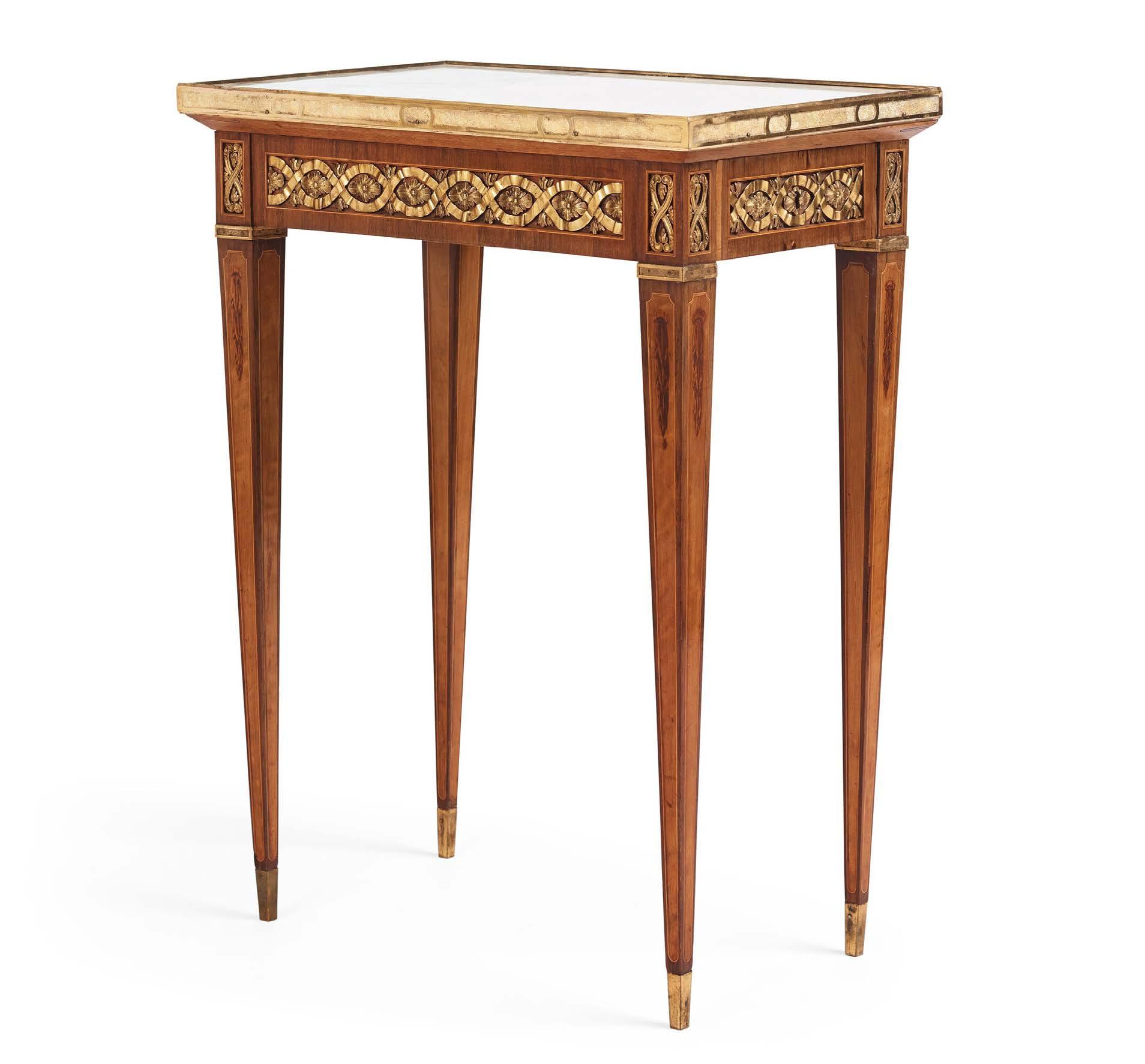 Fanerad med amarant, padouk, lönn, och färgat lövträ. Beslag och listverk av förgylld mässing. Rak form med snedställda hörn. Front med inläggningar av draperad lagergirland ovan fruktkorg. Tre lådor. Skiva av röd kalksten. Längd 74,5, bredd 46, höjd 84 cm.