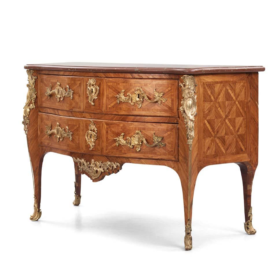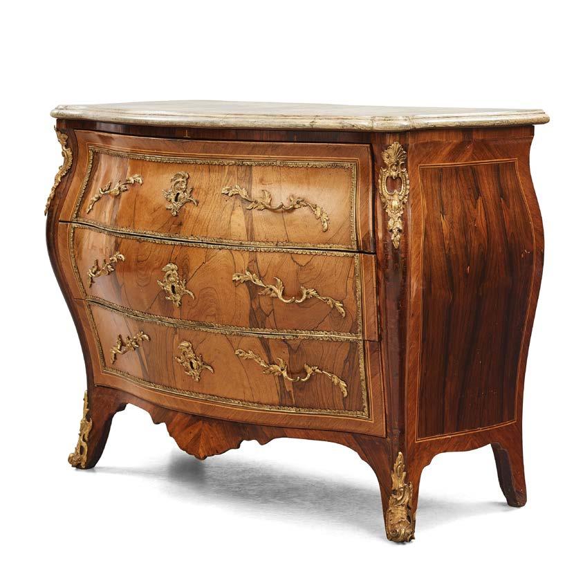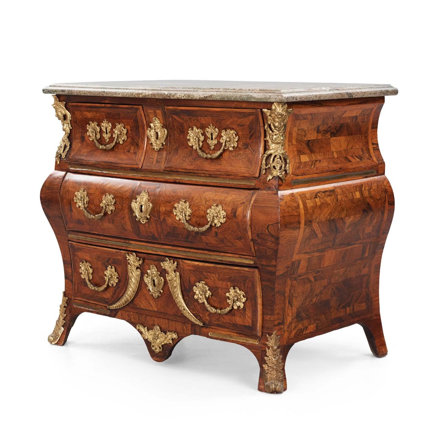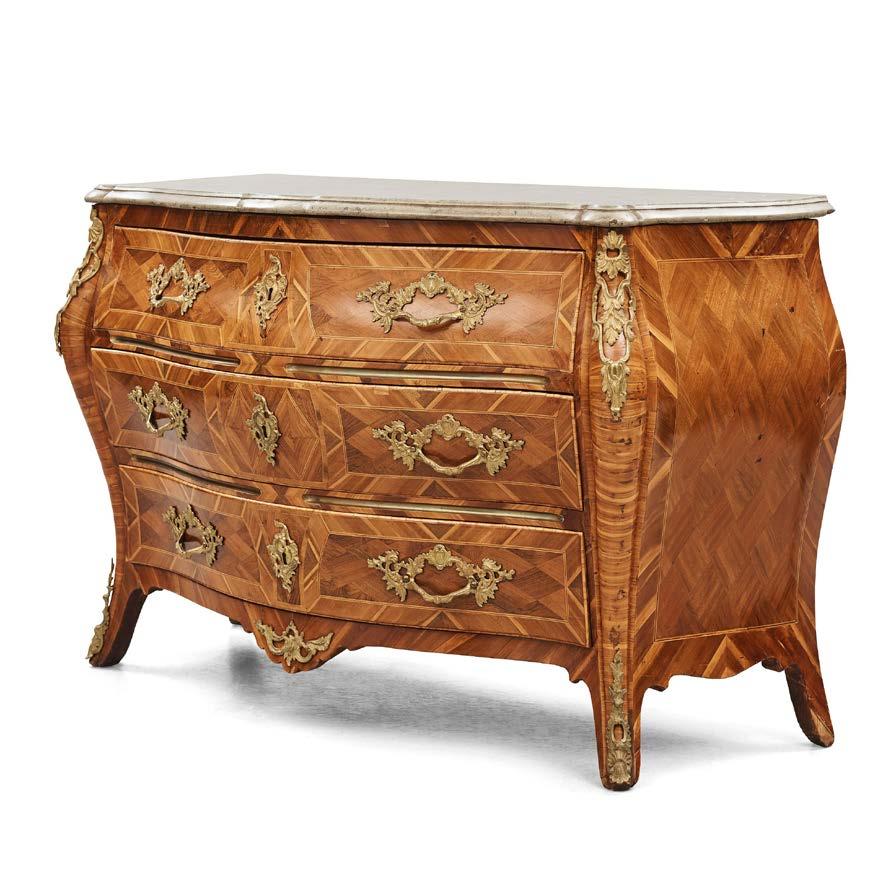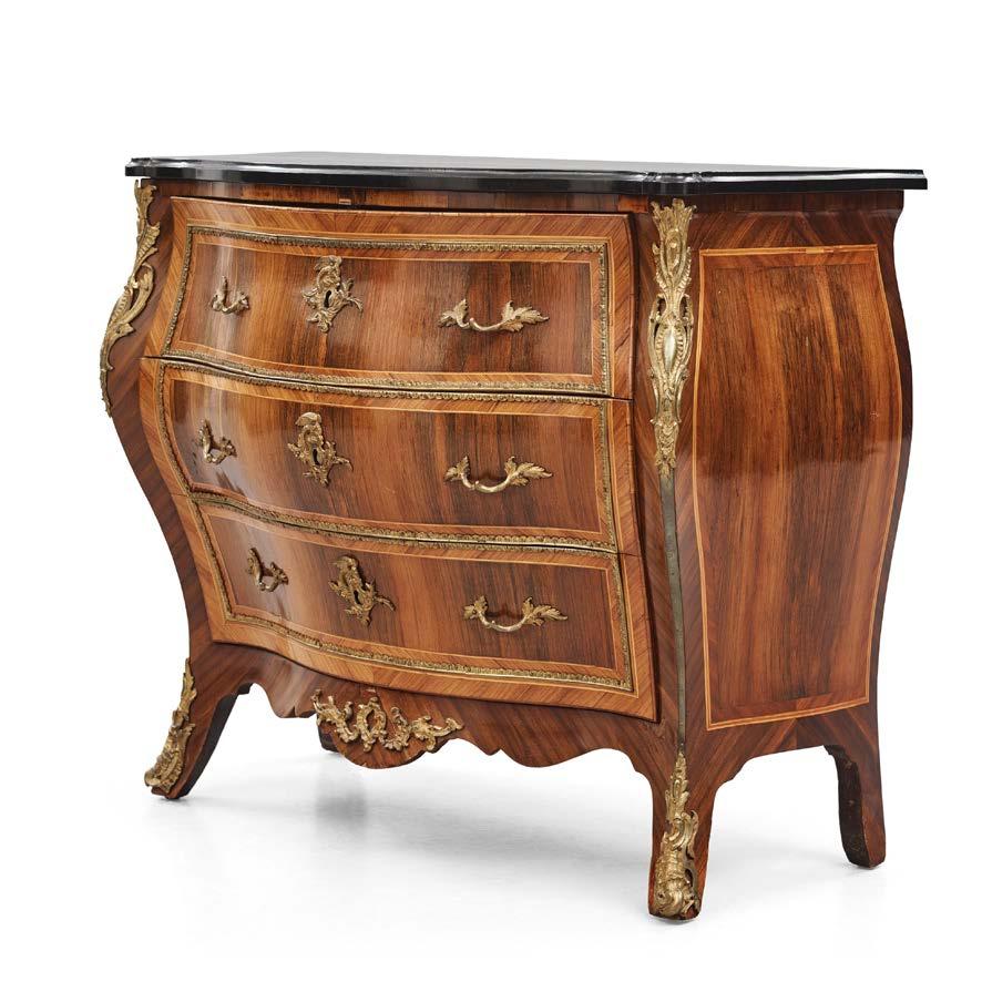 8. Byrå, av slottsverkstadskvalitet, sannolikt utförd av Samuel Pasch eller Johan Wulf, 1740-tal, tidig Rokoko. Så kallad ”Commode en Tombeau”. Fanerad med jakaranda och amarant i parkettläggning. Rik beslagsornamentik i förgylld brons. Listverk av förgylld mässing. Svängd bukig form. Inredning av fyra lådor i tre lådvarv. Skiva av kolmårdsmarmor. Längd 97, bredd 66, höjd 85 cm.