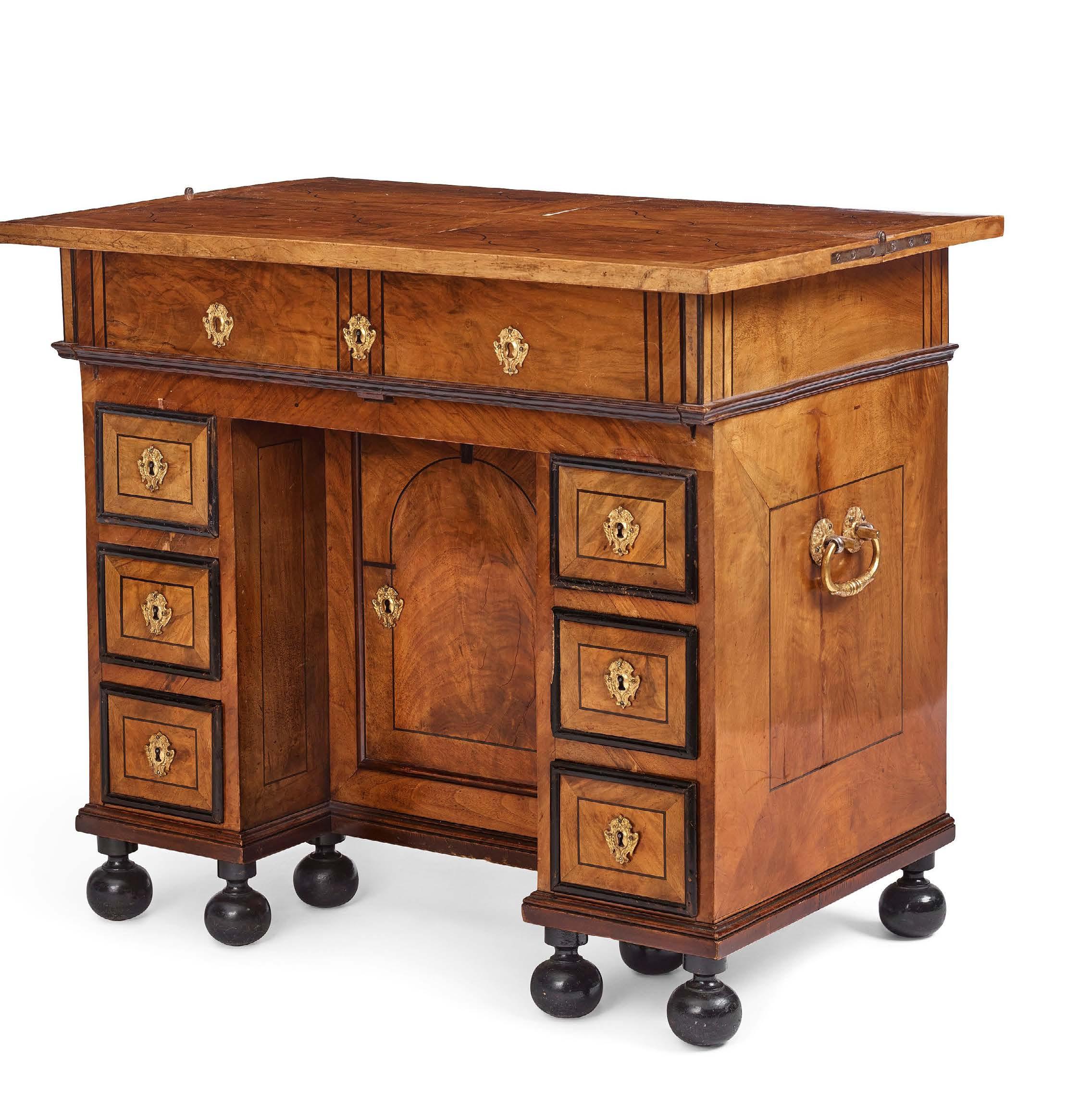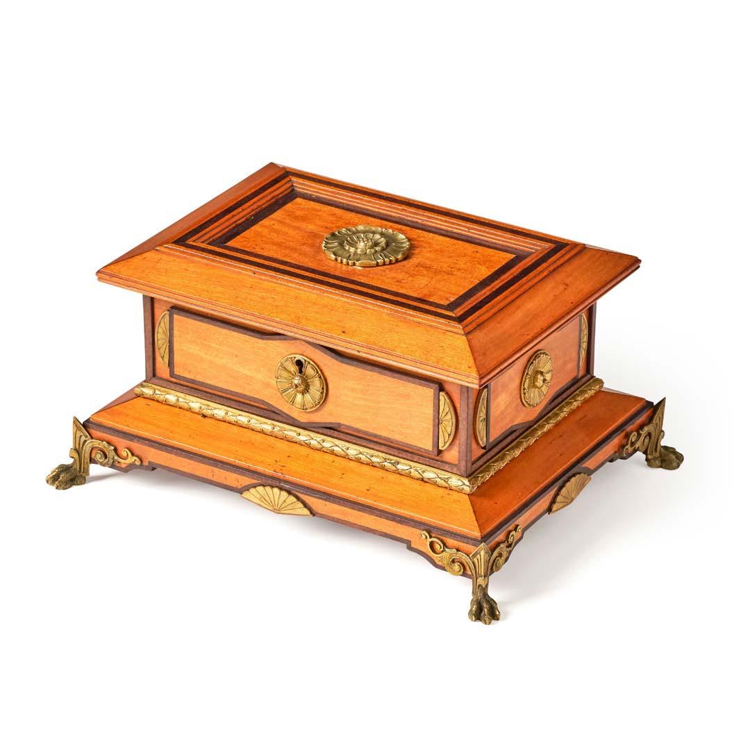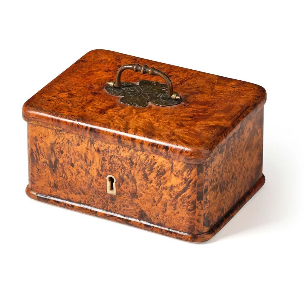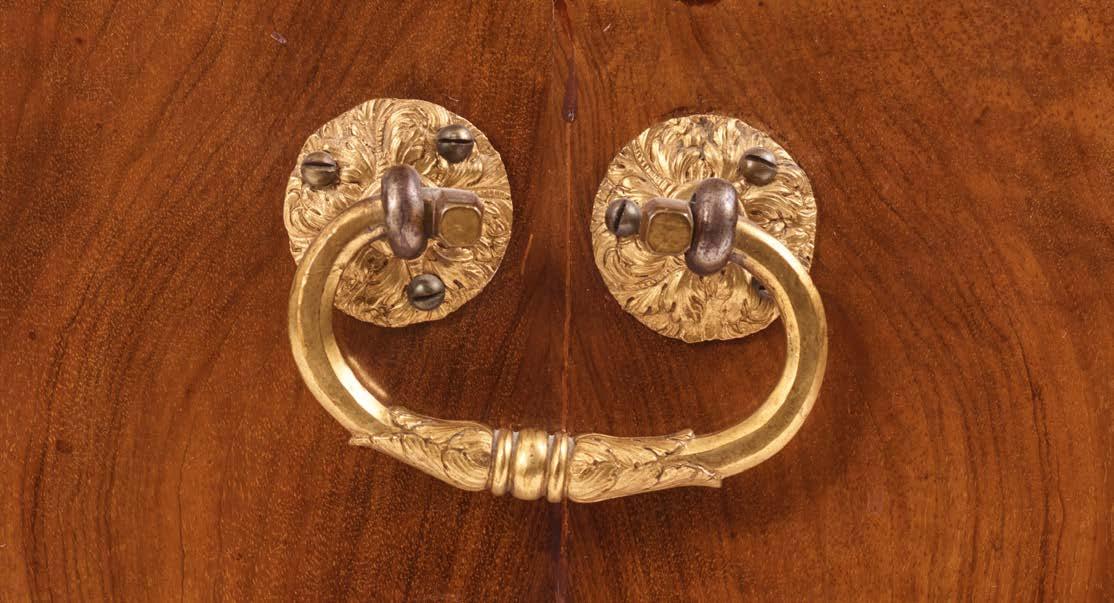 Fanerat med valnöt med ådror av lönn. Beslag av förgylld mässing.