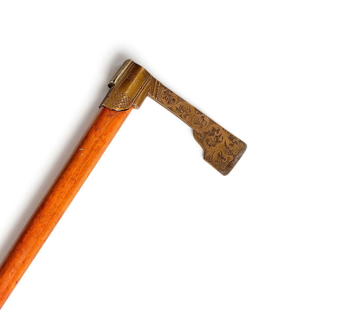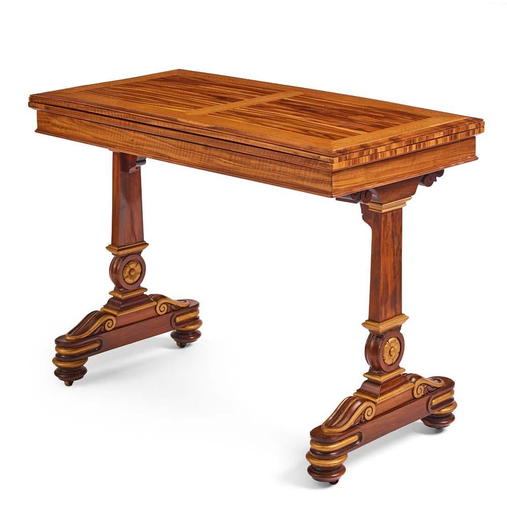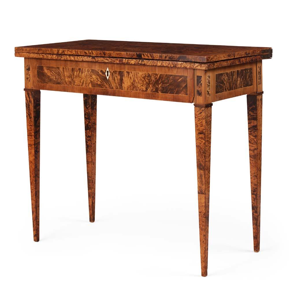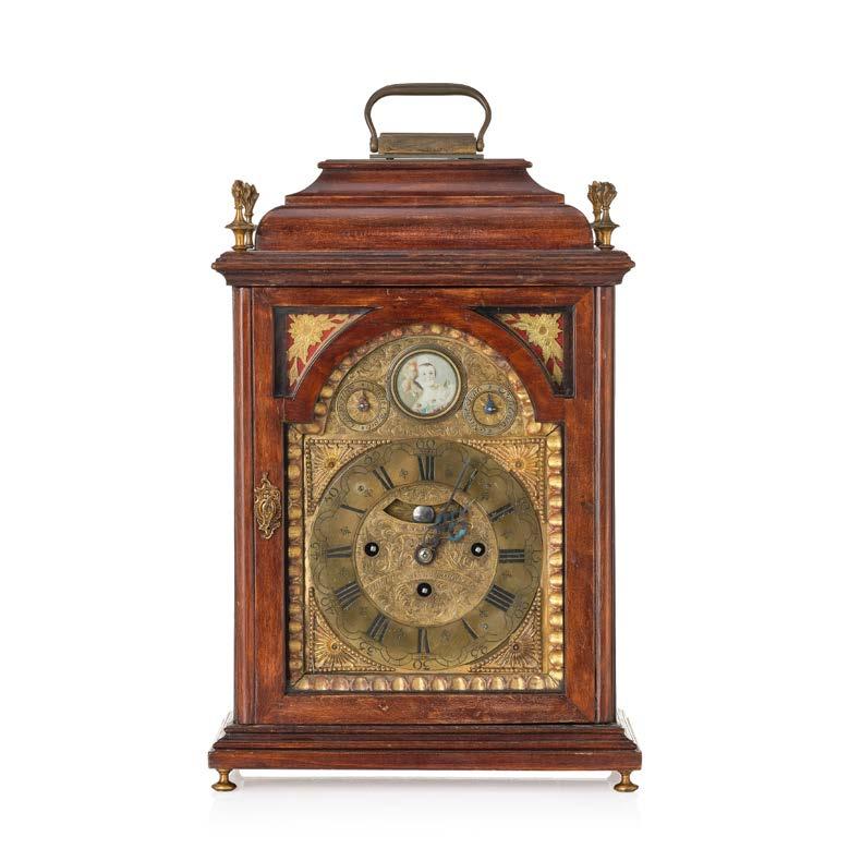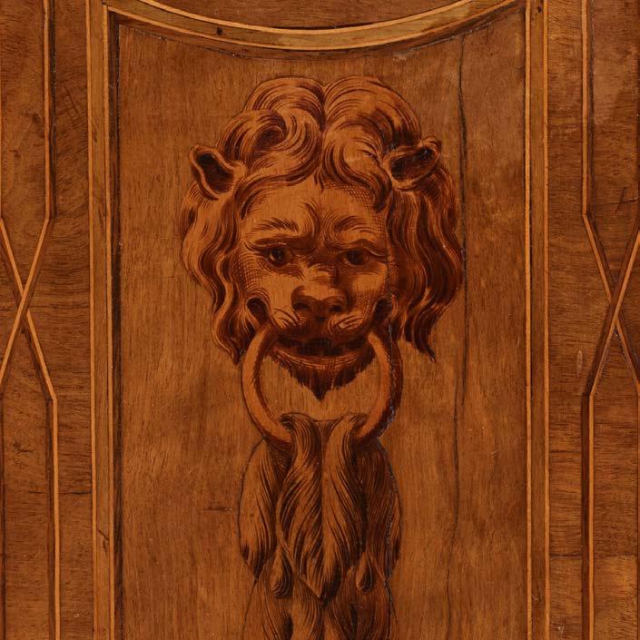 Fanerat med valnöt med ådror av lönn. Beslag av förgylld mässing.