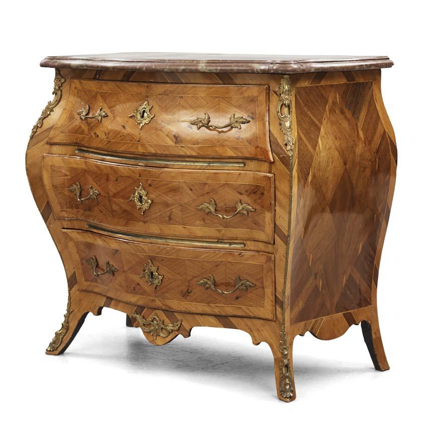 12. Byrå, av Petter Gyllenberg (mästare i Stockholm 1767–85), Rokoko. Fanerad med rosenträ, amarant, valnöt, plommon, alm. Inläggningar i rutor och fält. Beslag och listverk av förgylld mässing. Tre lådor. Skiva av röd kalksten. Signerad PGB på lådkanten. Längd 95, bredd 52, höjd 84 cm. Nyckel medföljer.