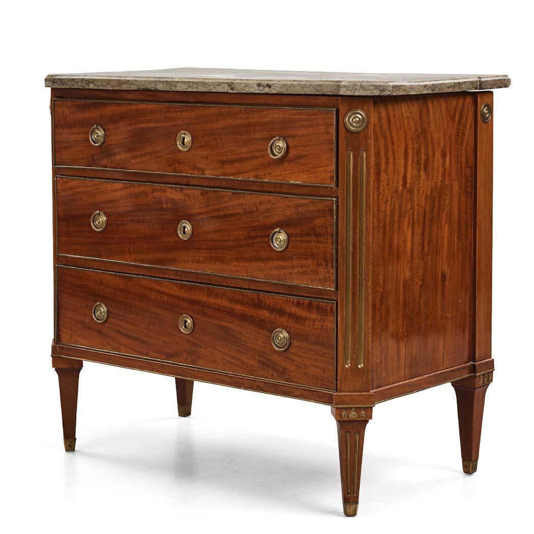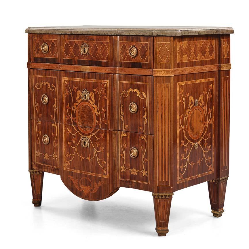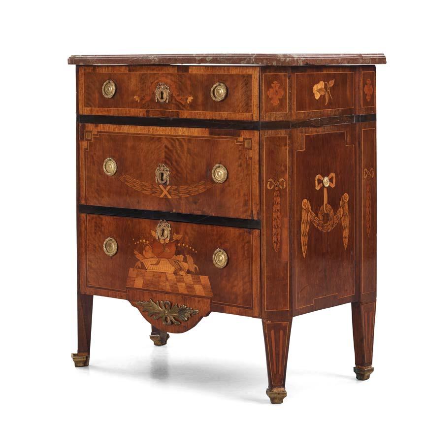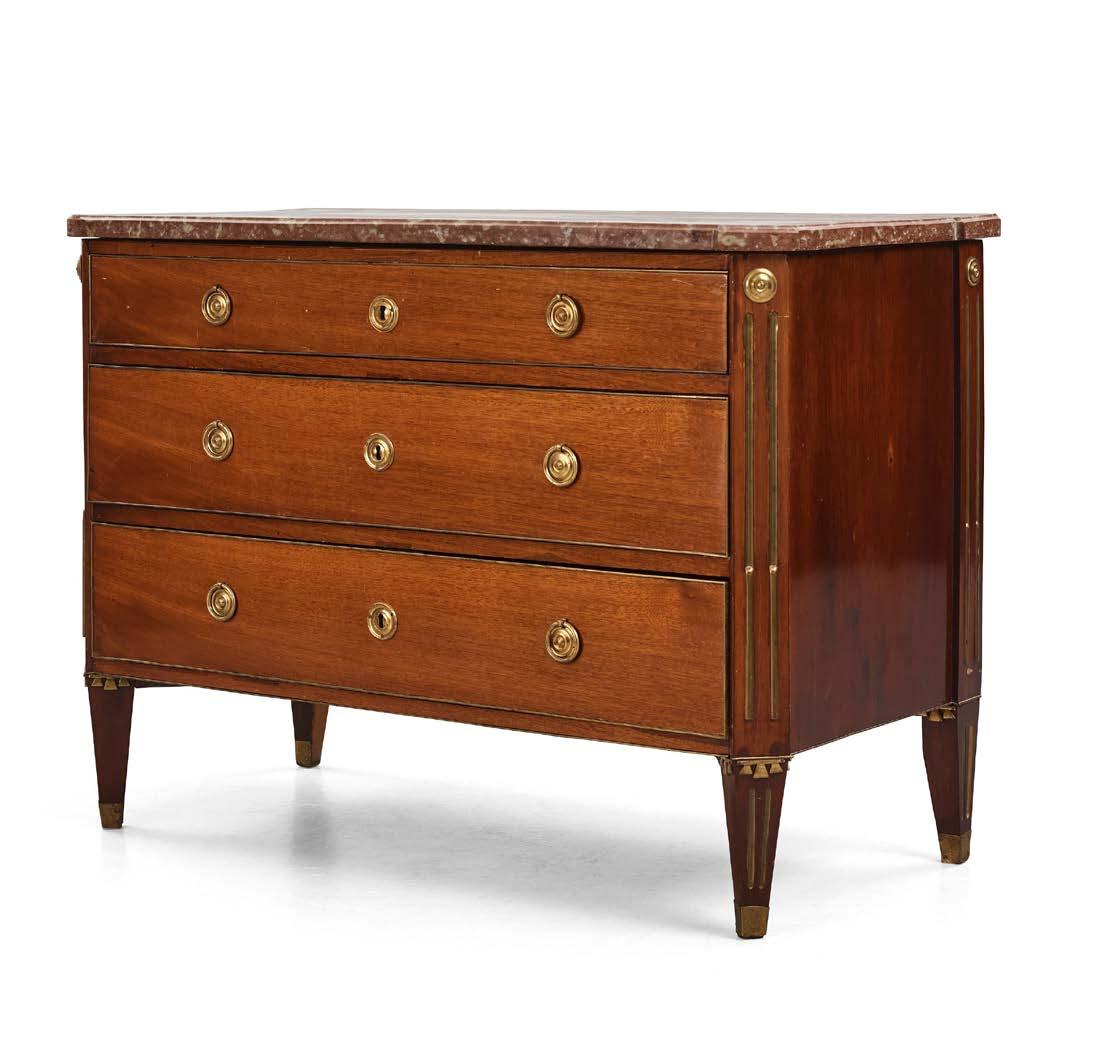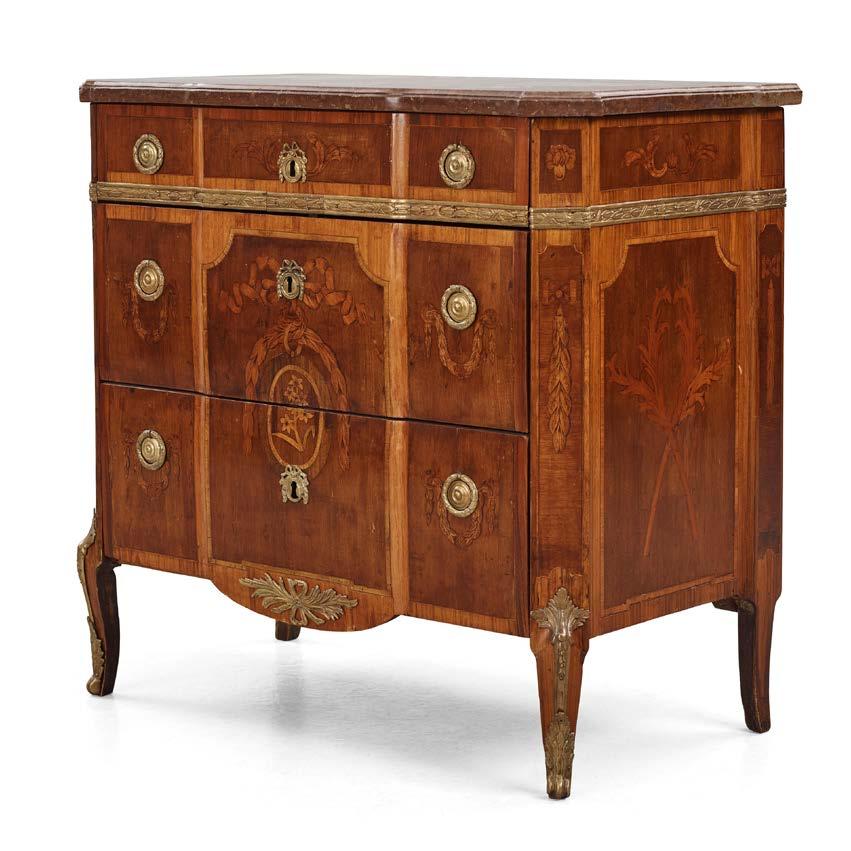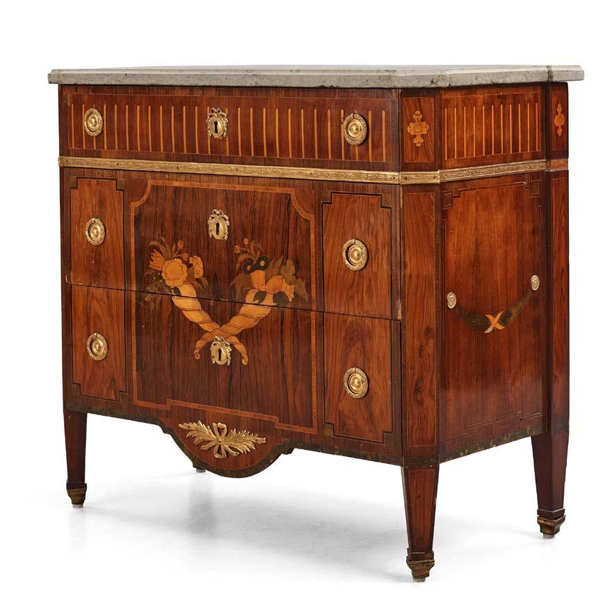 17. Byrå, av Nils Petter Stenström (mästare i Stockholm 1782–90), Gustaviansk. Fanerad med jakaranda, amarant, mahogny, lönn och färgat lövträ. Beslag av förgylld brons. Rak form med snedställda hörn. Rika inläggningar med dekor av färgat vax. Samkomponerad front med en nedsänkt fris av fleuroner inom grillageverk ovan musiktrofé, flankerat av draperingar och inom geometriska inramningar med dekor av pärlor, romber och flikade blad, sidostycken med dekor av blomsterkvistar. Tre lådor. Skiva av grå kalksten. Längd 106, bredd 56,5, höjd 85 cm.