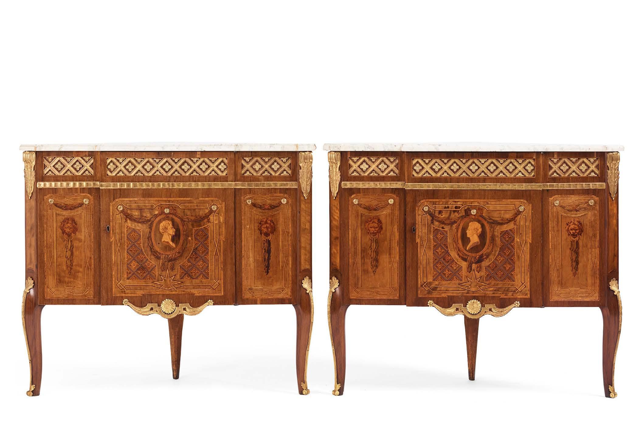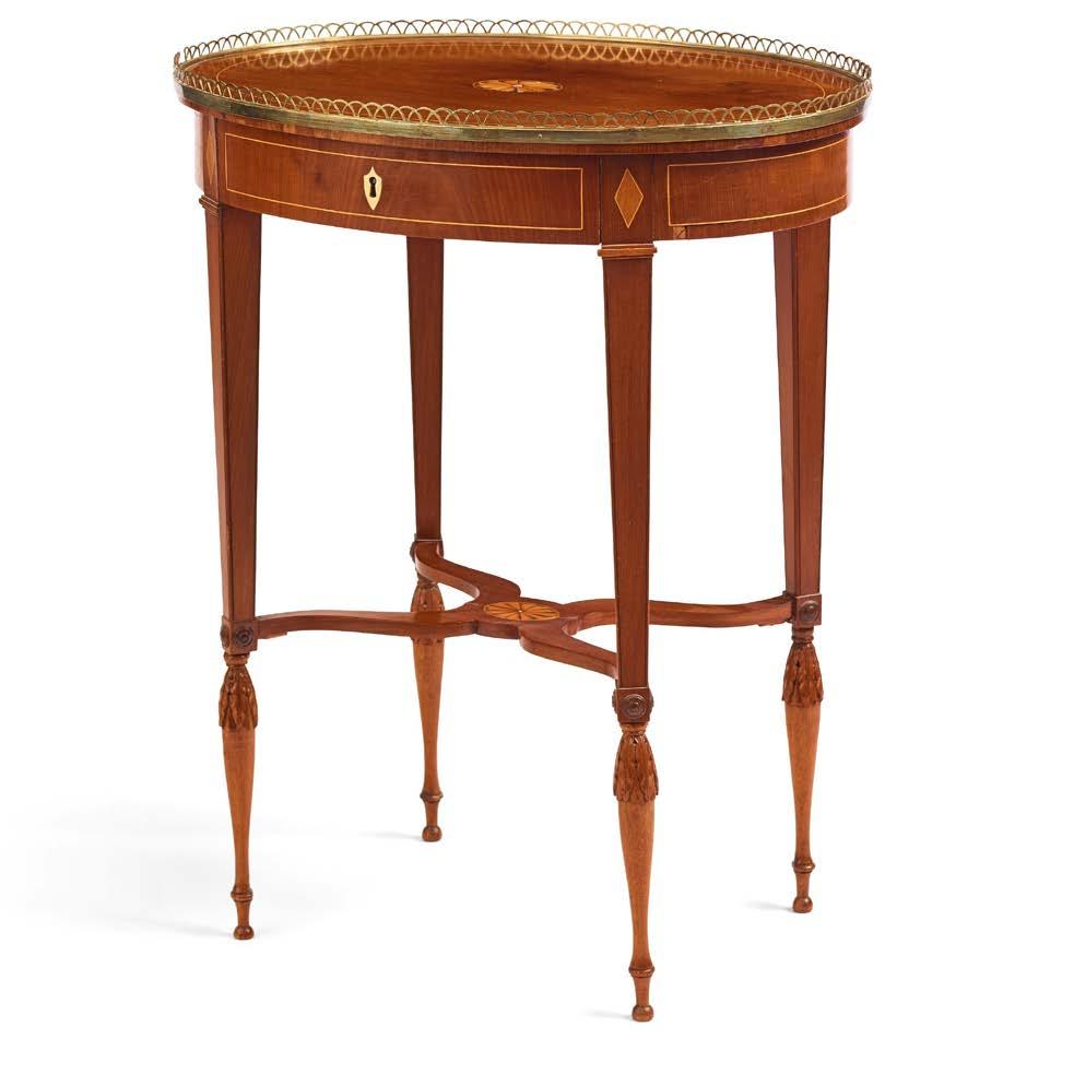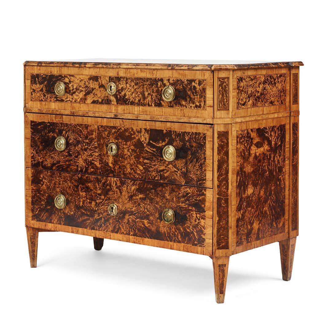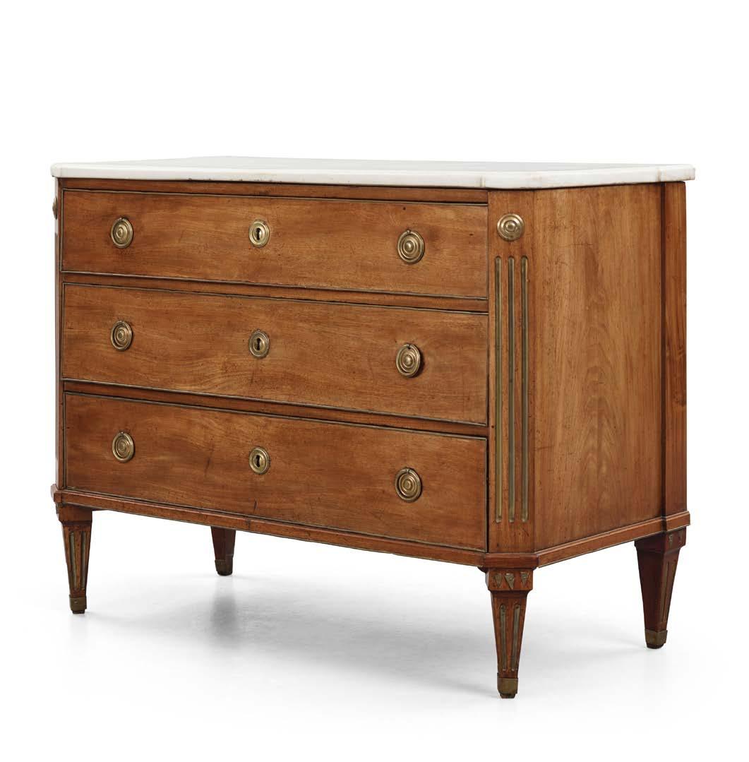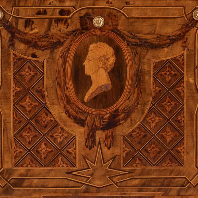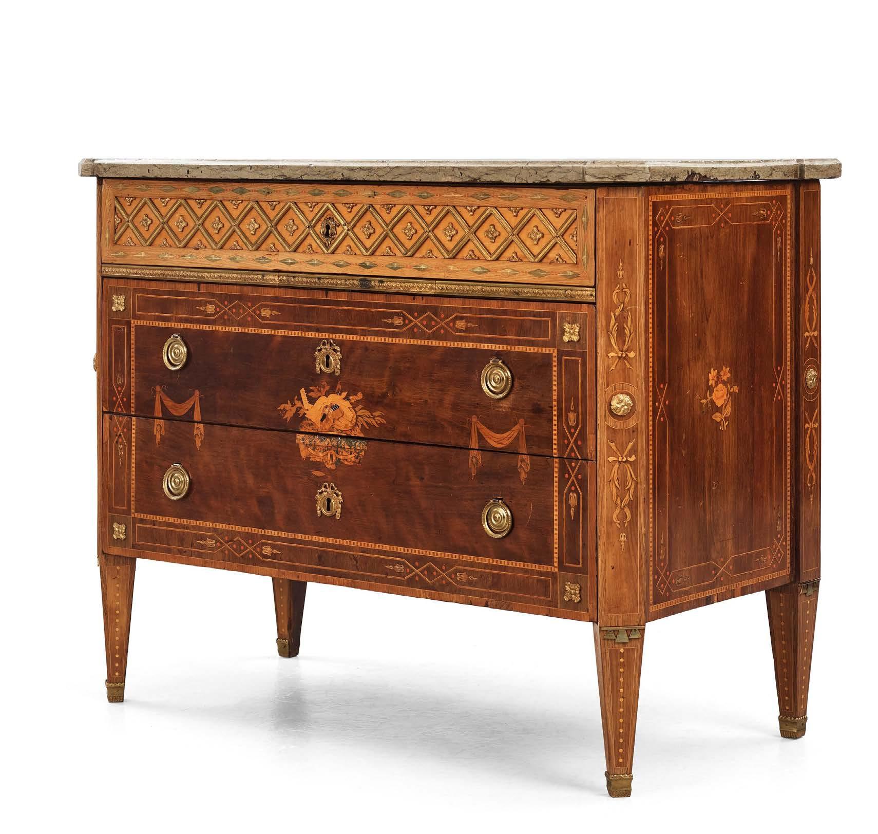 17. Byrå, av Nils Petter Stenström (mästare i Stockholm 1782–90), Gustaviansk. Fanerad med jakaranda, amarant, mahogny, lönn och färgat lövträ. Beslag av förgylld brons. Rak form med snedställda hörn. Rika inläggningar med dekor av färgat vax. Samkomponerad front med en nedsänkt fris av fleuroner inom grillageverk ovan musiktrofé, flankerat av draperingar och inom geometriska inramningar med dekor av pärlor, romber och flikade blad, sidostycken med dekor av blomsterkvistar. Tre lådor. Skiva av grå kalksten. Längd 106, bredd 56,5, höjd 85 cm.
