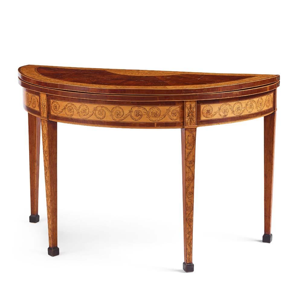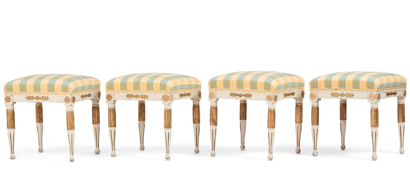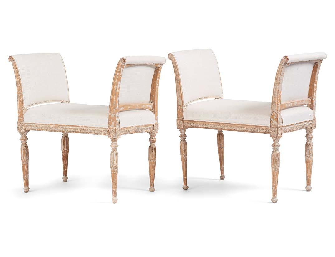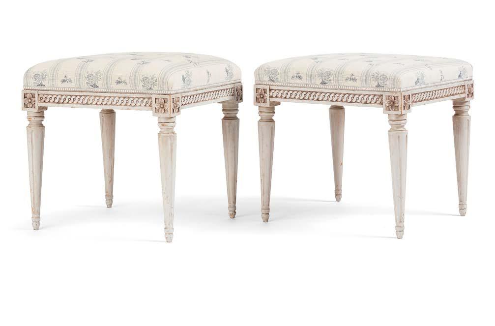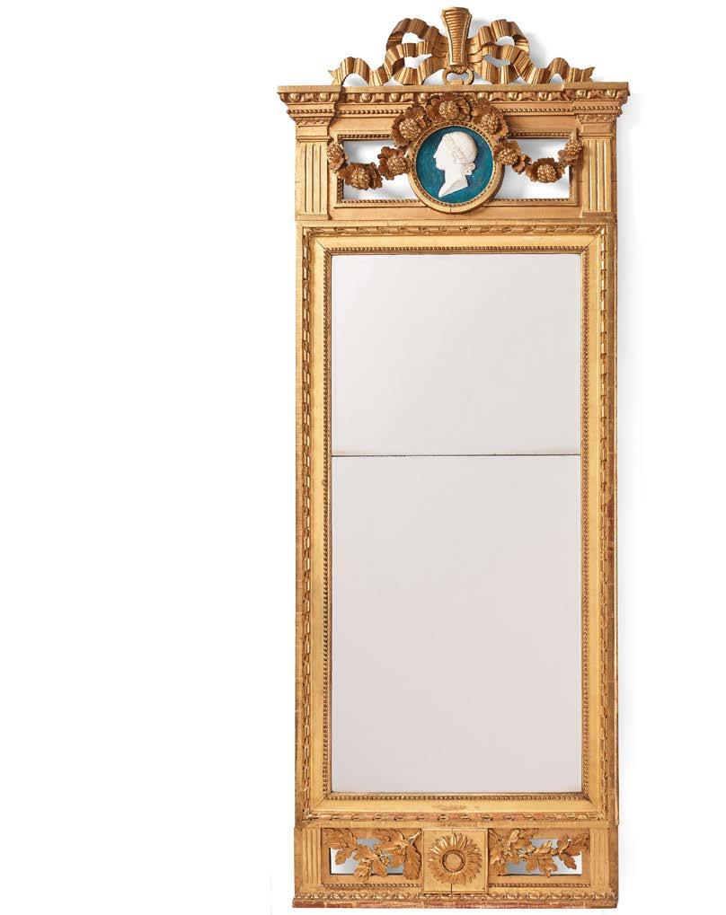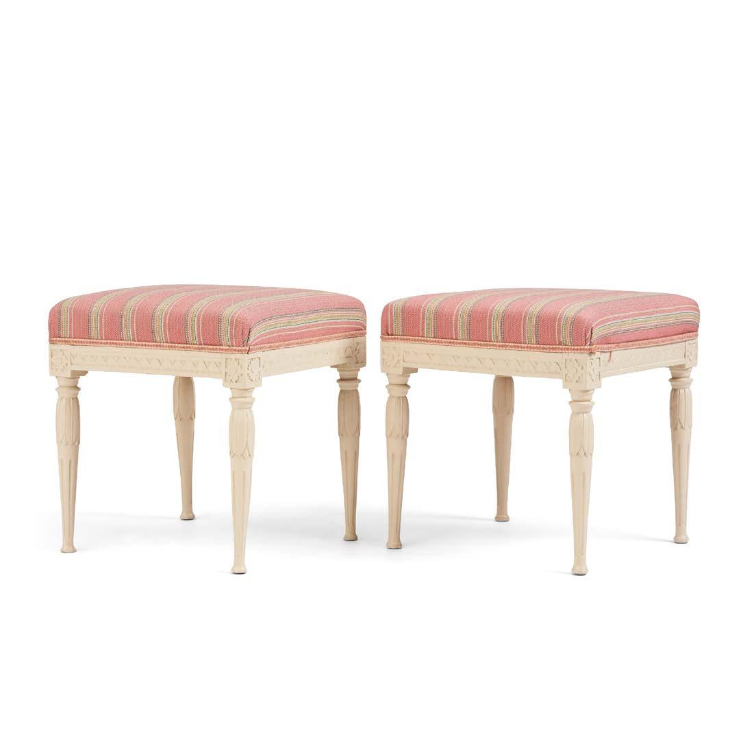17. Byrå, av Nils Petter Stenström (mästare i Stockholm 1782–90), Gustaviansk. Fanerad med jakaranda, amarant, mahogny, lönn och färgat lövträ. Beslag av förgylld brons. Rak form med snedställda hörn. Rika inläggningar med dekor av färgat vax. Samkomponerad front med en nedsänkt fris av fleuroner inom grillageverk ovan musiktrofé, flankerat av draperingar och inom geometriska inramningar med dekor av pärlor, romber och flikade blad, sidostycken med dekor av blomsterkvistar. Tre lådor. Skiva av grå kalksten. Längd 106, bredd 56,5, höjd 85 cm.