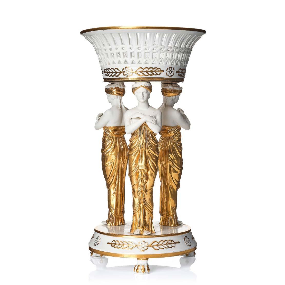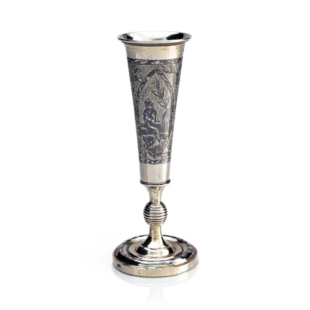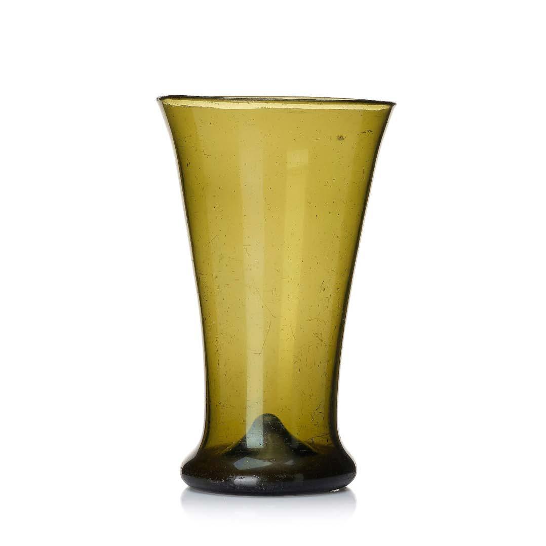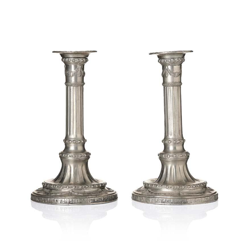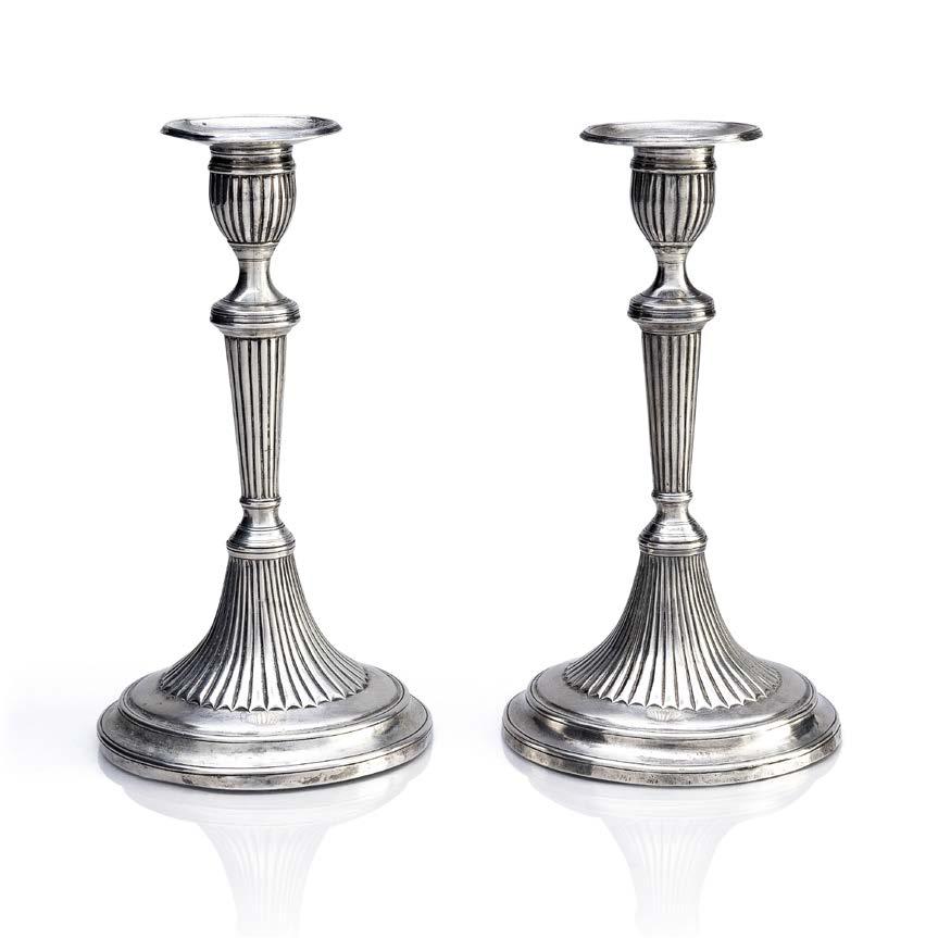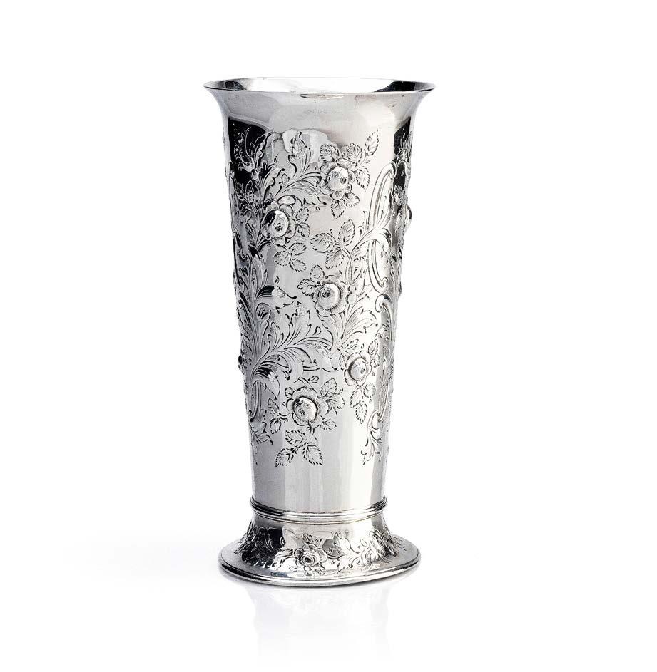 Konande modell nedåt avsmalnande på rund fot, dekor i form av blad. Höjd 30 cm. Total vikt 1809 g.