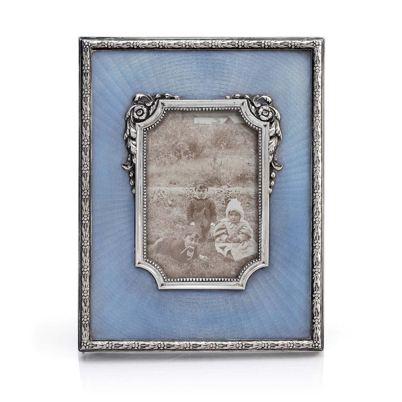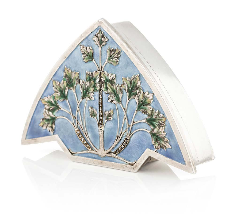 En juvelprydd och emaljerad silversnusdosa i Art Nouveau med tre färger opak emalj. Pilformad. Locket med gångjärn är dekorerat med grenar i silver med diamantprydda stjälkar och gröna emaljerade lövverk mot opak himmelsblå emaljerad botten, märkt på insidan av locket och basen. Mått 8,7 x 5,6 x 1,9 cm. Vikt 94 g.