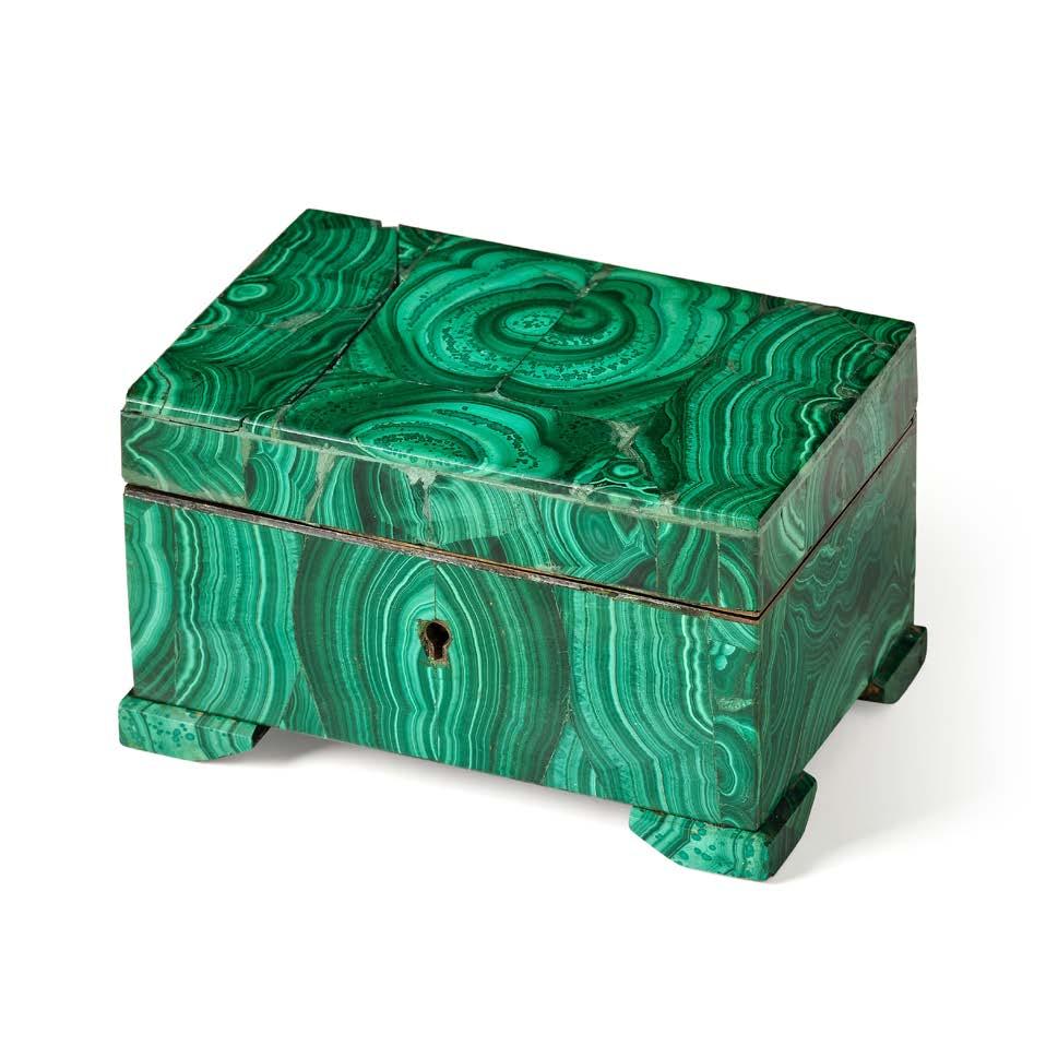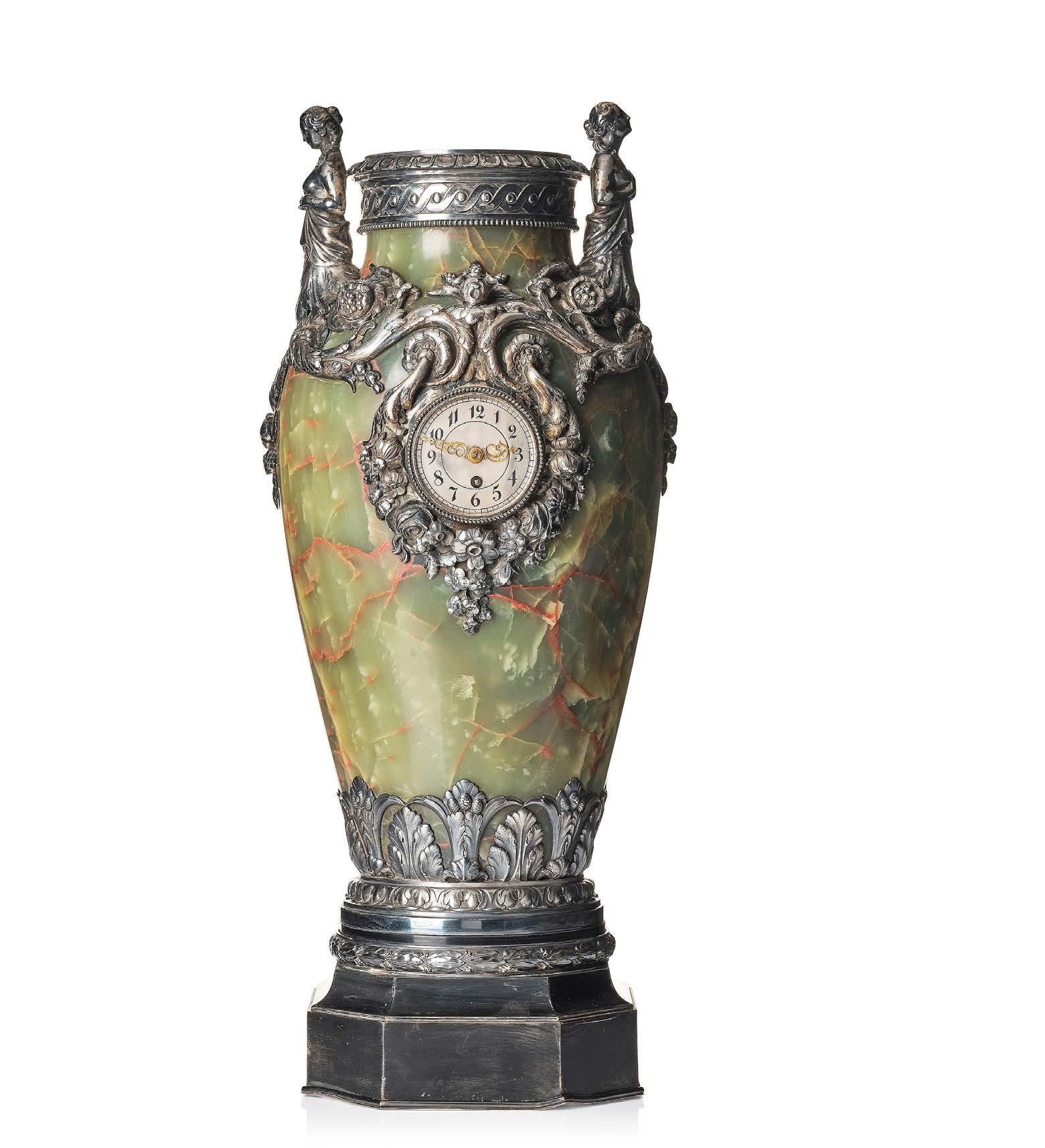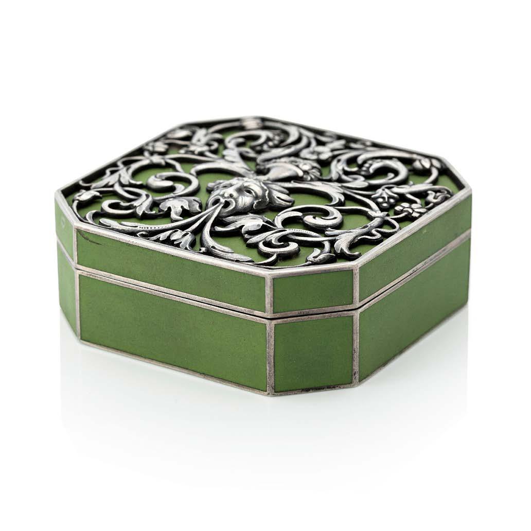 476.Dosa, silver och opak grön emalj, Bolin, Moskva 1912-1917. Exklusiv och sällsynt dosa med avfasade hörn. Silverlocket och sidorna täckt med mossgrön matt opak emalj. På locket applicerade silverornament med en vattensprutande maskaron. Senare stämplad W.A. Bolin Stockholm 1917. Mått 5,3 x 5,3 cm.